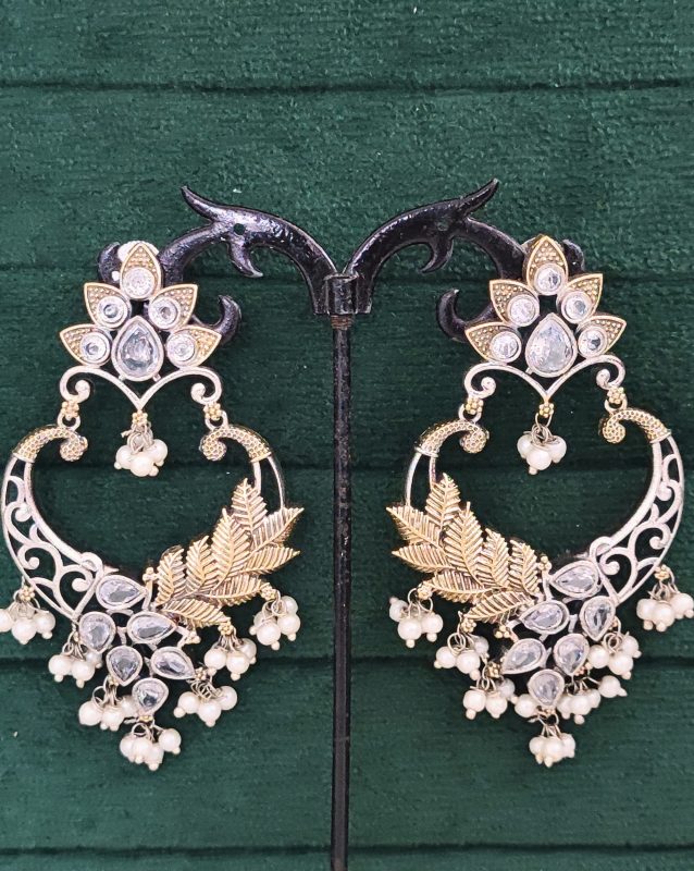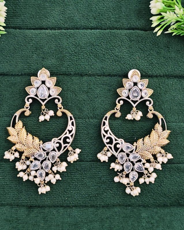 Antique Gold Plated Chandbali Earrings with Crystal Stones, Pearl Beads and Leaf Design, Traditional Indian Jewellery