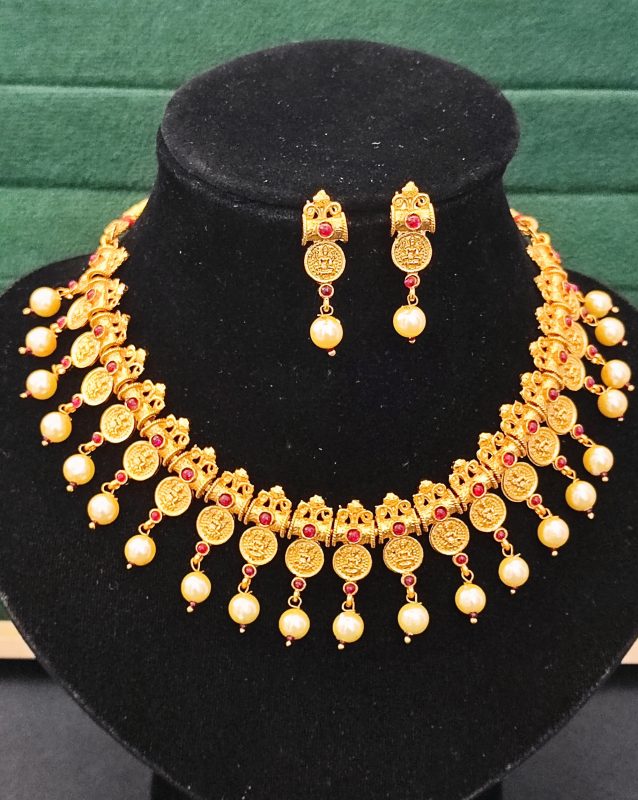 Antique Gold Coin Necklace Set with Ruby Stones & Pearl Drops – Traditional South Indian Jewellery
