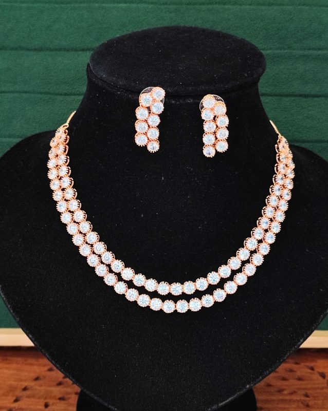 Rose Gold Double Line CZ Diamond Necklace with Earrings – Modern Glamour Jewelry for Evening & Bridal Wear