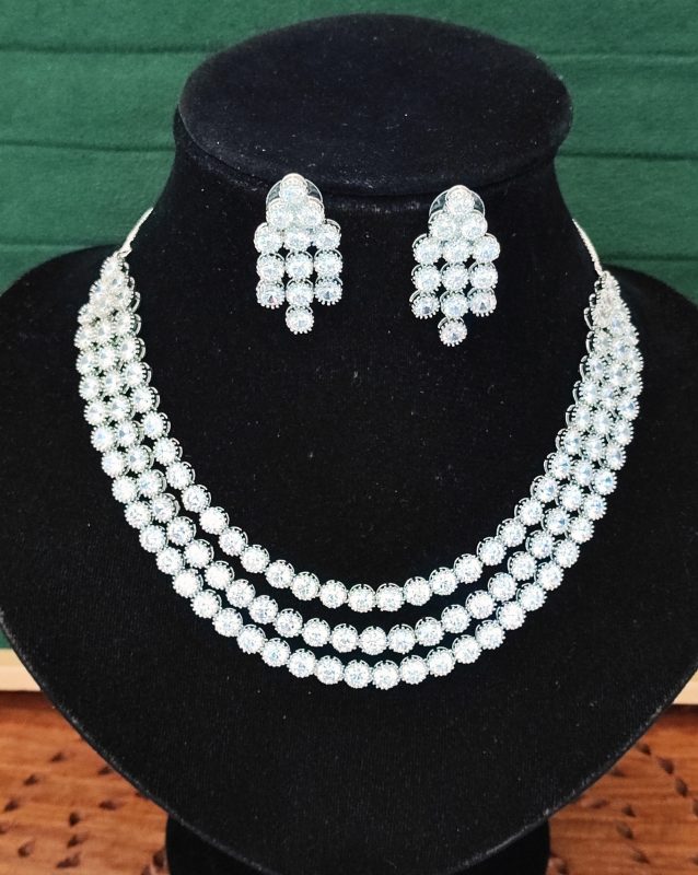 Rhodium Polish Double Line CZ Diamond Necklace Set with Earrings – Elegant Silver Shine for Parties & Weddings
