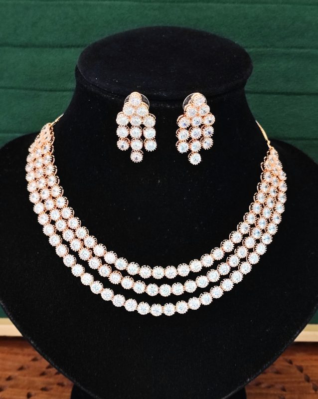 Rose Gold Finish White CZ Necklace Set, Sparkling Bridal Jewelry, 3-Layer Diamond Look