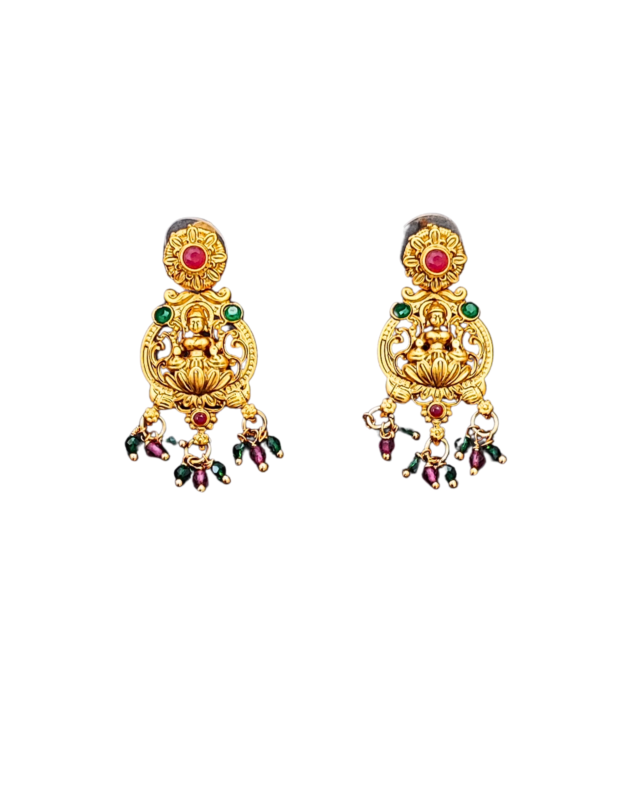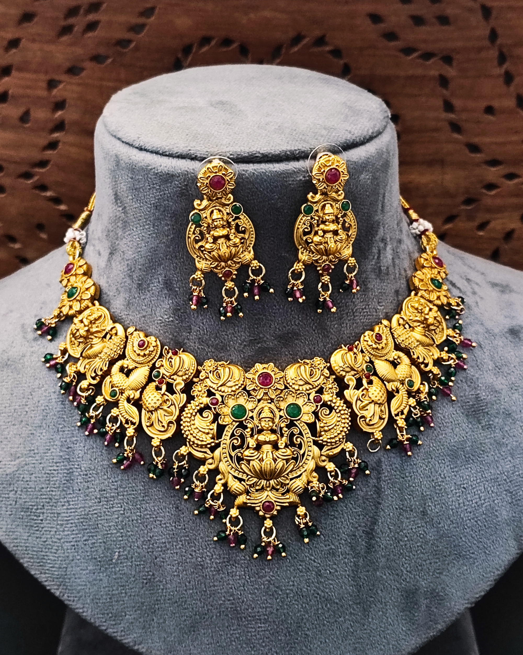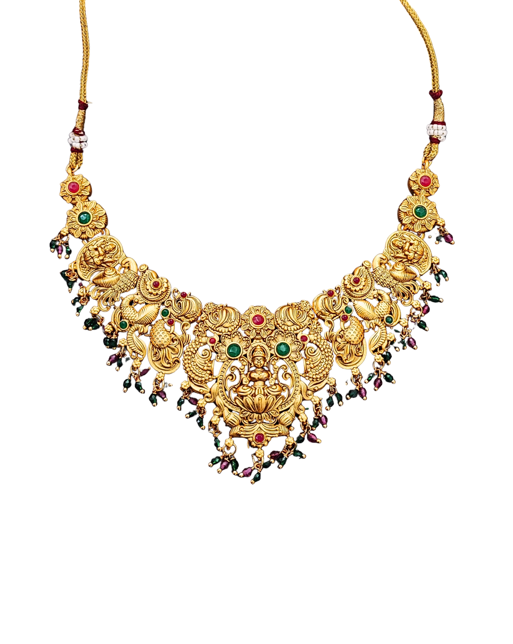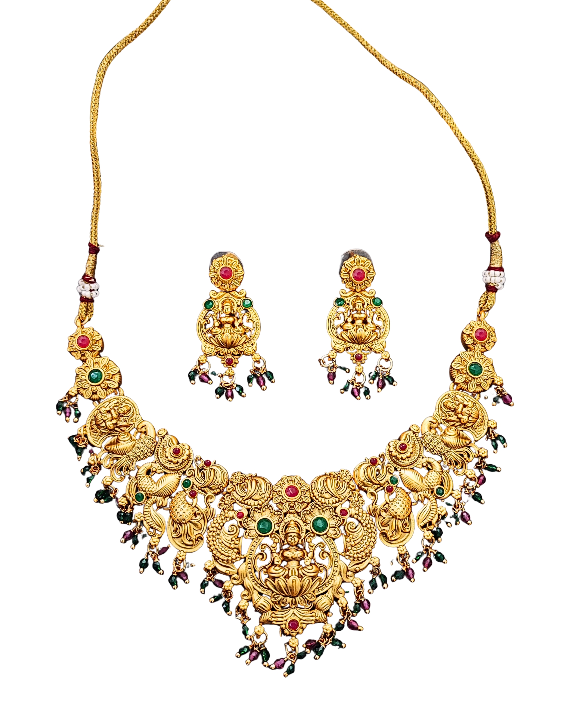 This stunning antique temple necklace set features an intricate Lakshmi and peacock motif, enhanced with ruby and emerald-toned stones and bead hangings. A perfect choice for weddings and festive occasions.