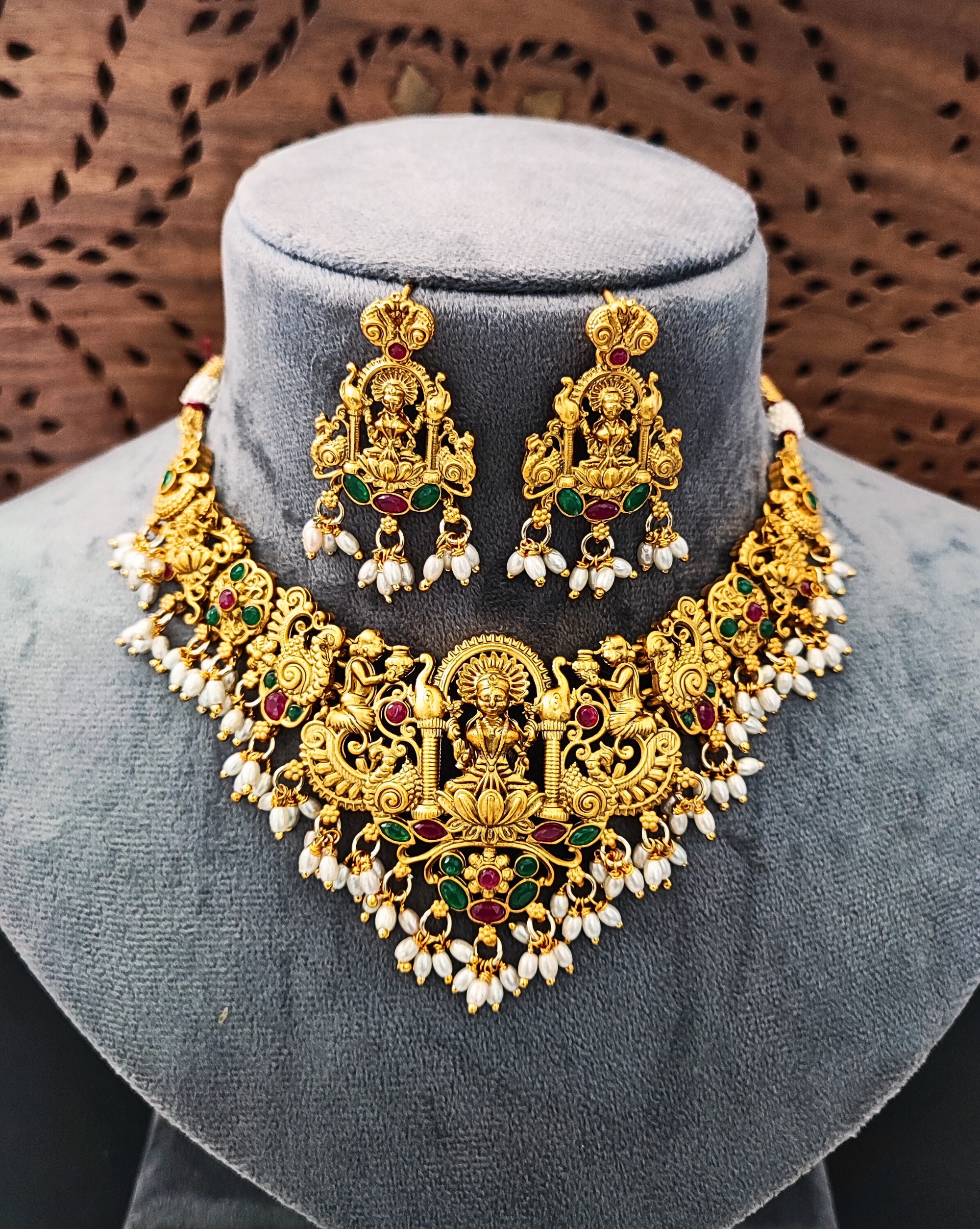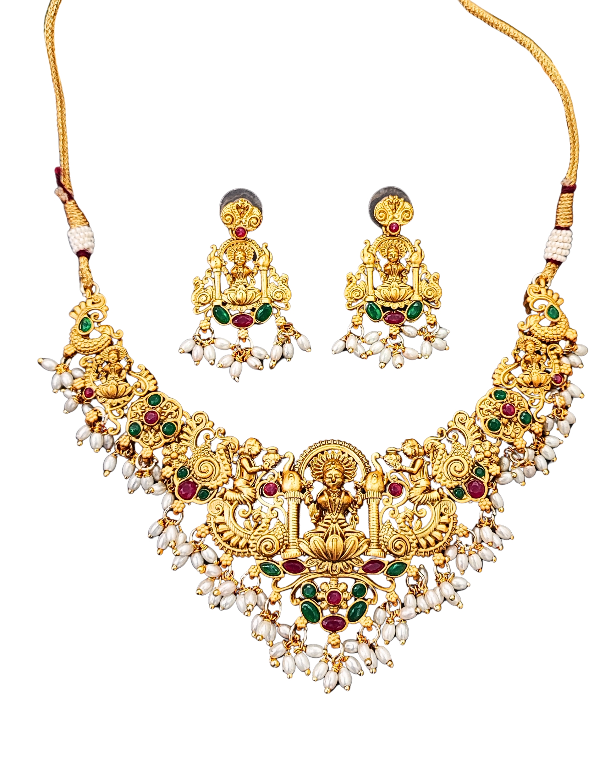 Antique Gold Temple Necklace Set with Laxmi Motif & Earrings – Bridal Jewellery for Women