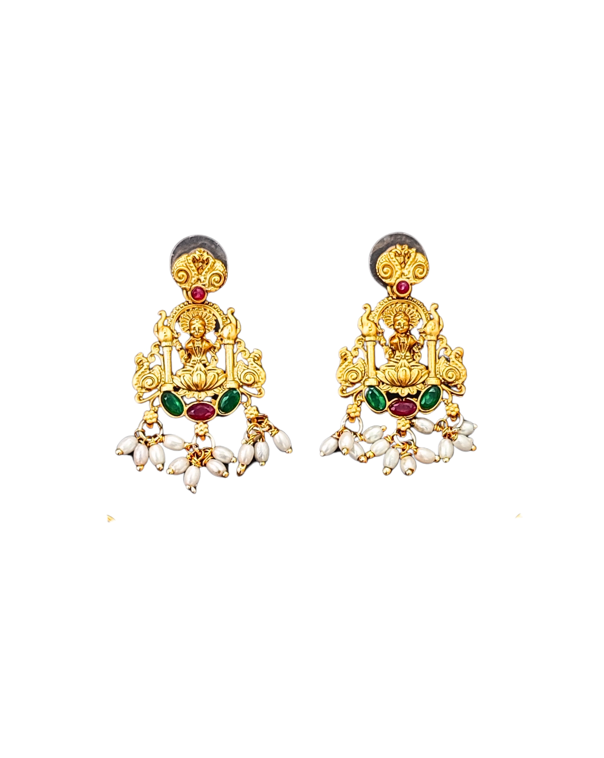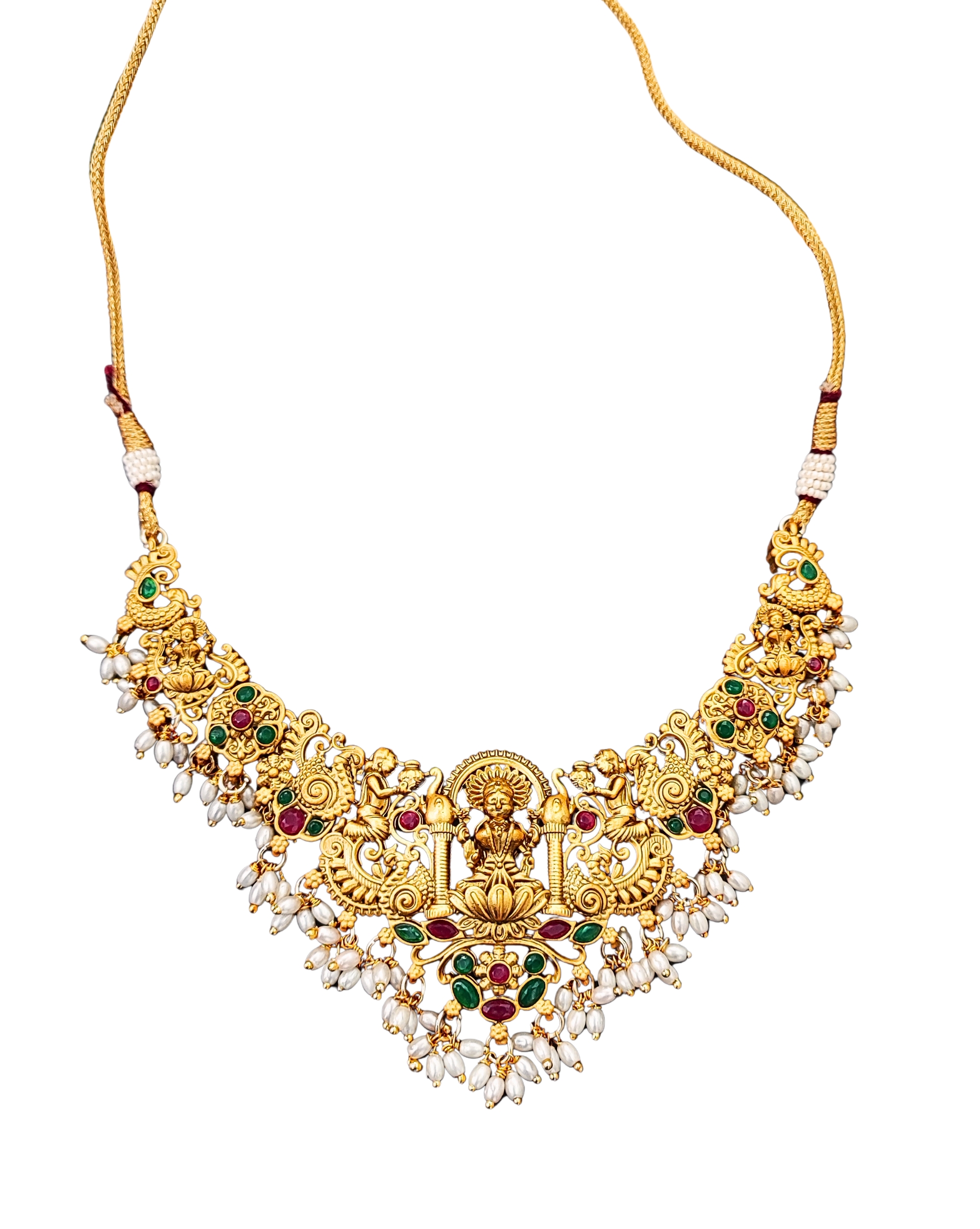 Celebrate tradition with this stunning antique gold-plated temple necklace set featuring Goddess Laxmi, intricate carvings, and pearl hangings. A perfect pick for bridal and festive ensembles.