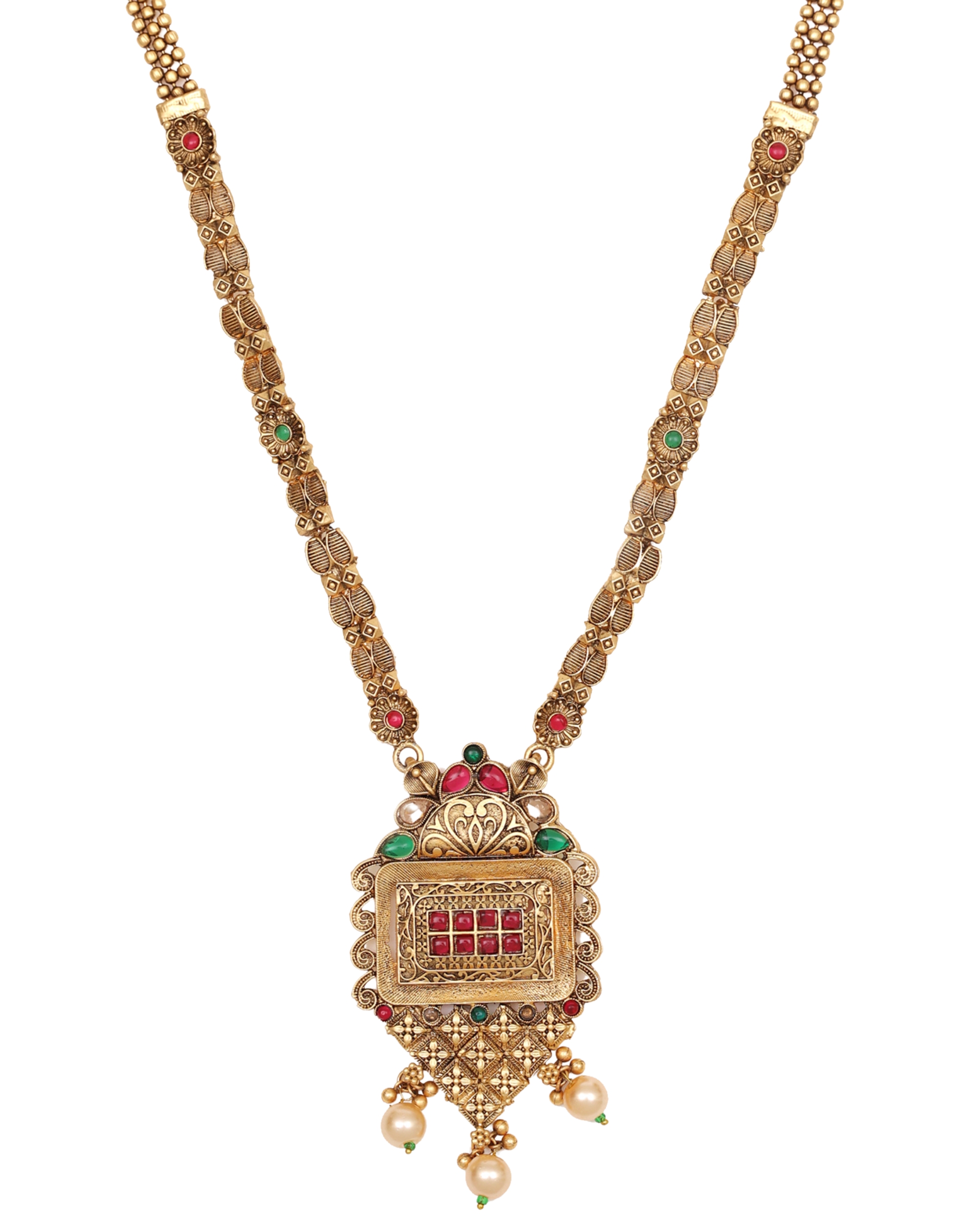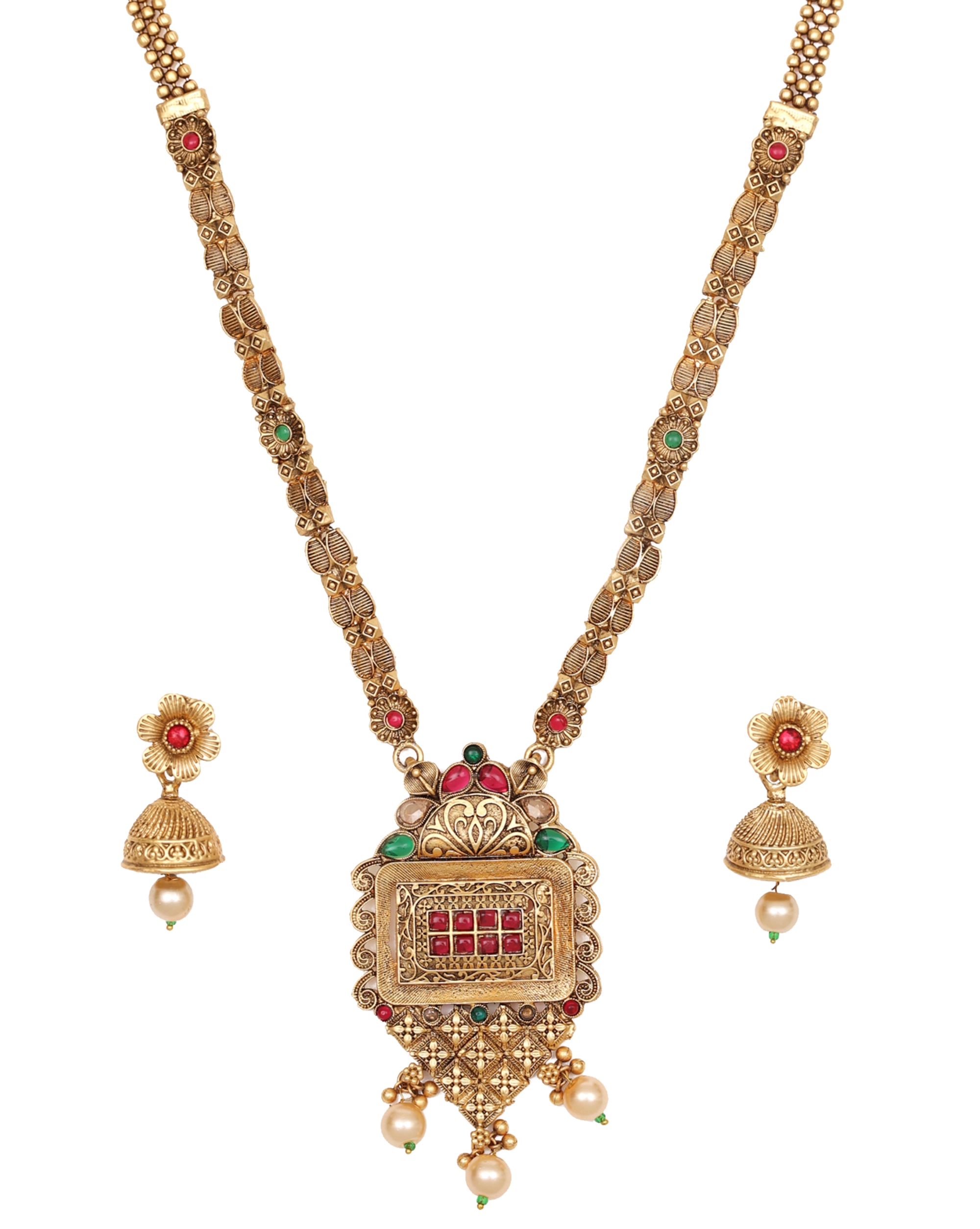 Exquisite temple jewellery set featuring intricate Lakshmi motif pendant with red and green stone embellishments. Large temple-style pendant with divine motif, decorated with precious stones and hanging pearl embellishments. Meticulously detailed gold-plated necklace with matching jhumka earrings adorned with pearl drops