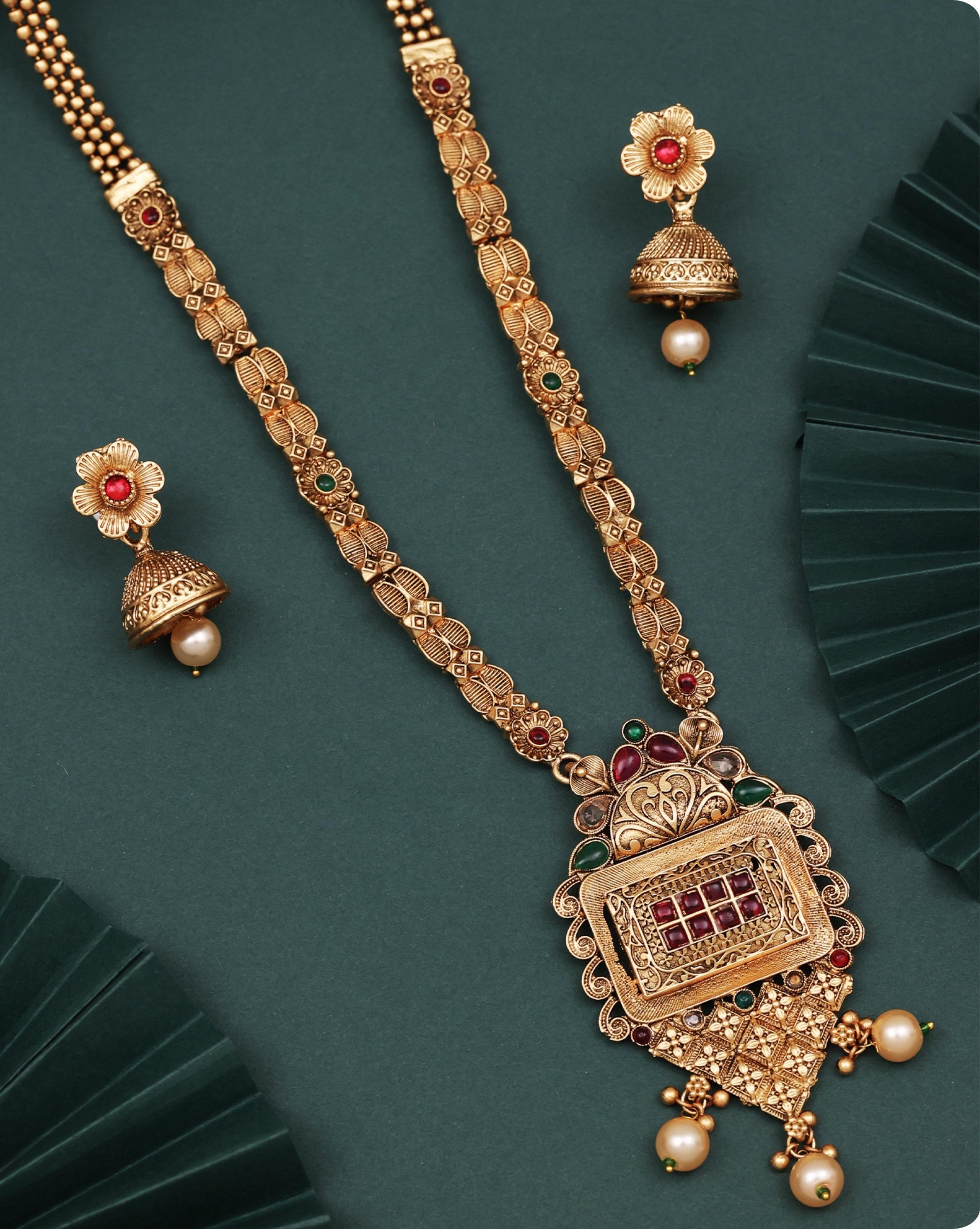 Be the first to review “Antique High Gold Long Necklace Set with Jhumka Earrings”