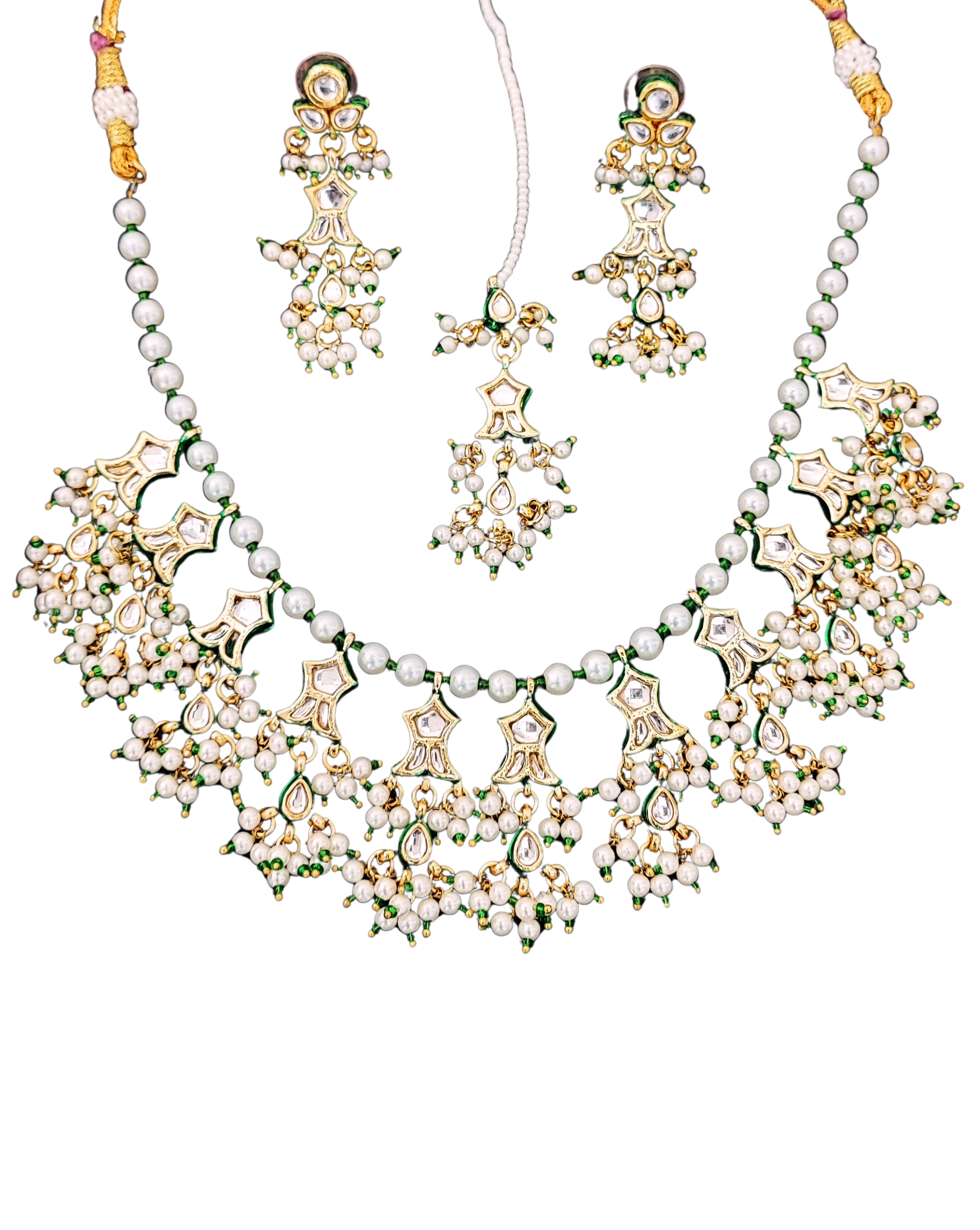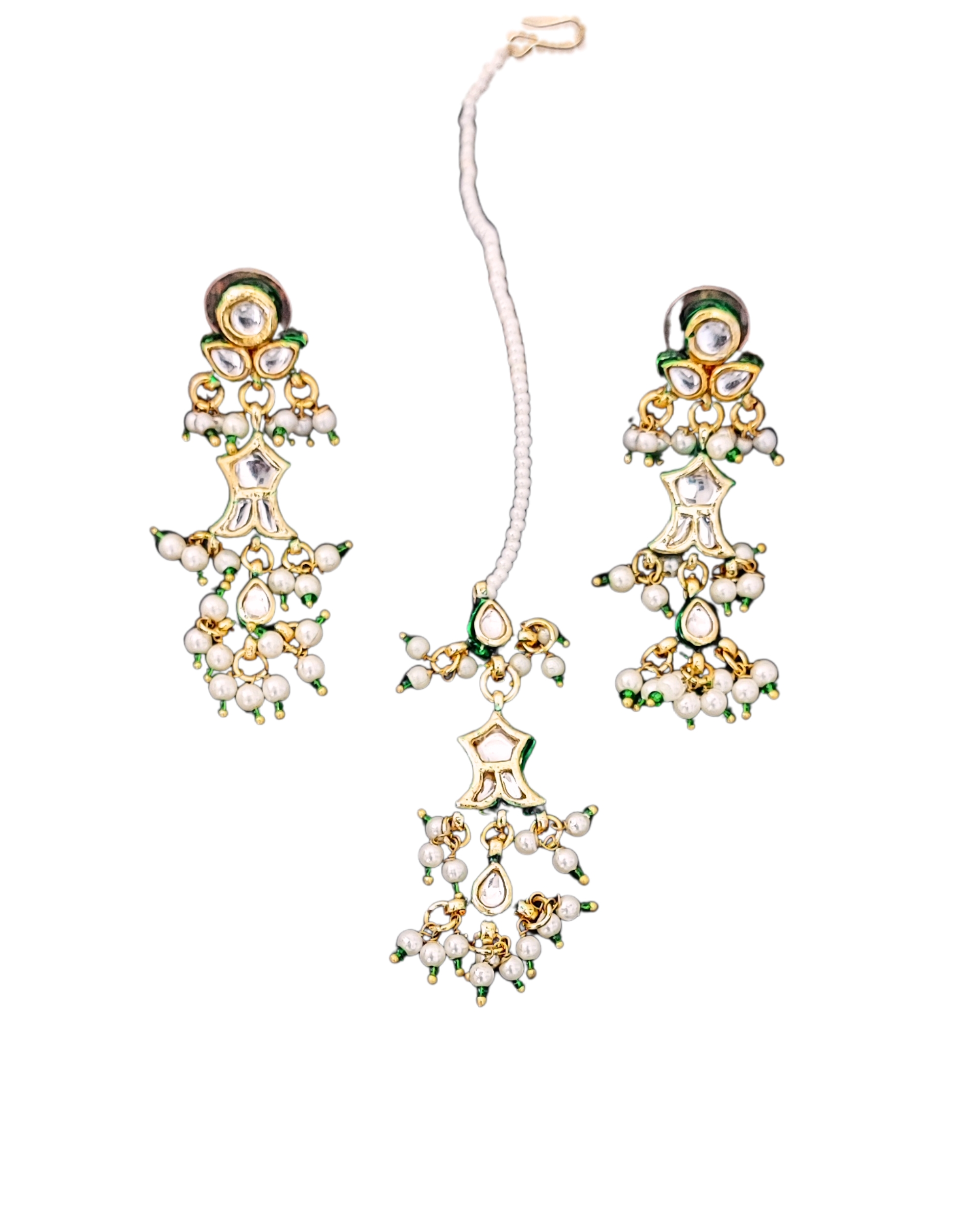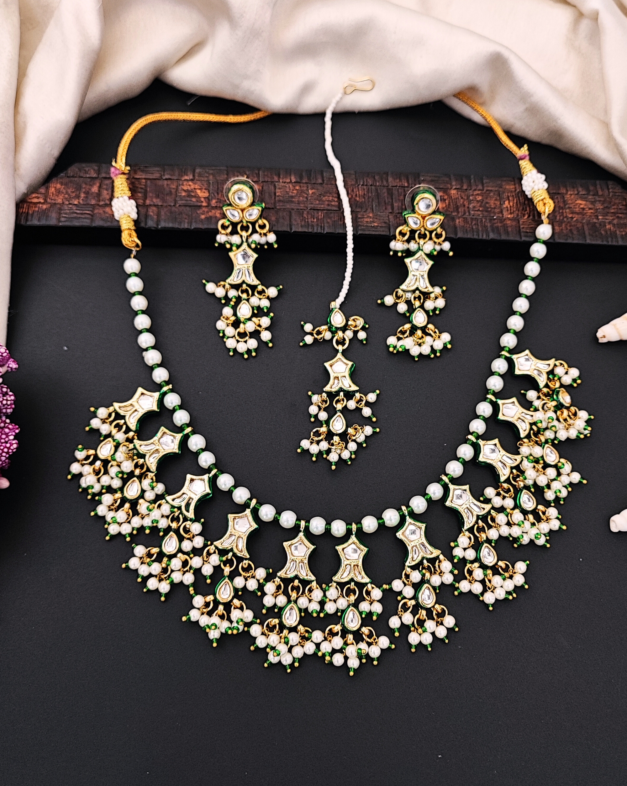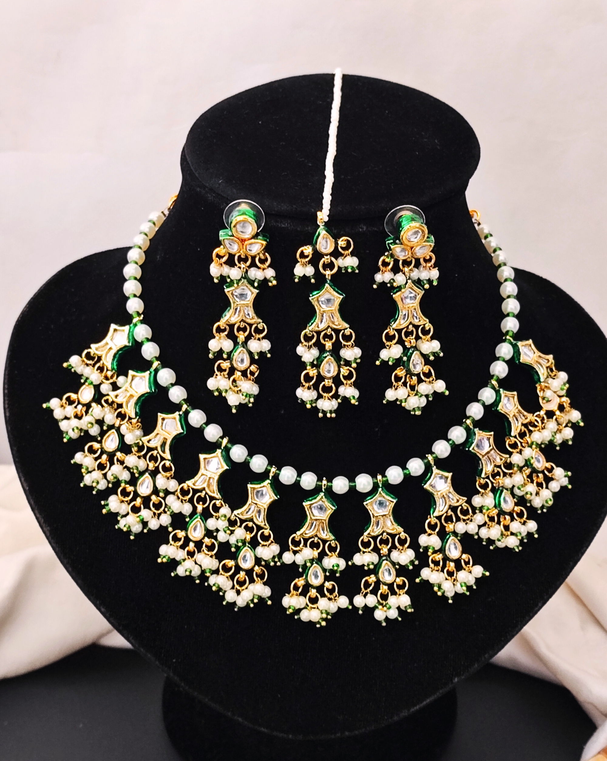 Beautiful Kundan Pearl and Green Pearls Necklace Set with Maang Tikka & Earrings