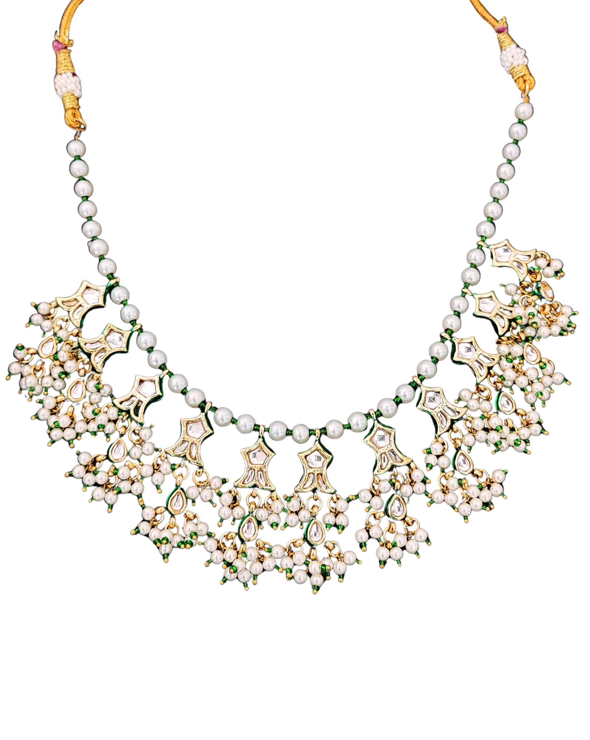 Elevate your ethnic look with this stunning traditional Kundan necklace set featuring a grand choker-style design embellished with lustrous white pearls and intricate gold-toned detailing. The set includes a matching pair of statement earrings and a maang tikka, making it a complete accessory ensemble for weddings, festivals, and special occasions. Each element reflects exquisite Indian craftsmanship with a rich blend of classic motifs and delicate green enamel accents, perfect for bridal wear or festive celebrations.