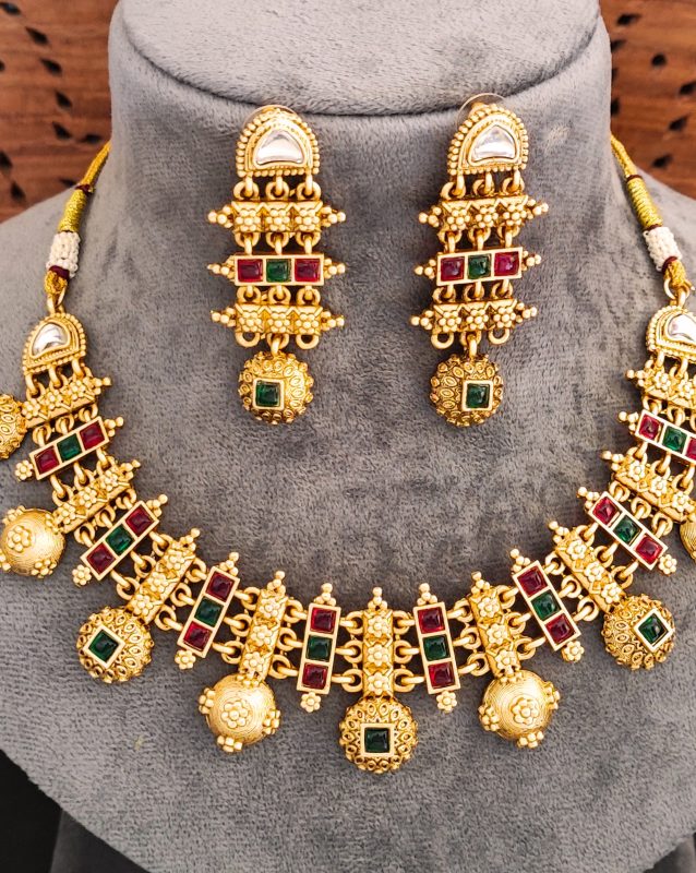 Temple Jewellery Rajwadi Polish Short Necklace Set with Fancy Design, Red & Green Stones, and Jhumka Earrings.