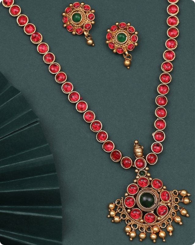 Traditional Indian Red Stone Necklace and Earrings Jewellery Set with Green Centre Stone