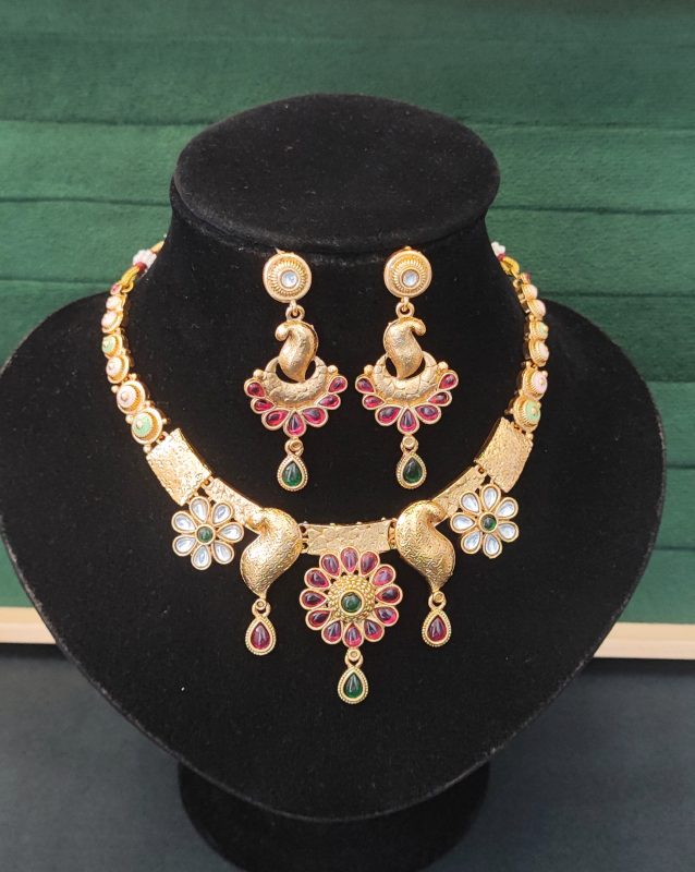 Peacock Inspired Ethnic Necklace Set with Floral and Stone Detailing