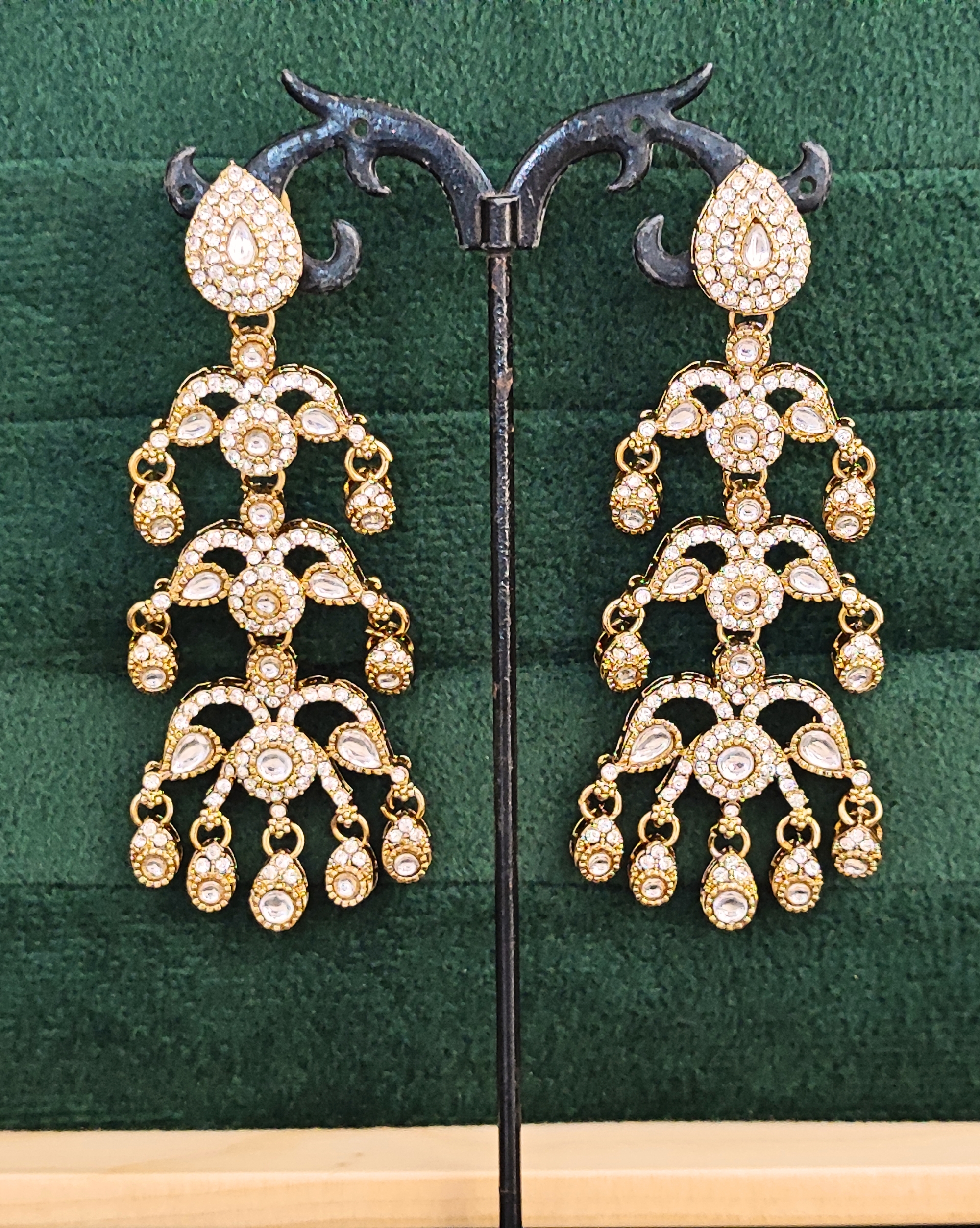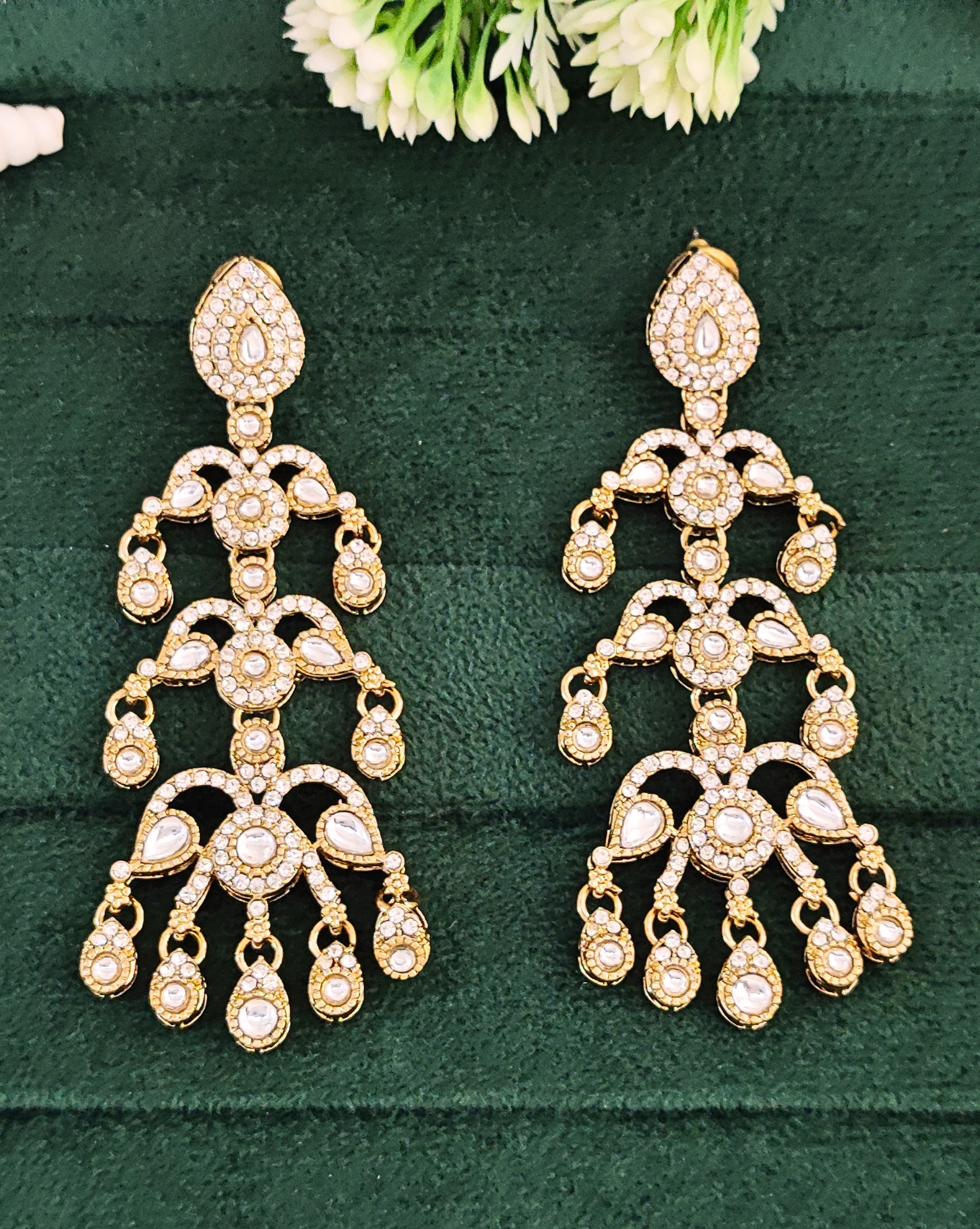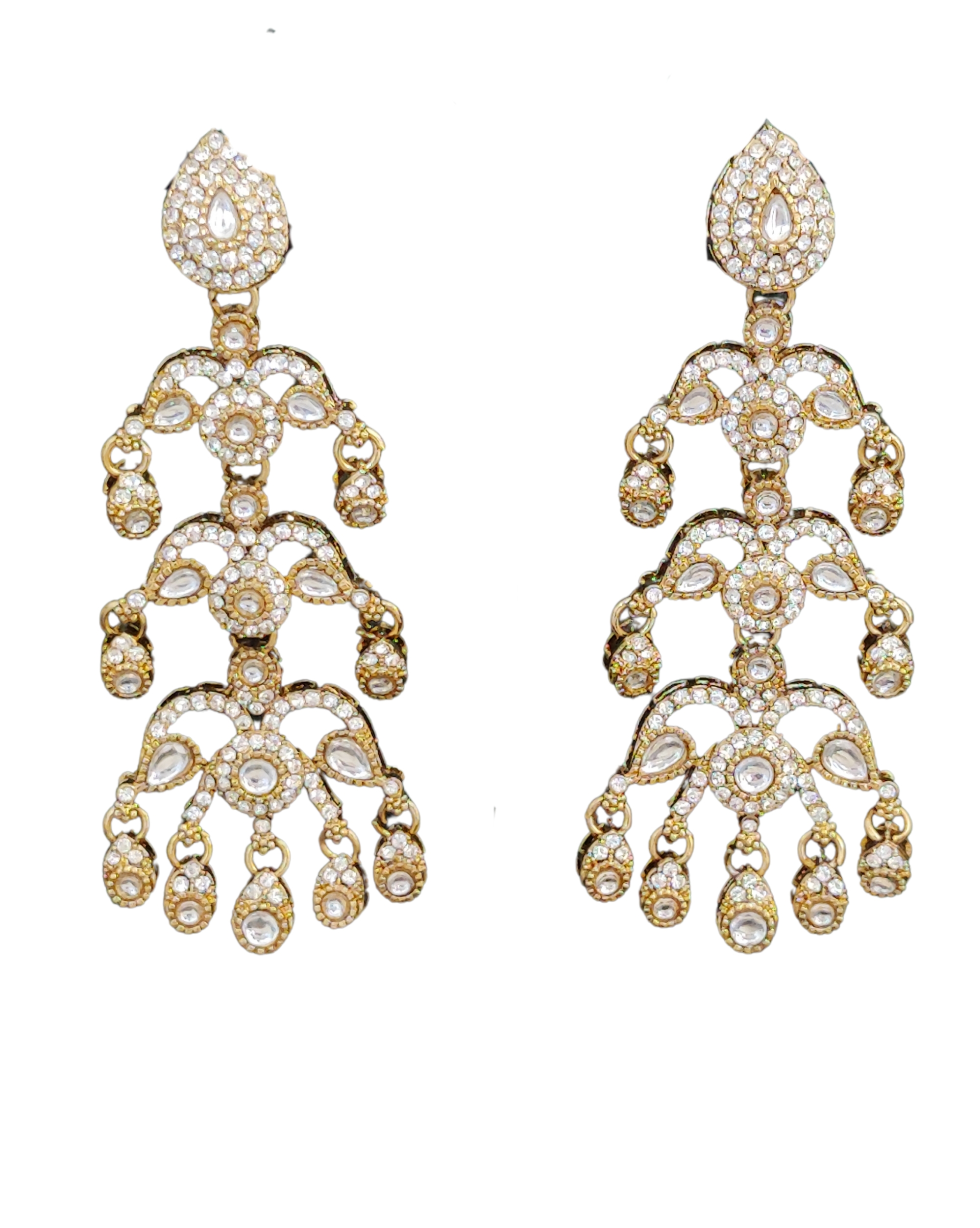 Make a stunning statement with these exquisite chandelier earrings that showcase the finest in traditional Indian craftsmanship. The intricate three-tiered design features brilliant crystal stones set in a luxurious gold-plated finish, creating a cascading effect that catches and reflects light beautifully. Each earring displays an elegant arrangement of teardrop and round crystals, meticulously placed in ornate floral-inspired patterns. The sophisticated combination of clear stones and golden metalwork makes these earrings versatile enough for both festive occasions and formal events. These showstopping pieces measure approximately 7.5 centimetres in length, offering just the right amount of drama while maintaining a balanced, wearable proportion. The lightweight construction ensures comfort during extended wear, while the secure fastening keeps these precious pieces safely in place. Perfect for adding a touch of royal elegance to your ethnic wear or bringing glamour to a contemporary ensemble.