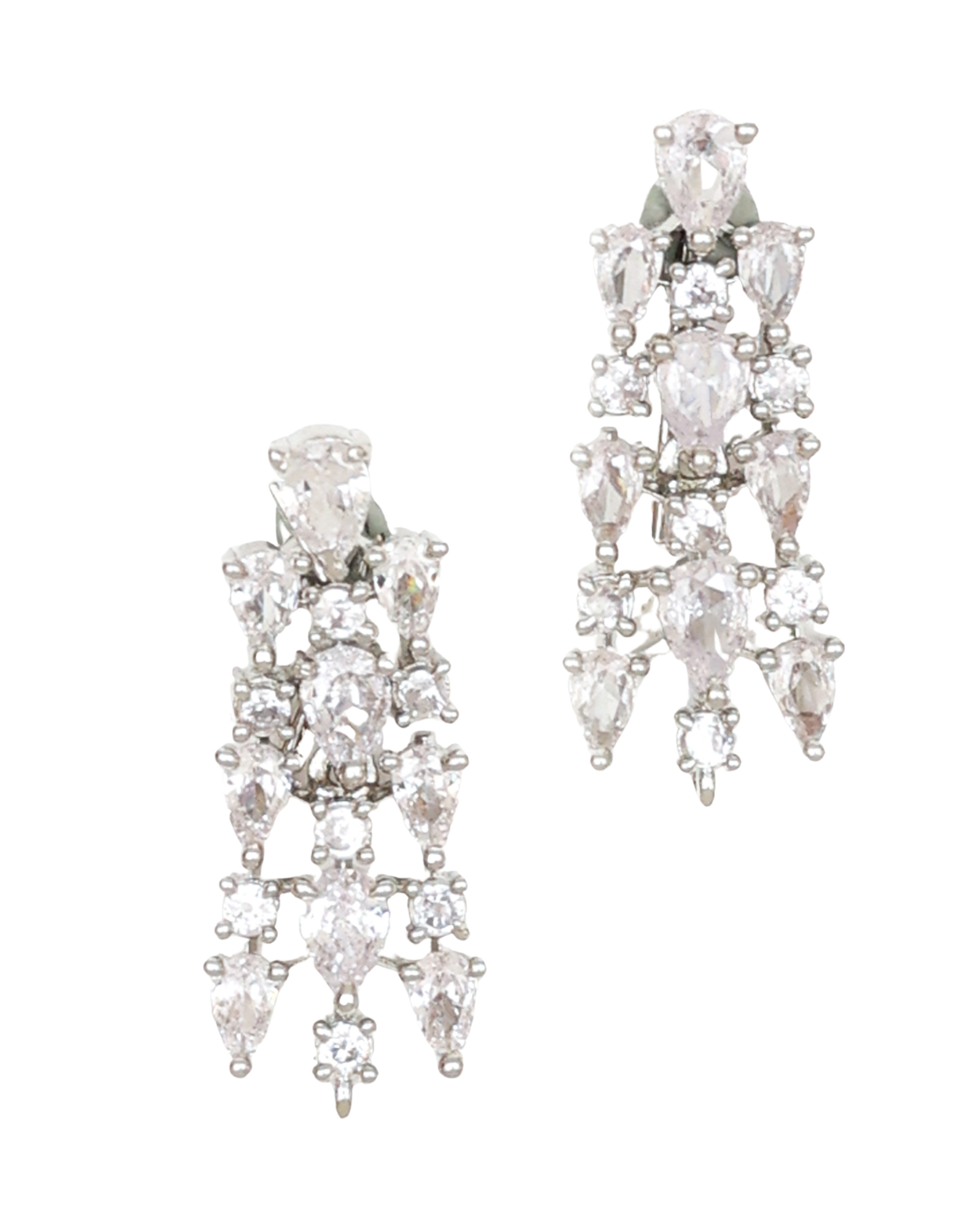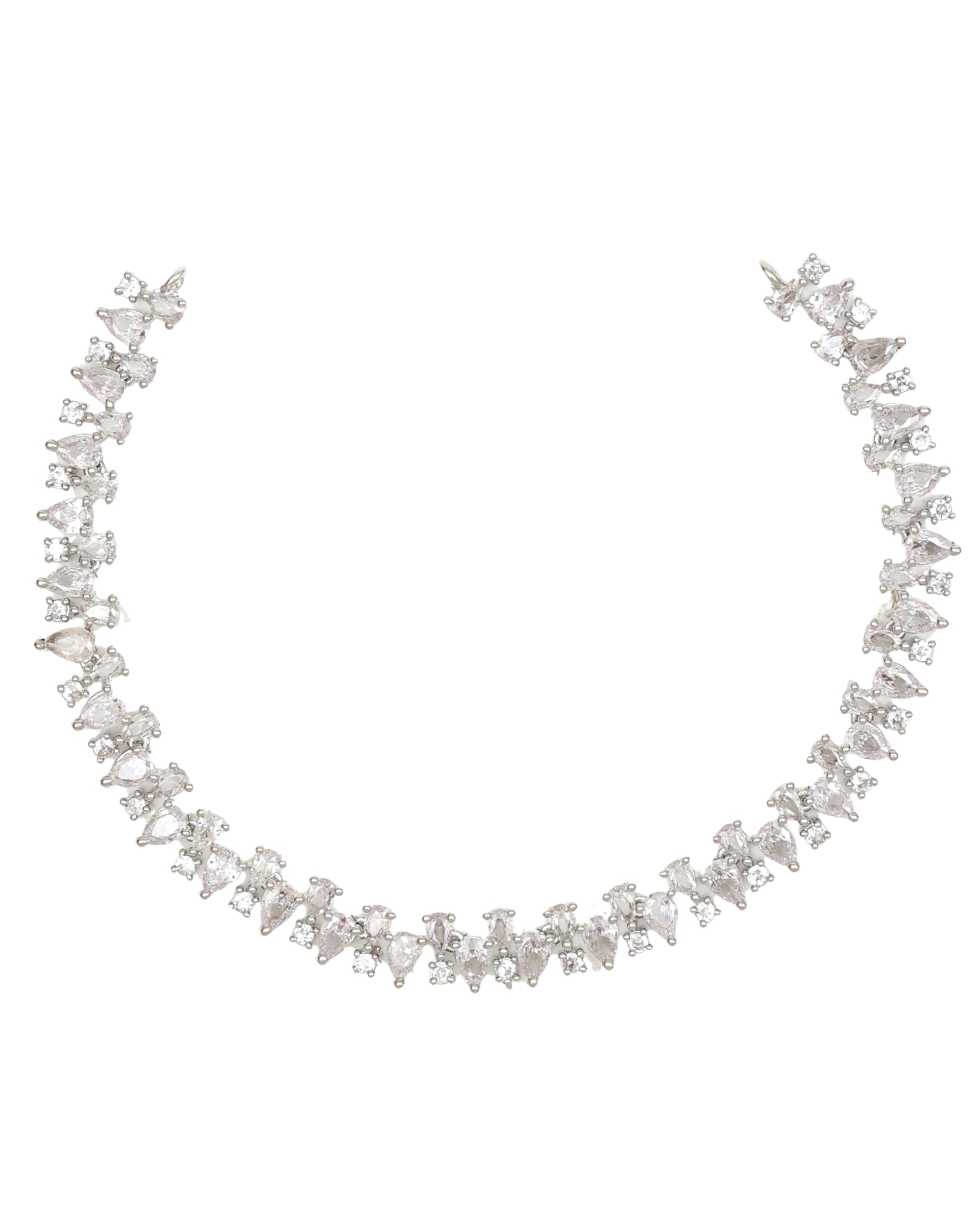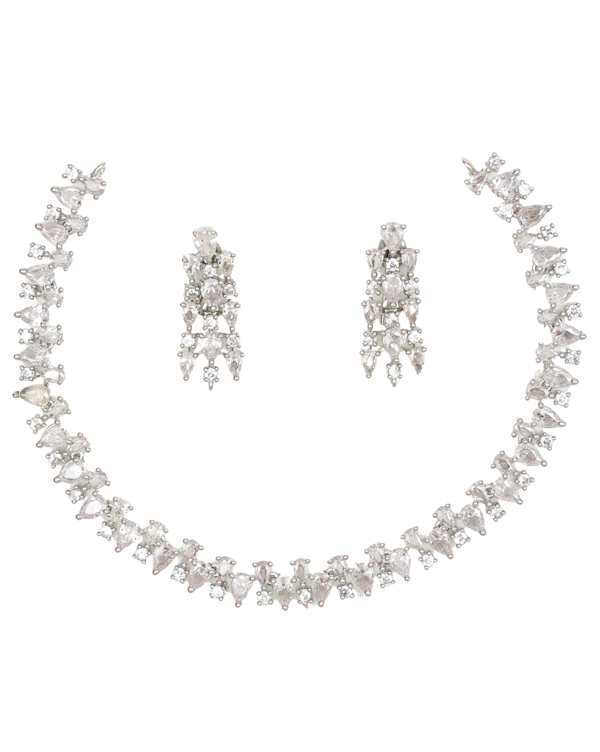 Stunning CZ necklace and earring set featuring intricate arrangement of teardrop and round-cut stones in Rhodium-toned setting. Graceful curved design with alternating teardrop and round stones creates a sophisticated collar-style statement piece. Perfect accessory for weddings, formal events, or special occasions, adding glamour to any evening ensemble