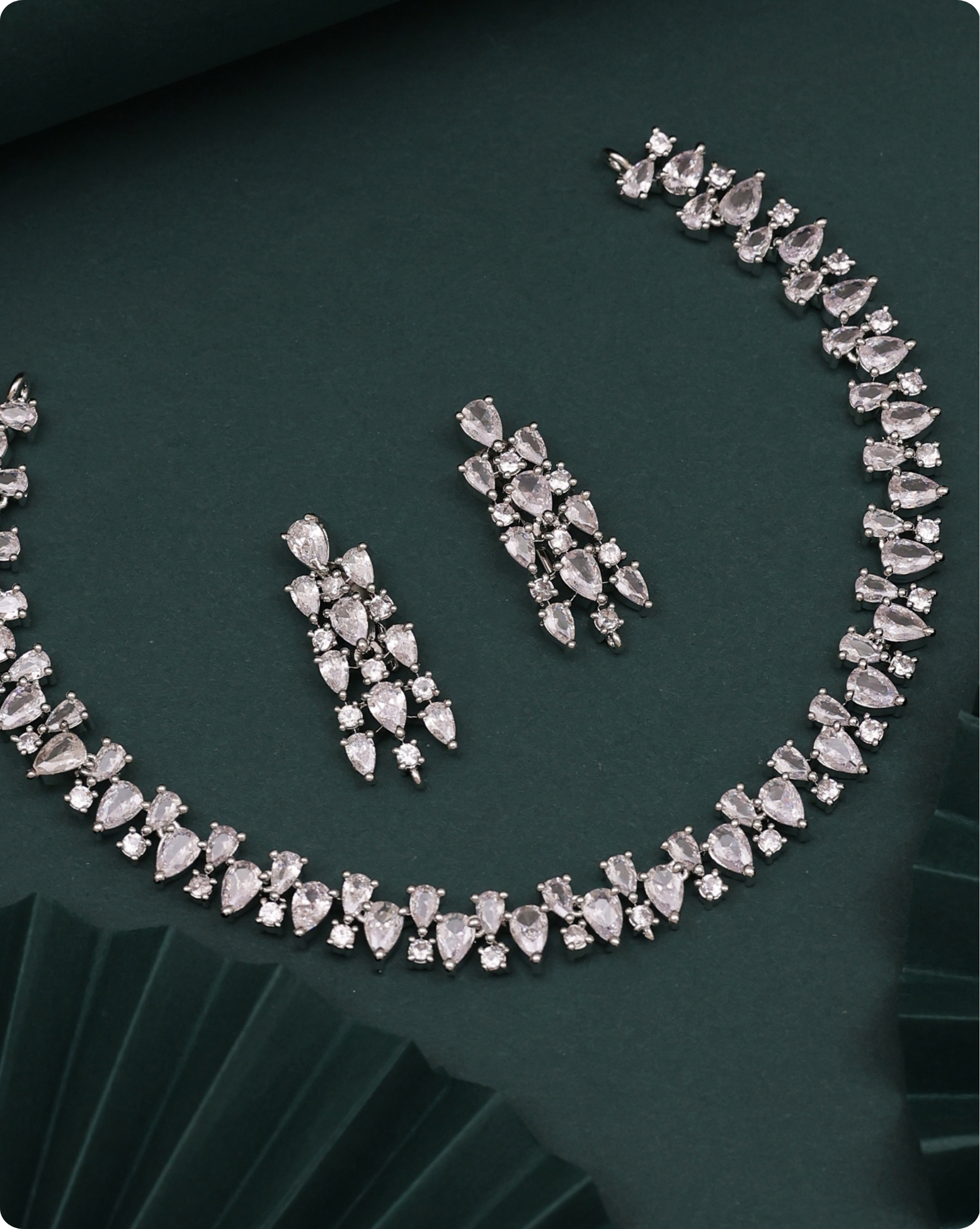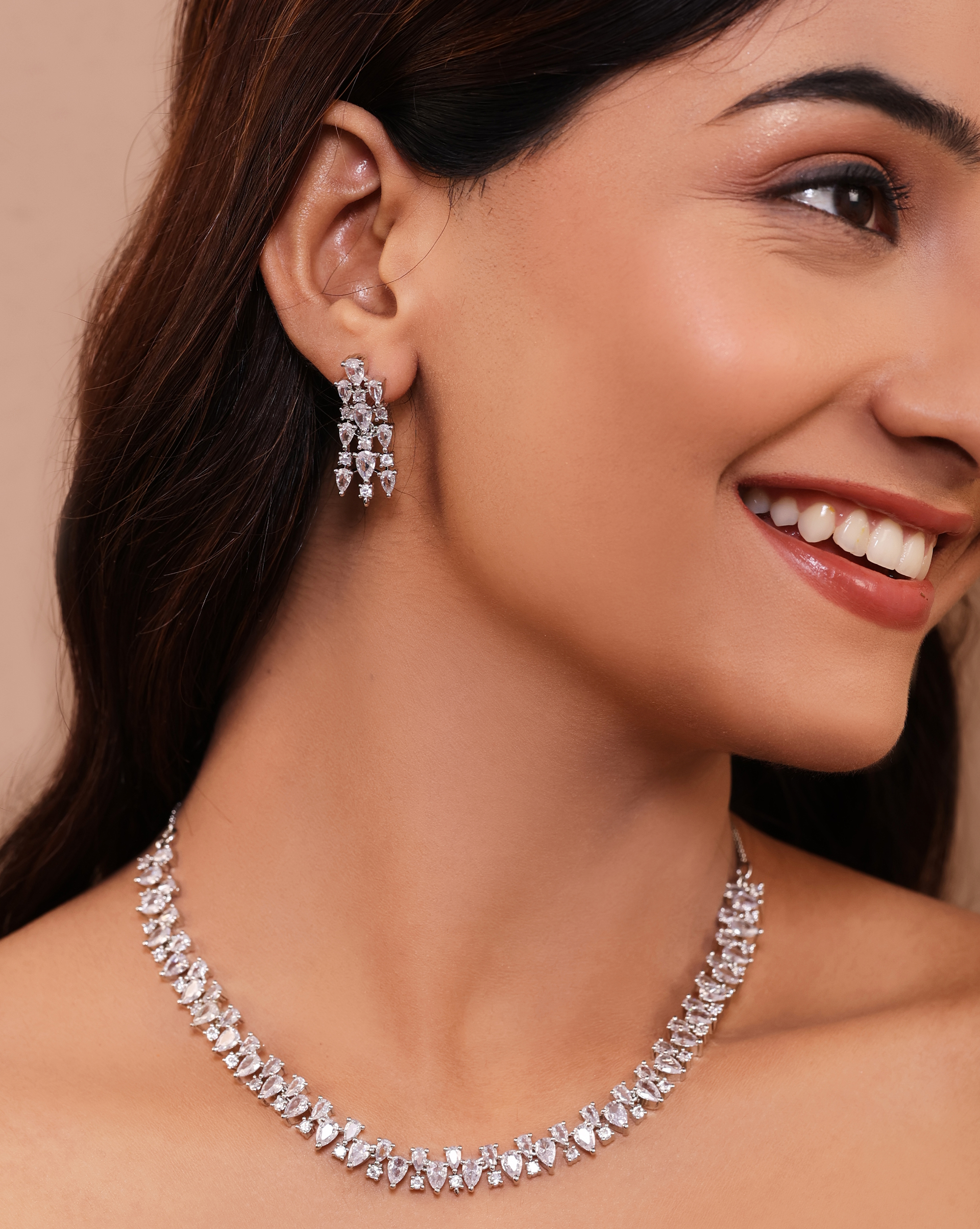 CZ Diamond Jewellery Rhodium Plated Necklace Set for Women and Girls
