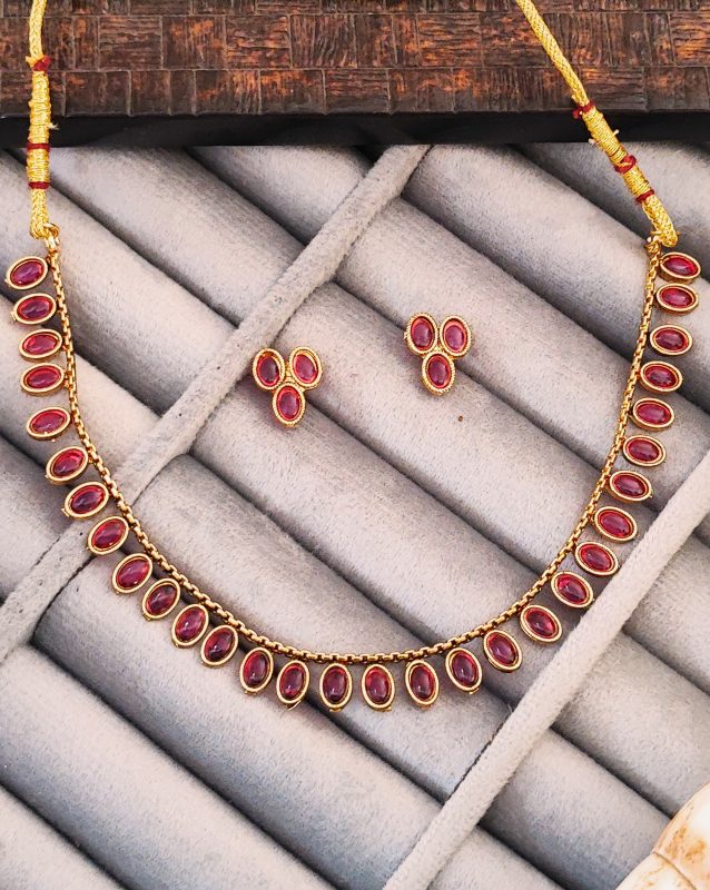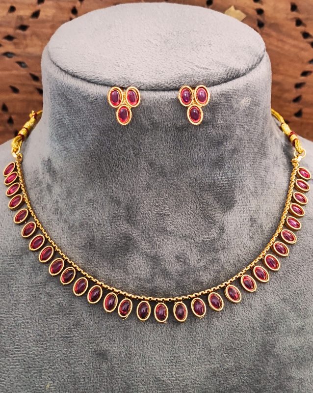 Traditional Gold-Plated Necklace Set with Ruby Red Stones, Oval Design, Matching Earrings