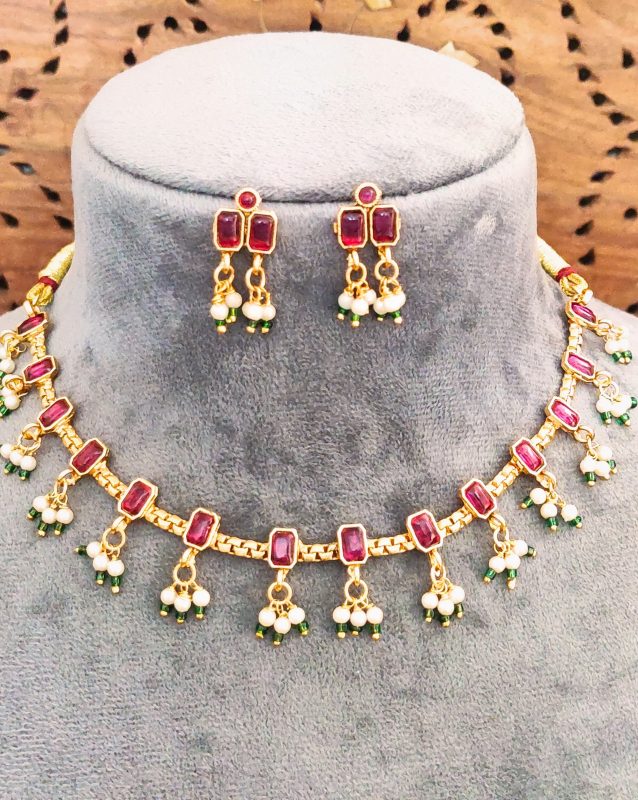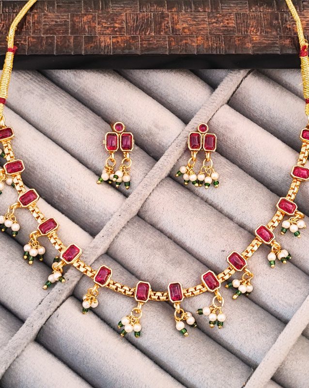 Traditional Gold-Plated Necklace Set with Ruby Red Stones, Pearl Drops, Green Beads and Matching Earrings