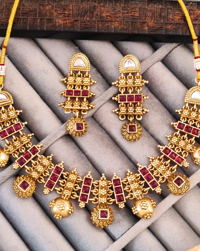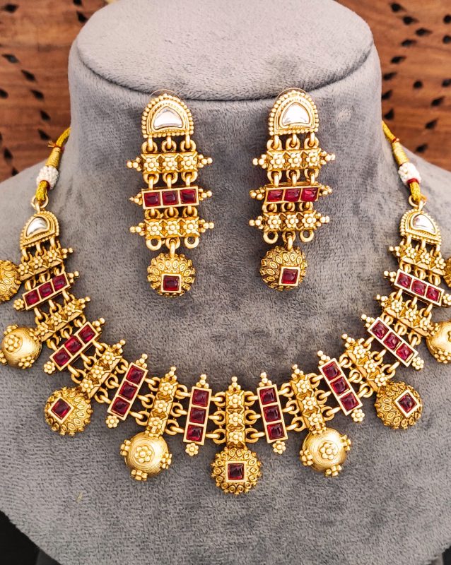 Traditional Gold-Plated Necklace and Earrings Set with Red Stones, Antique Design, Wedding Jewellery