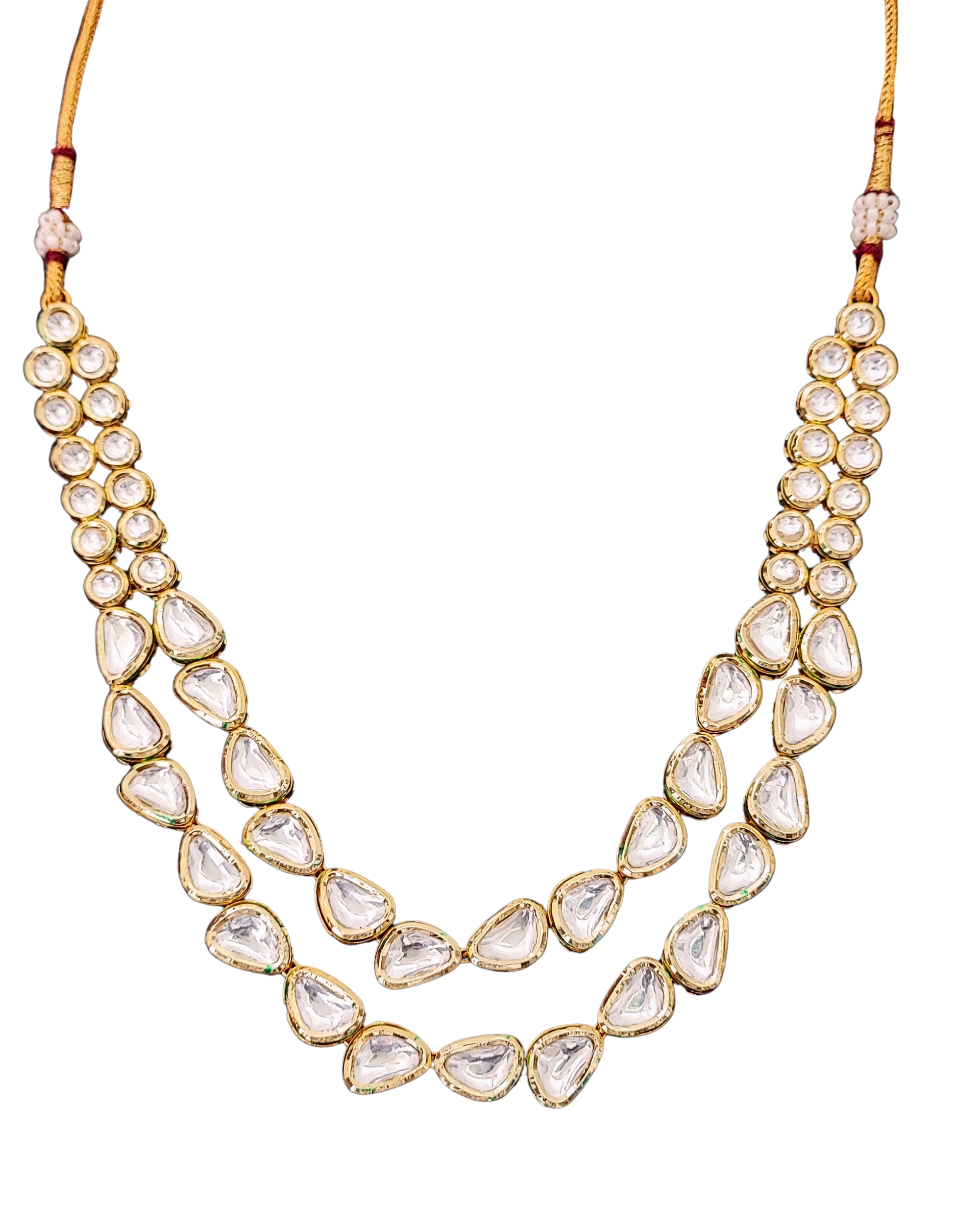 Make a grand impression with this exquisite double-layer Polki Kundan necklace set, featuring two rows of dazzling teardrop-shaped stones set in a rich gold-tone base. The design is complemented by a striking pair of matching earrings, creating a perfect balance of elegance and tradition.