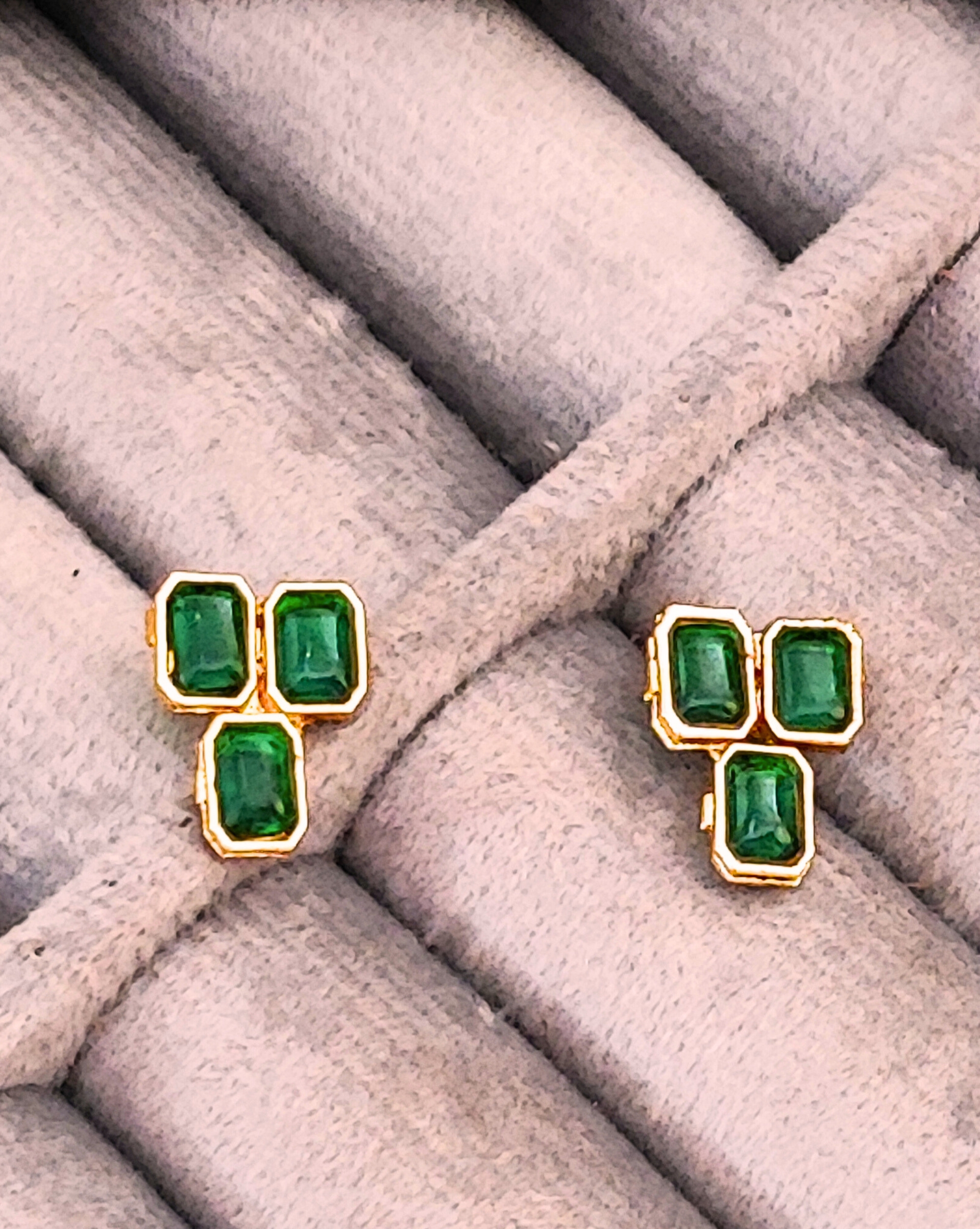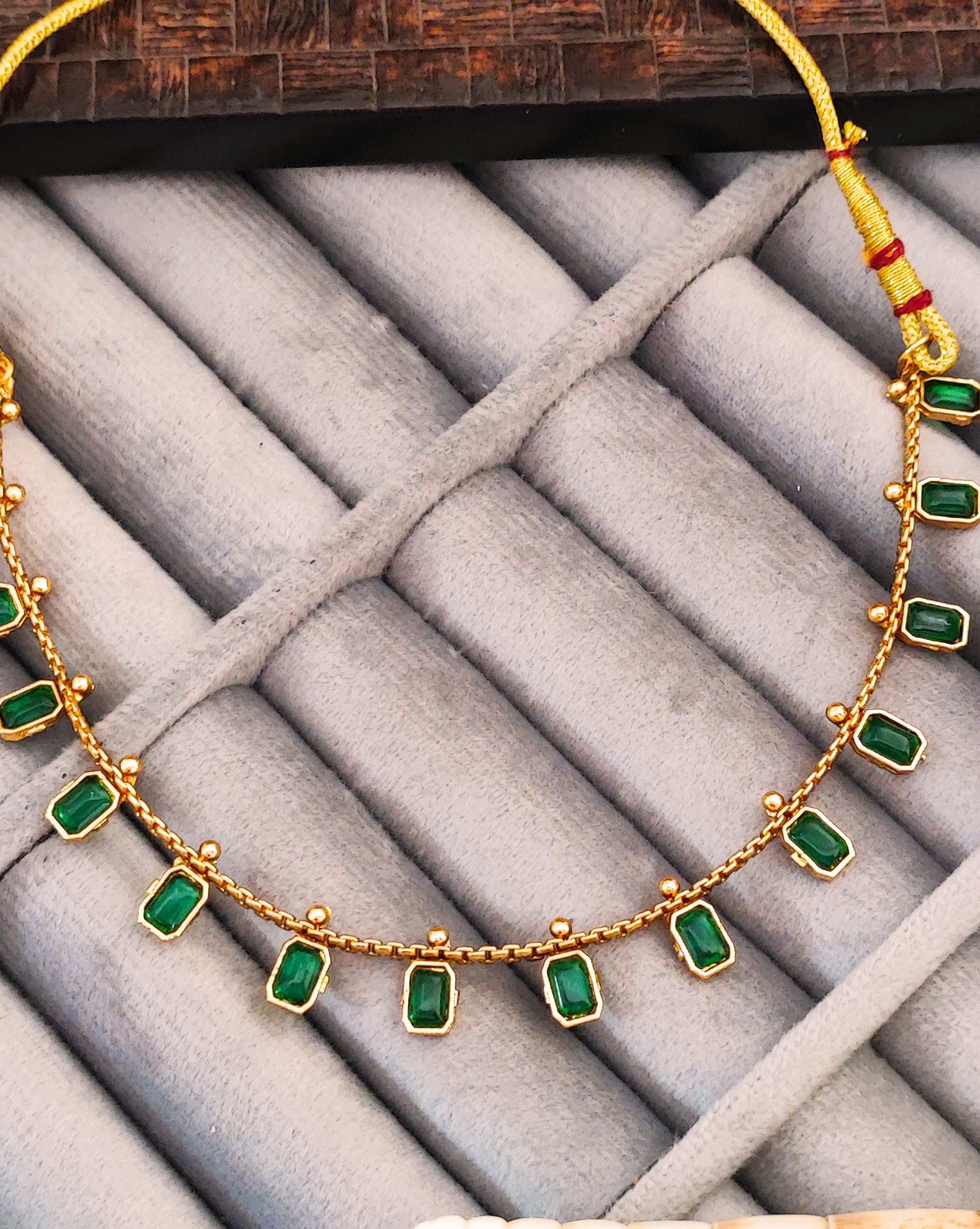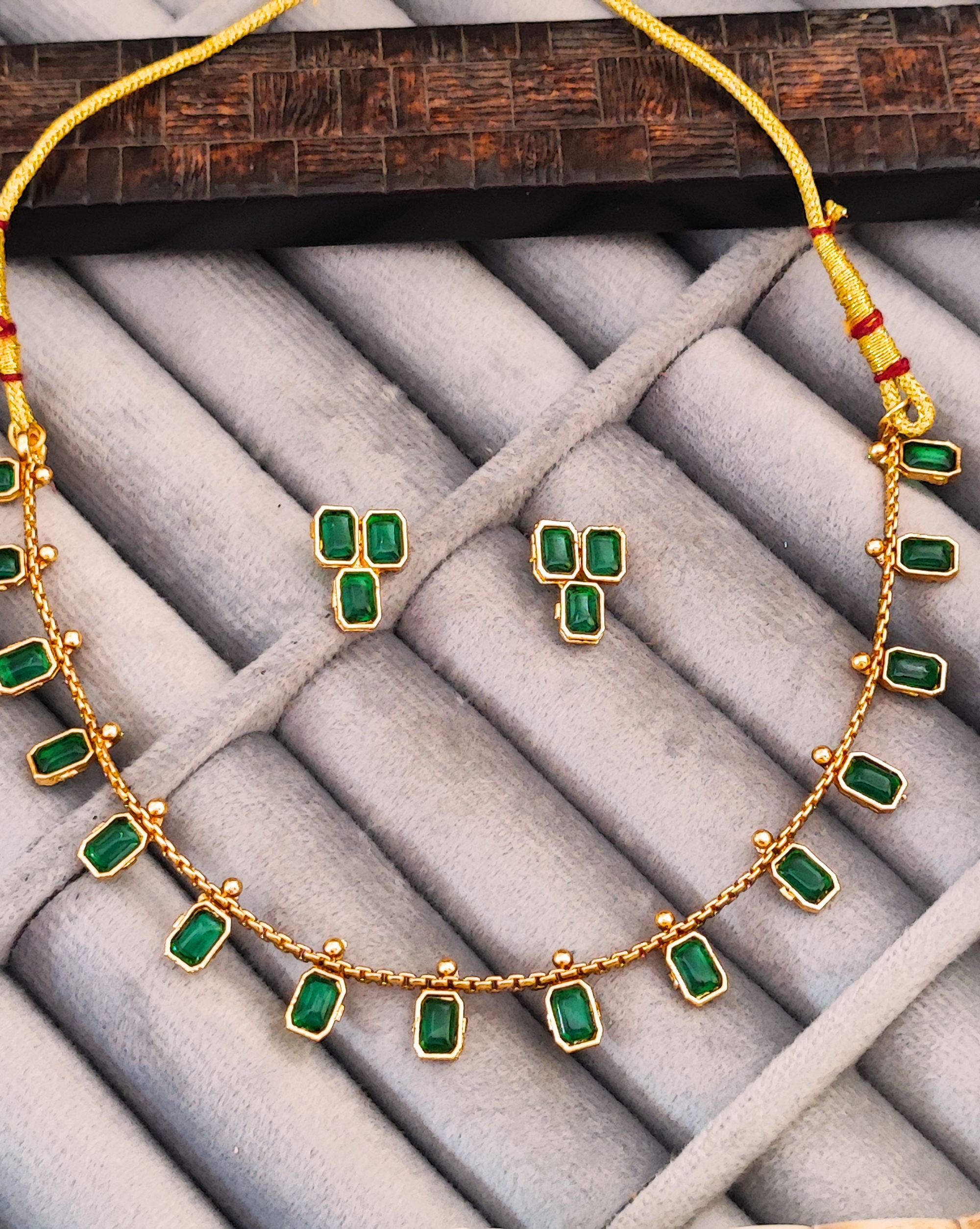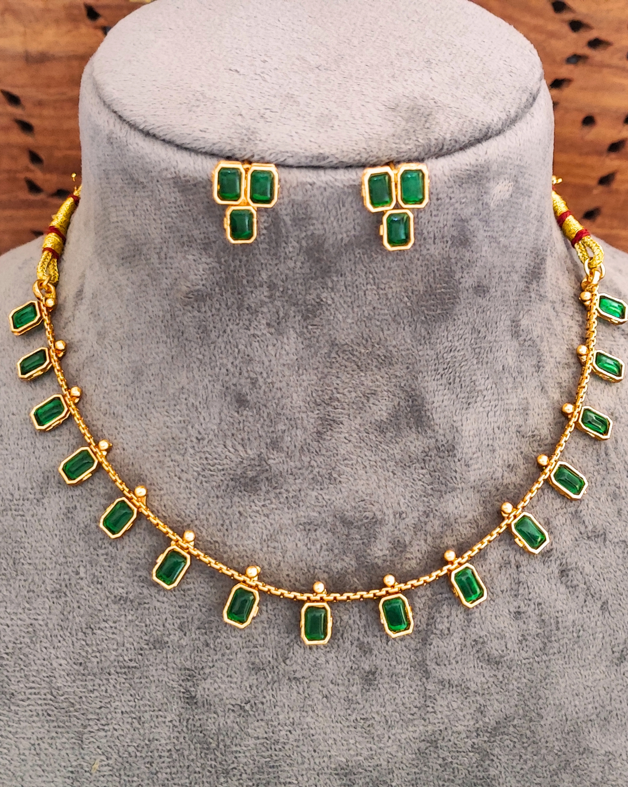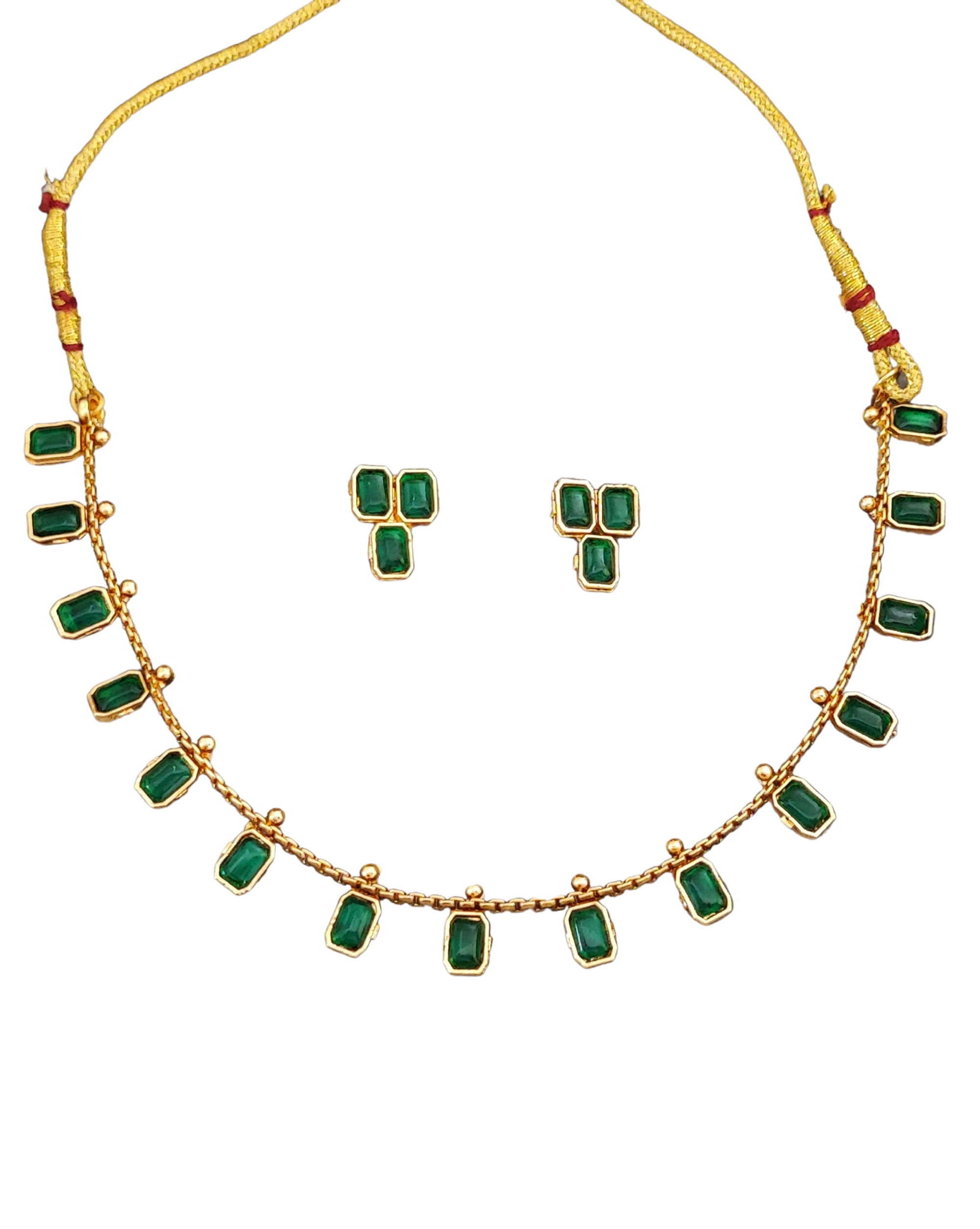 Elevate your traditional ensemble with this exquisite emerald and gold jewellery set. The necklace features a stunning arrangement of rectangular emerald-green stones delicately set in gold, creating a graceful cascade around the neckline. Each stone is meticulously placed in a harmonious pattern, complemented by small golden accents between the emeralds. The matching earrings showcase a distinctive triangular cluster of three emerald stones each, perfectly balancing the necklace’s design. The set combines classic Indian craftsmanship with contemporary styling, making it versatile enough for both festive occasions and formal events. The rich green hues of the stones contrast beautifully with the warm golden tones, while the traditional thread work with red accents adds an authentic touch to the necklace. This timeless piece is ideal for pairing with traditional Indian attire or adding a touch of elegance to modern outfits.