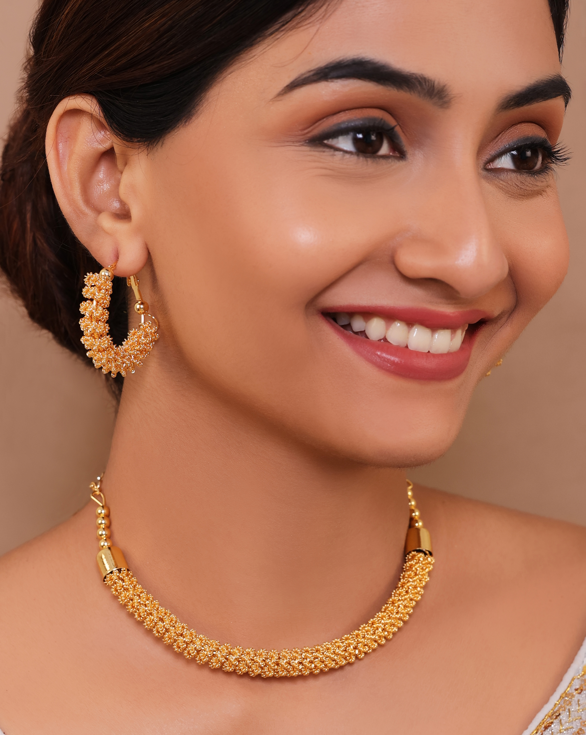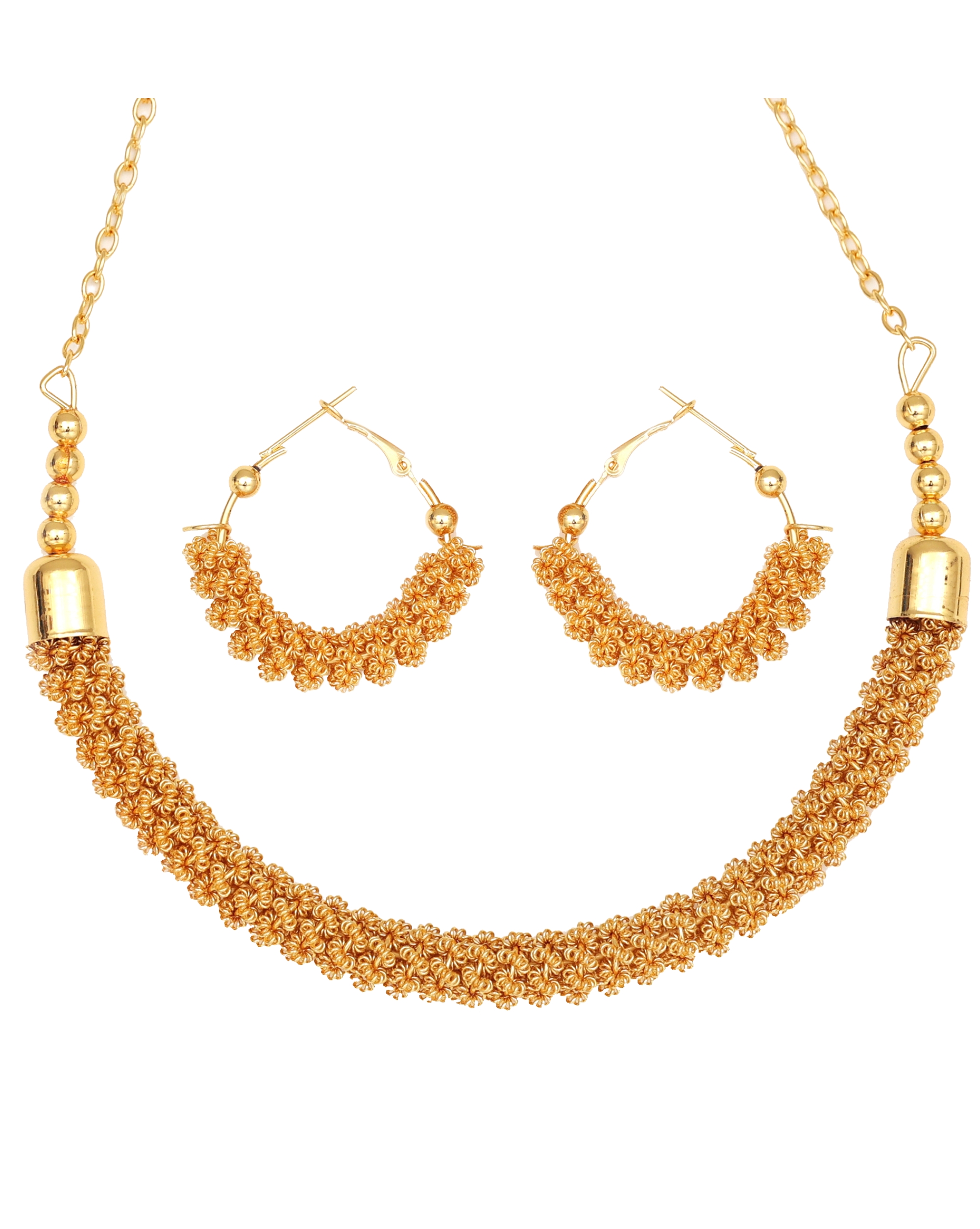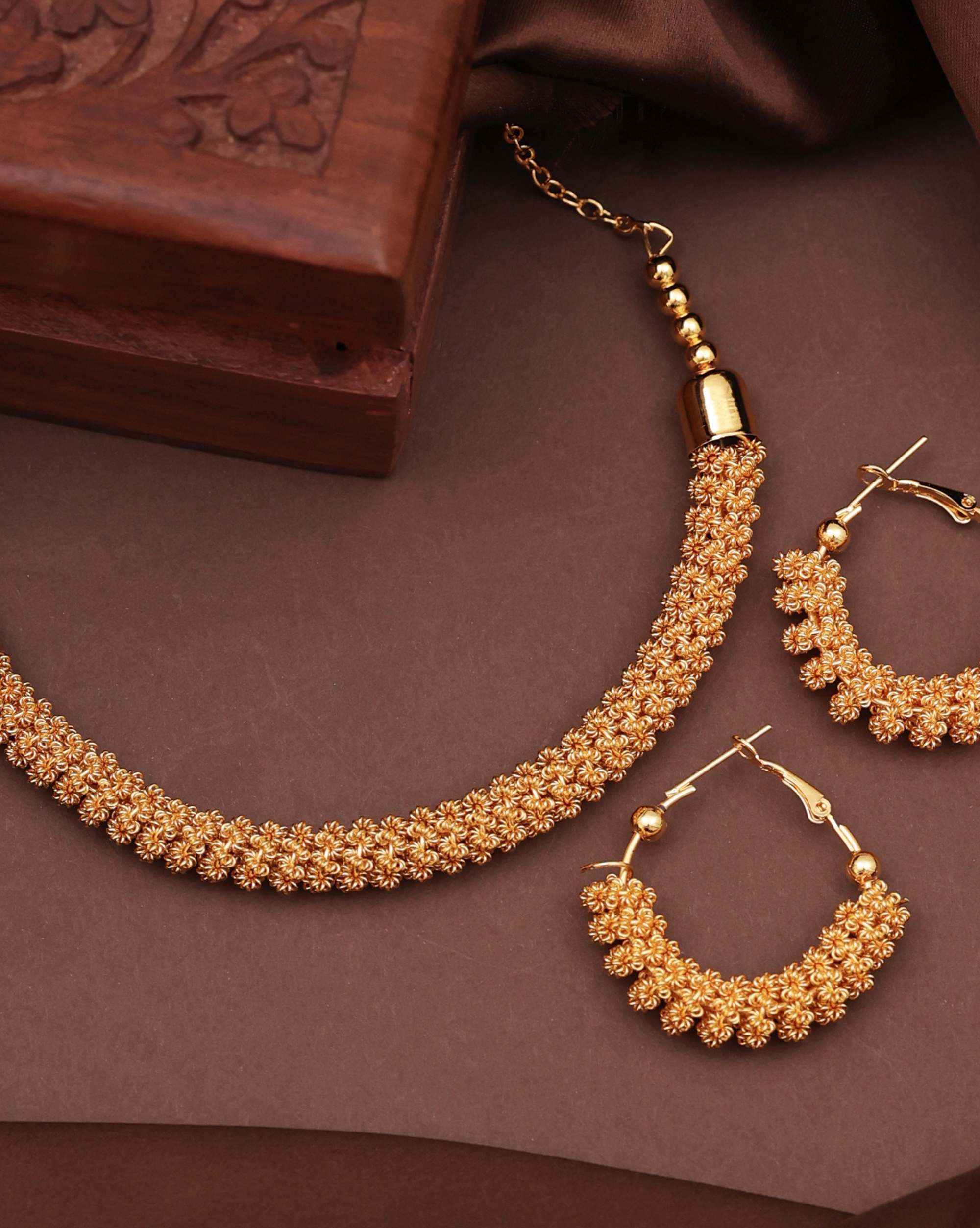 Gold-plated necklace and earring set featuring intricate floral pattern detailing with a luxurious textured finish. Curved choker-style necklace with beaded accents and secure chain fastening for comfortable wear. Coordinating hoop earrings adorned with the same floral pattern design and secure post backs. Meticulously crafted with detailed metalwork showcasing delicate flower motifs throughout the set