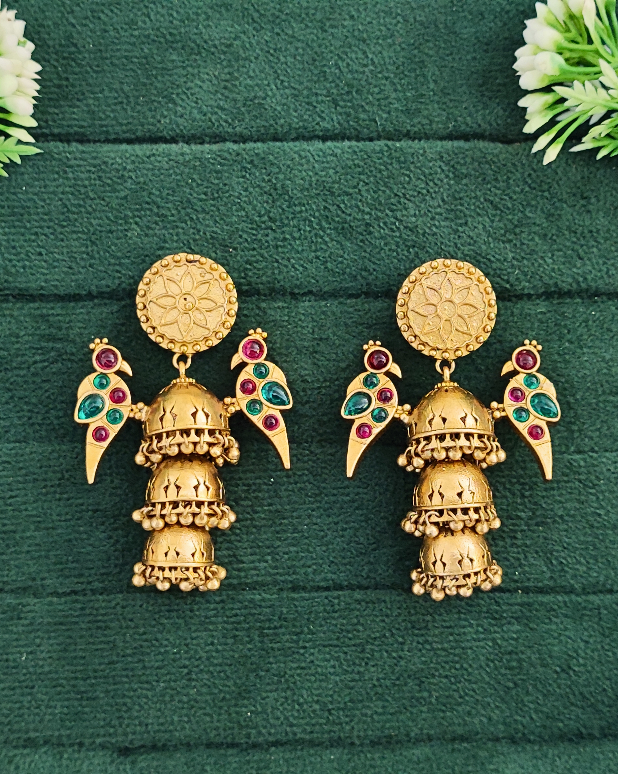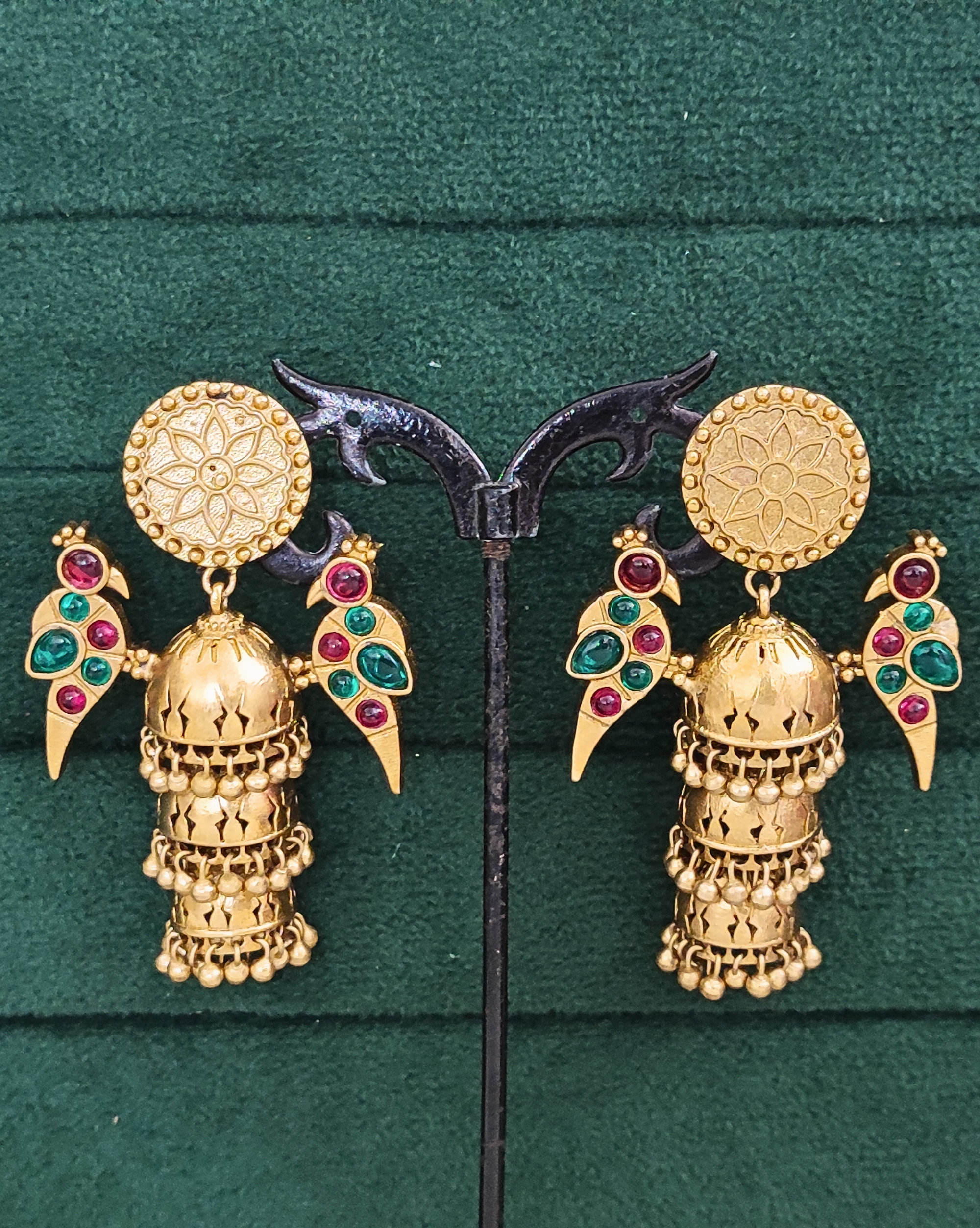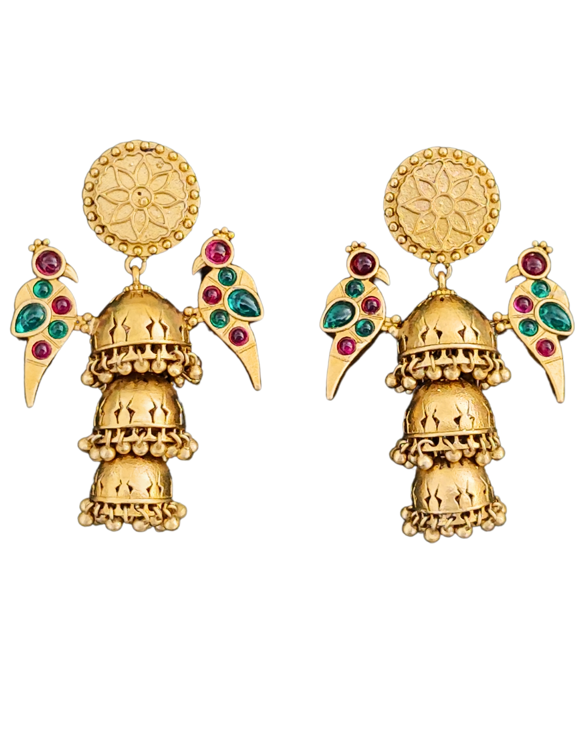 Elevate your traditional ensemble with these exquisite gold-plated jhumka earrings, masterfully crafted with intricate detailing. The design features a stunning combination of a floral-patterned circular stud topped with graceful peacock motifs on either side, adorned with vibrant ruby-coloured and emerald-coloured stones. The three-tiered jhumka drops showcase delicate cutwork patterns and are embellished with small golden beads along the borders, creating a mesmerising cascade effect. These statement pieces perfectly blend classical Indian artistry with contemporary styling, making them ideal for festive occasions, weddings, or any traditional celebration. The earrings strike a beautiful balance between grandeur and wearability, with their medium size ensuring comfort without compromising on visual impact. Each tier of the jhumka features intricate lattice work that catches light beautifully, adding movement and sparkle to your look.