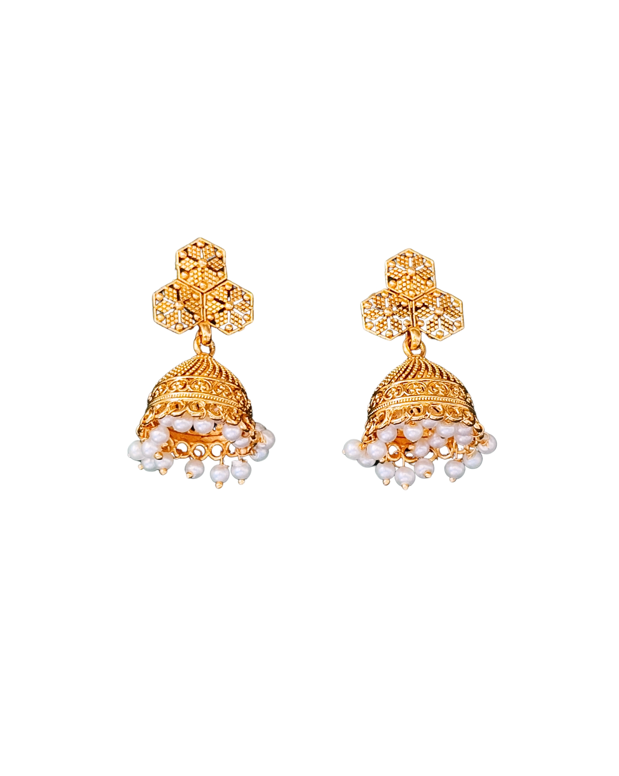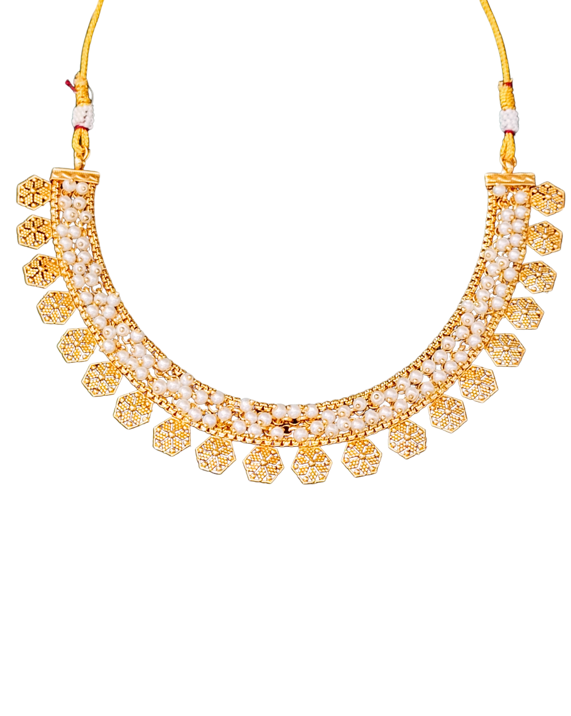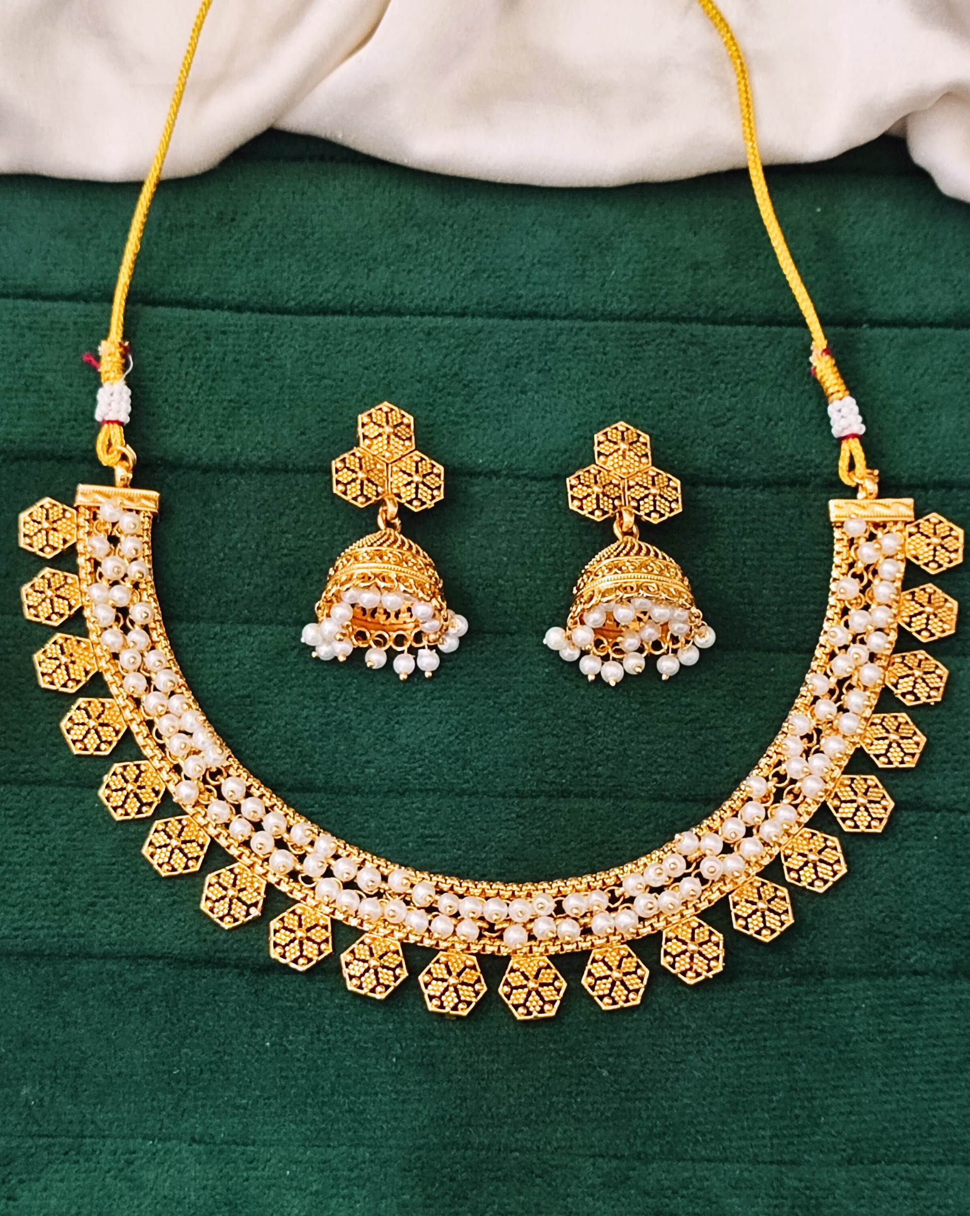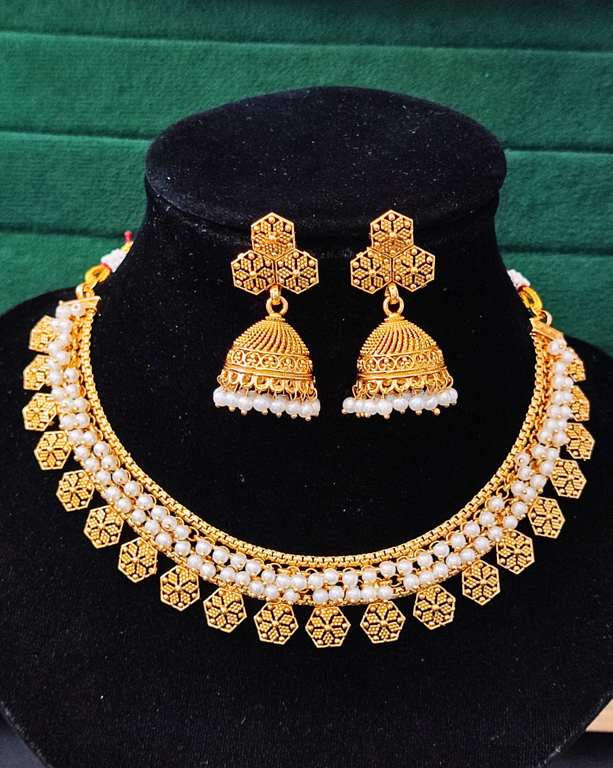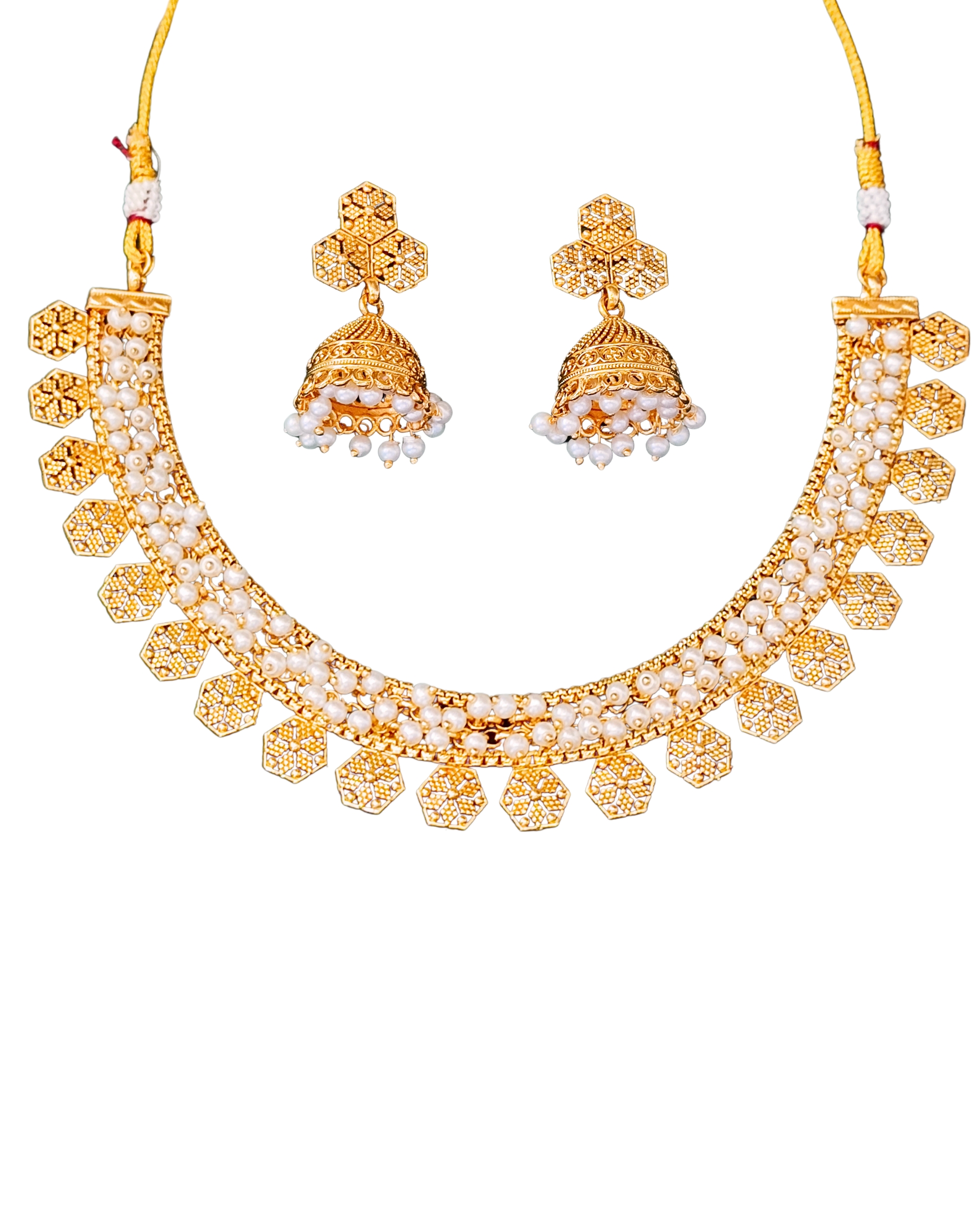 Grace your festive look with this exquisite gold-plated necklace set featuring lustrous pearls and intricate hexagon motifs. Paired with elegant jhumka earrings, this handcrafted jewelry set is perfect for weddings, religious ceremonies, or cultural celebrations. The adjustable thread ensures a secure and comfortable fit. Its rich design complements sarees, lehengas, and other ethnic wear, making it a must-have in every traditional jewelry collection.