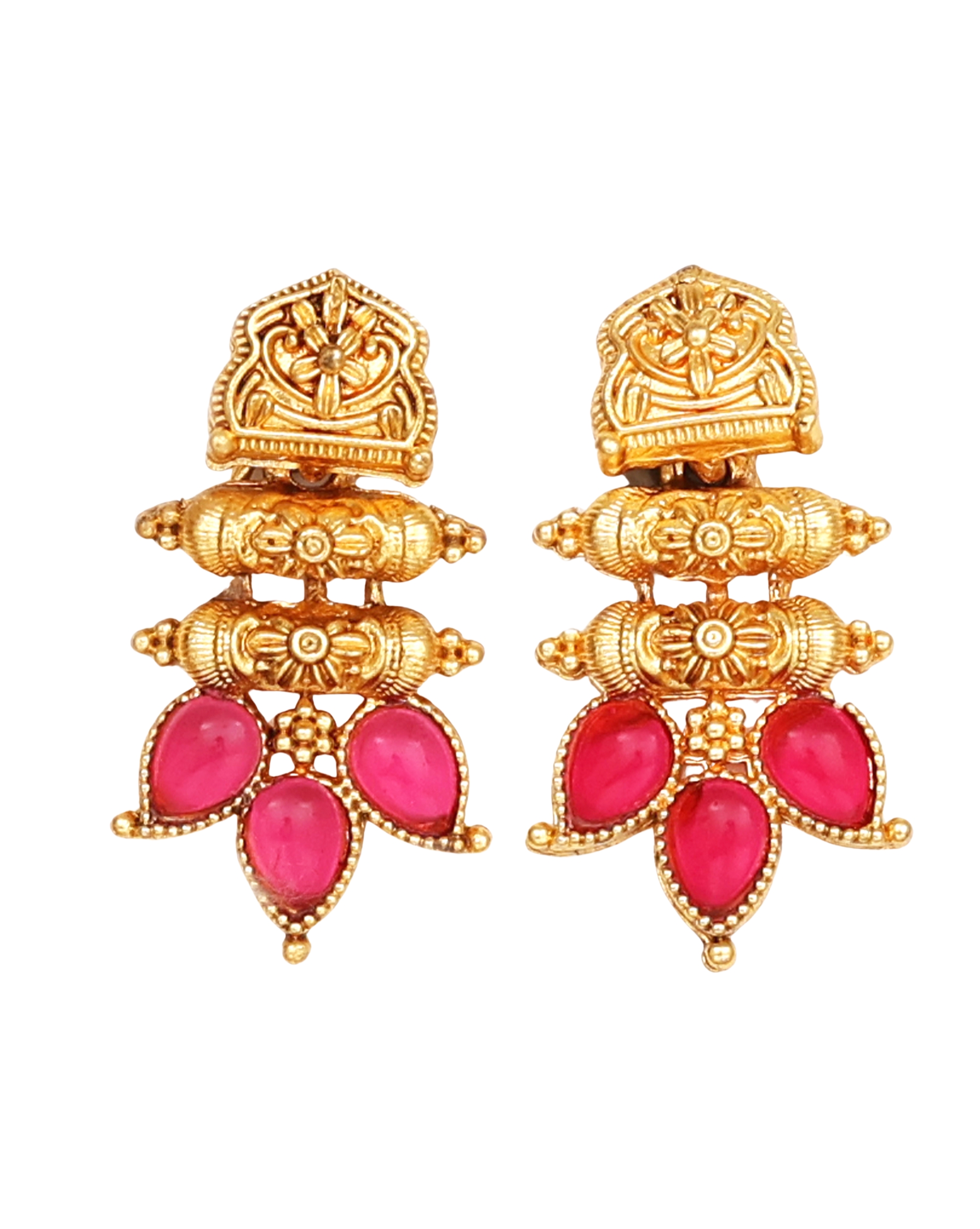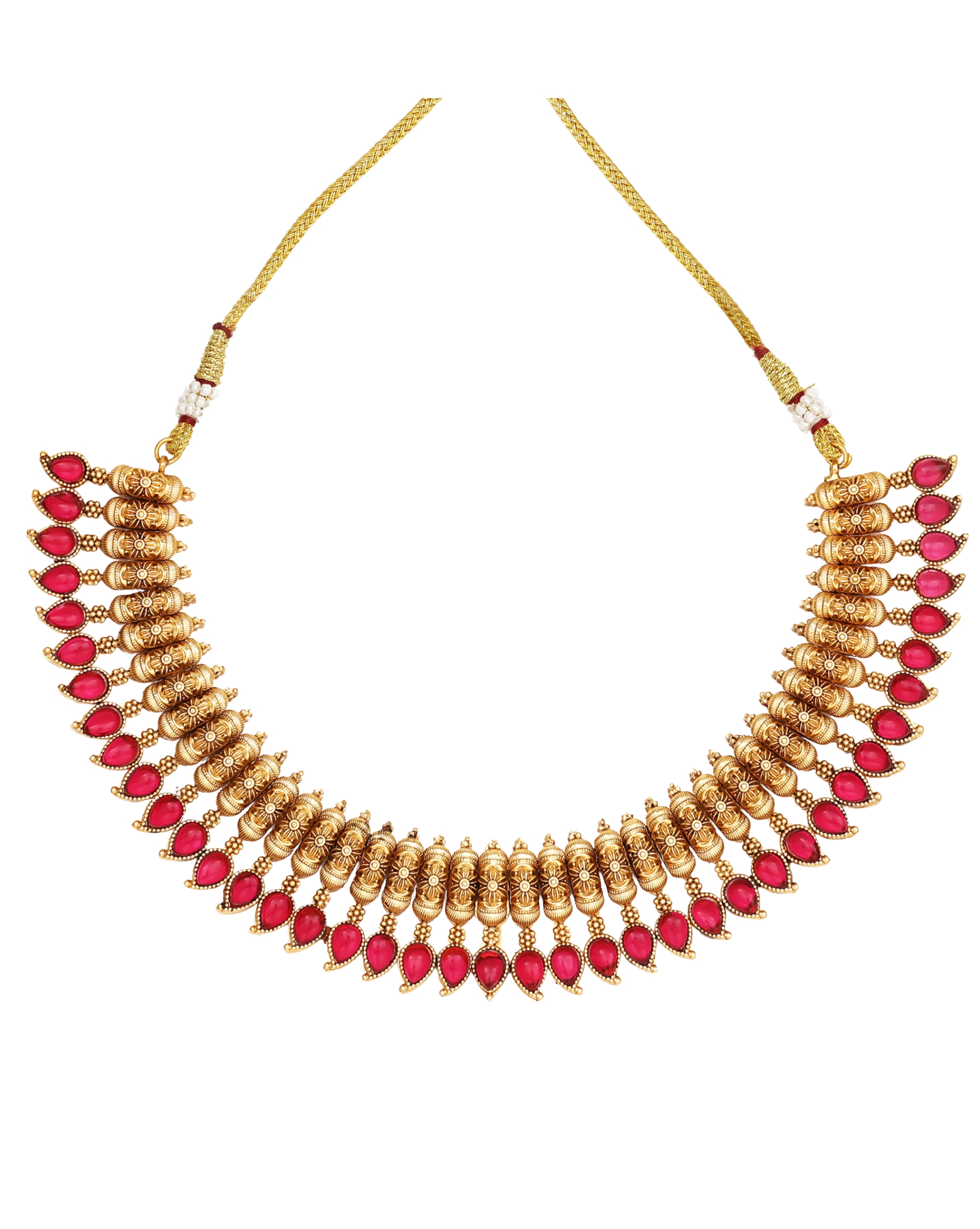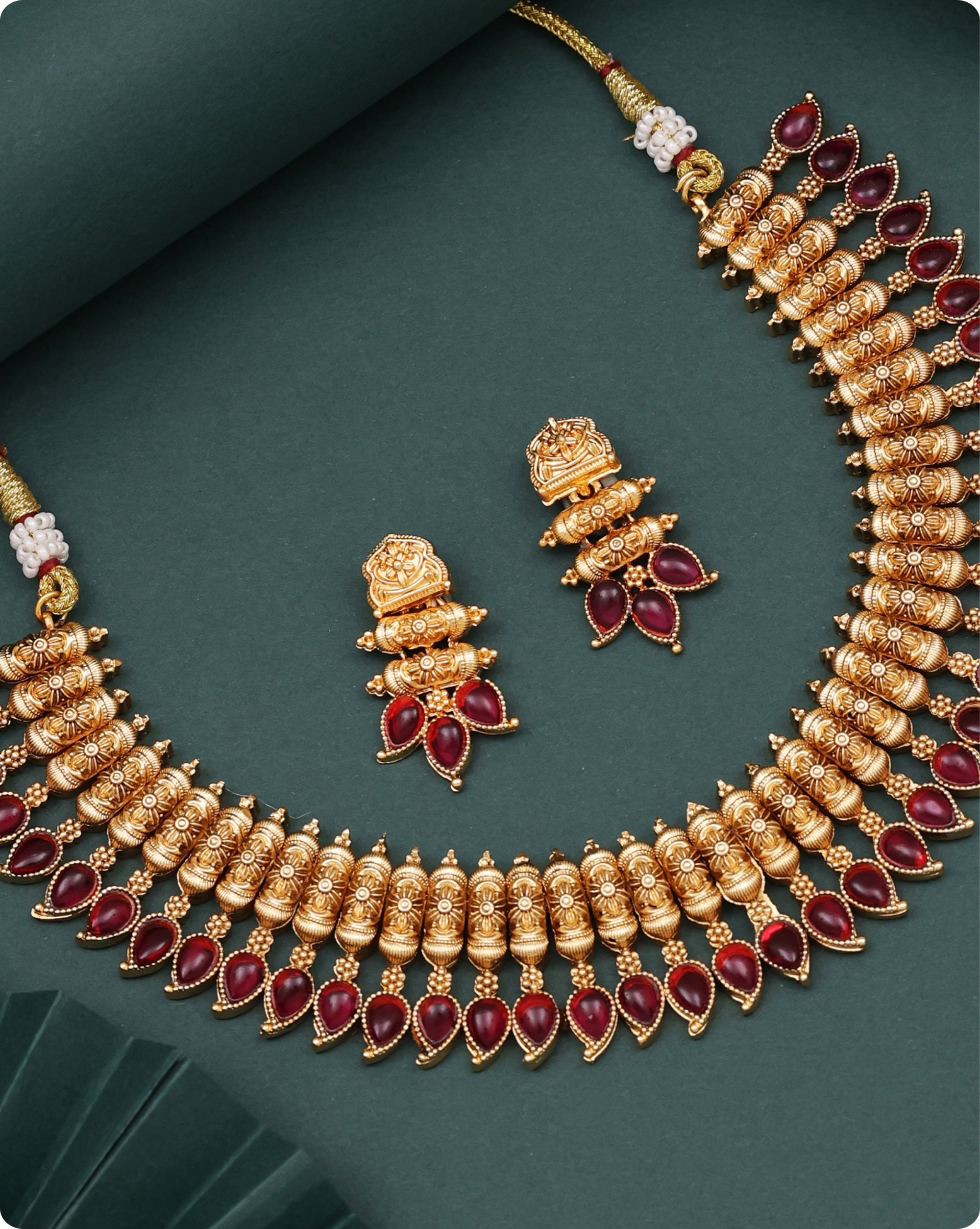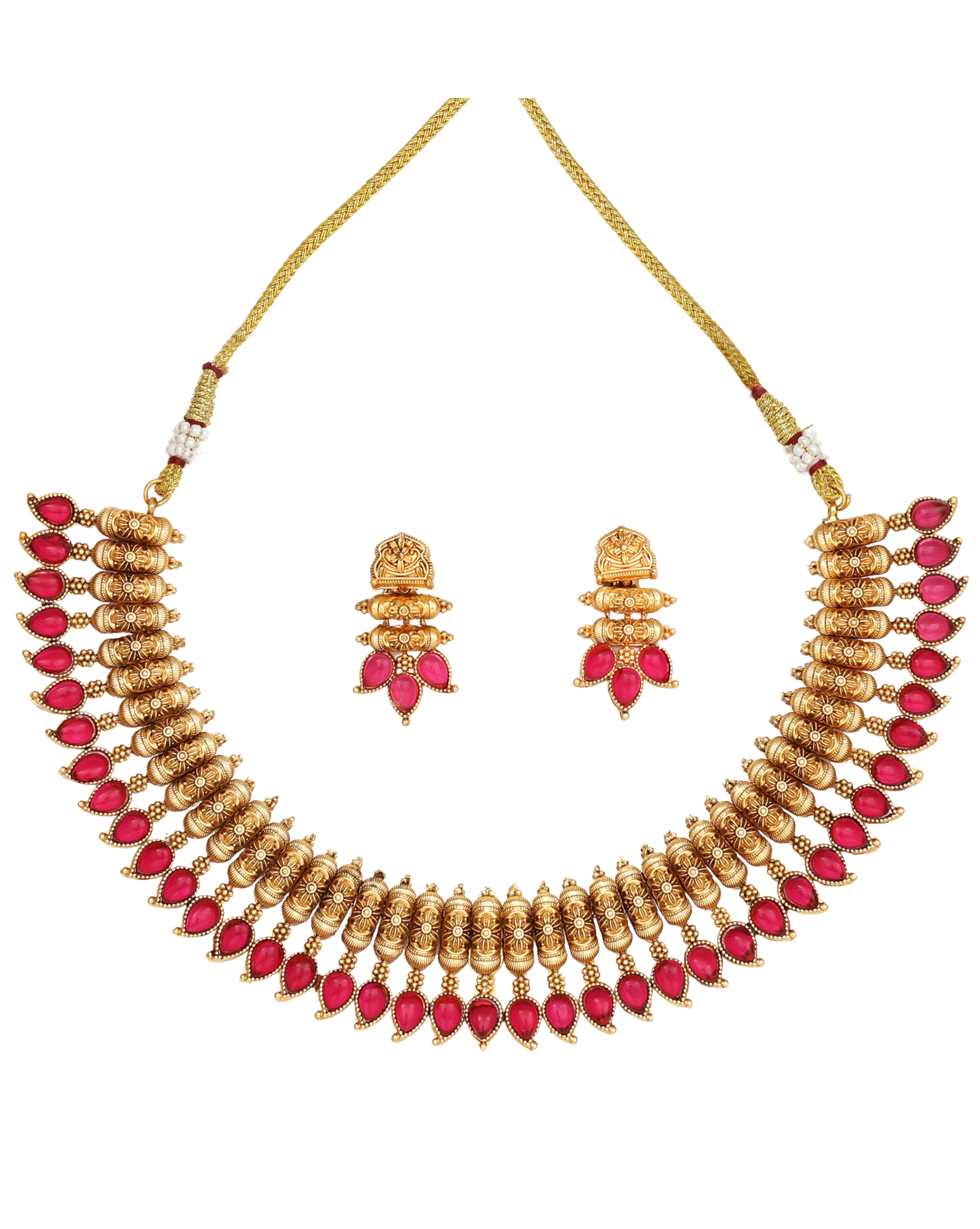 Exquisite antique-finish necklace set featuring intricate golden beadwork and striking Ruby stone embellishments. Beautiful teardrop-shaped red stones adorning the necklace edges create an elegant contrast against the golden framework. The design showcases traditional Indian craftsmanship, making it a perfect accessory for weddings and festive occasions. The matching earrings complement the necklace beautifully, enhancing its regal and elegant appeal.