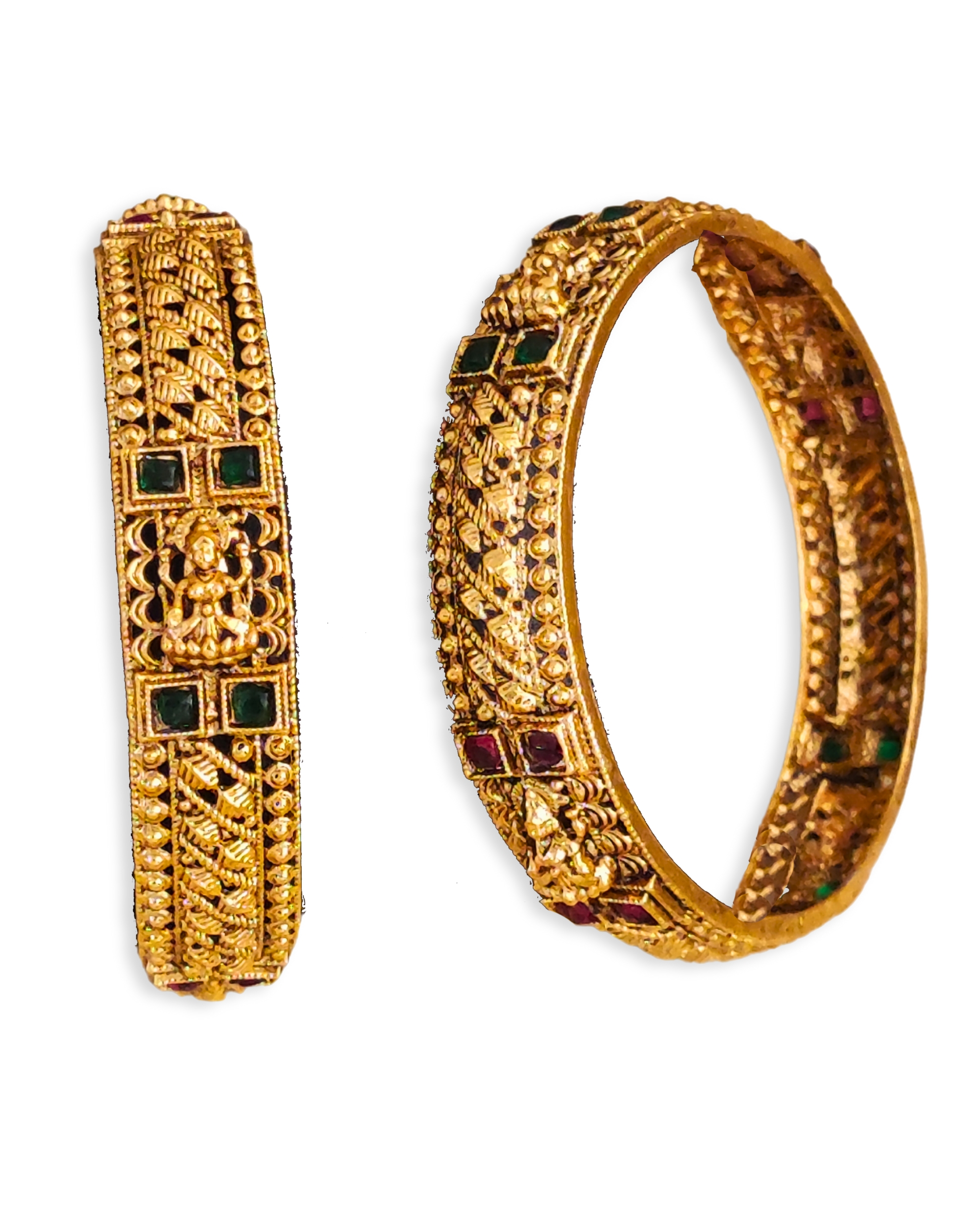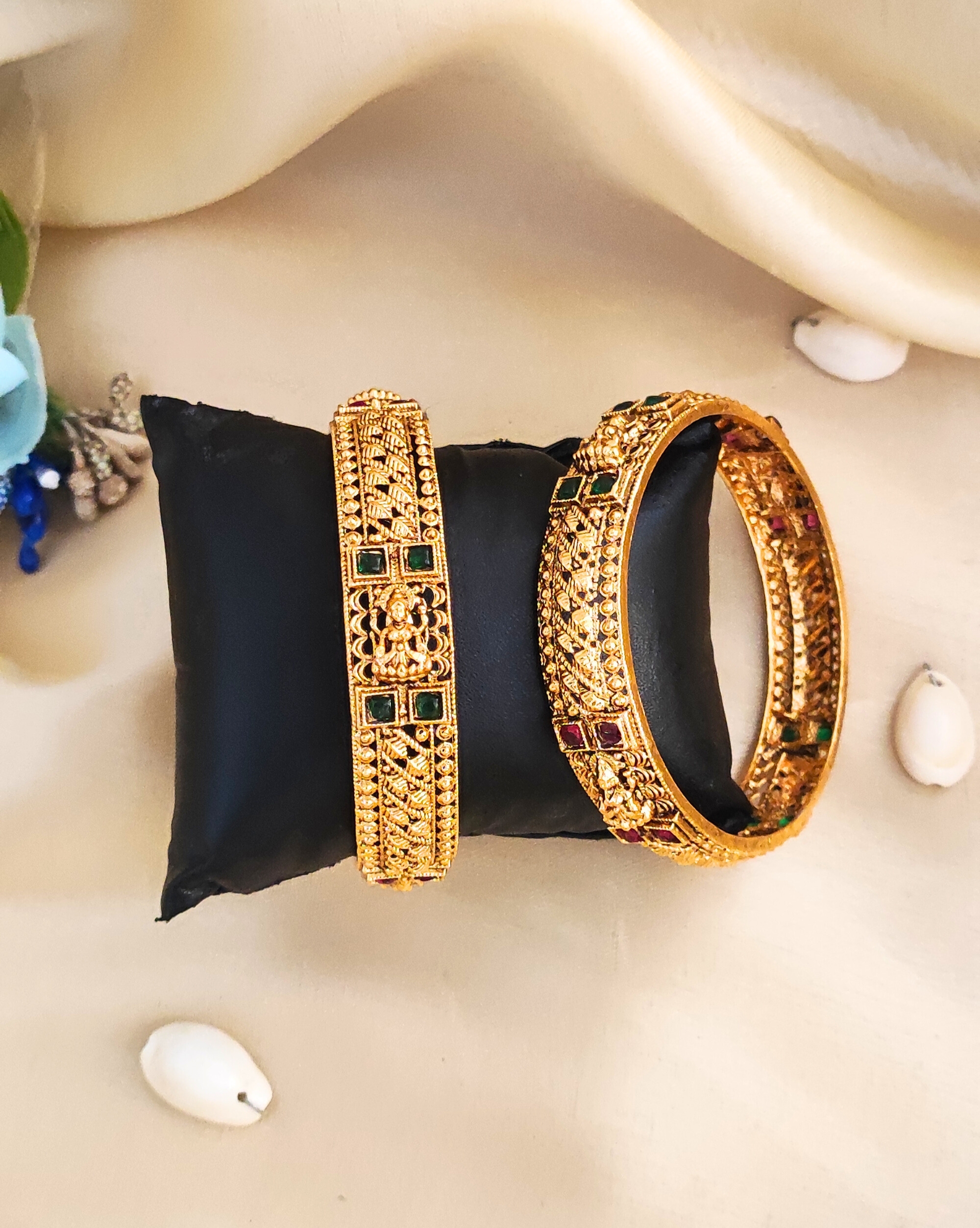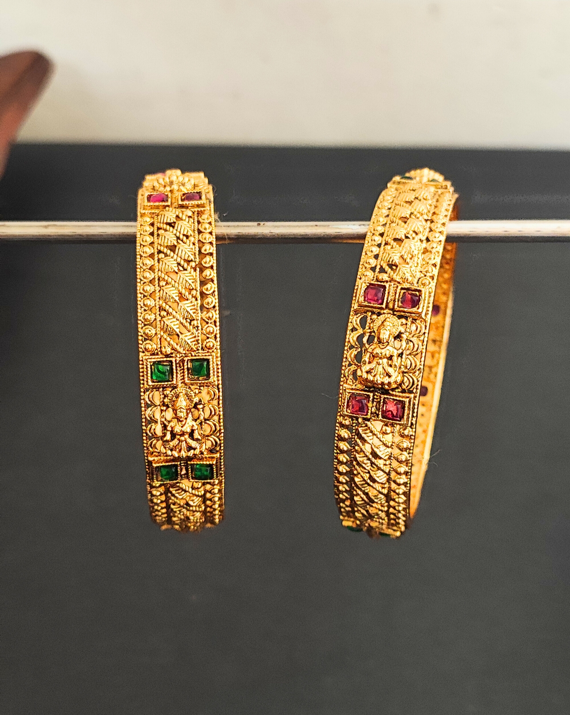 High Gold-Plated Bangles with Emerald and Ruby Stones, Antique Matte Temple Design Bangle (Set of 2)