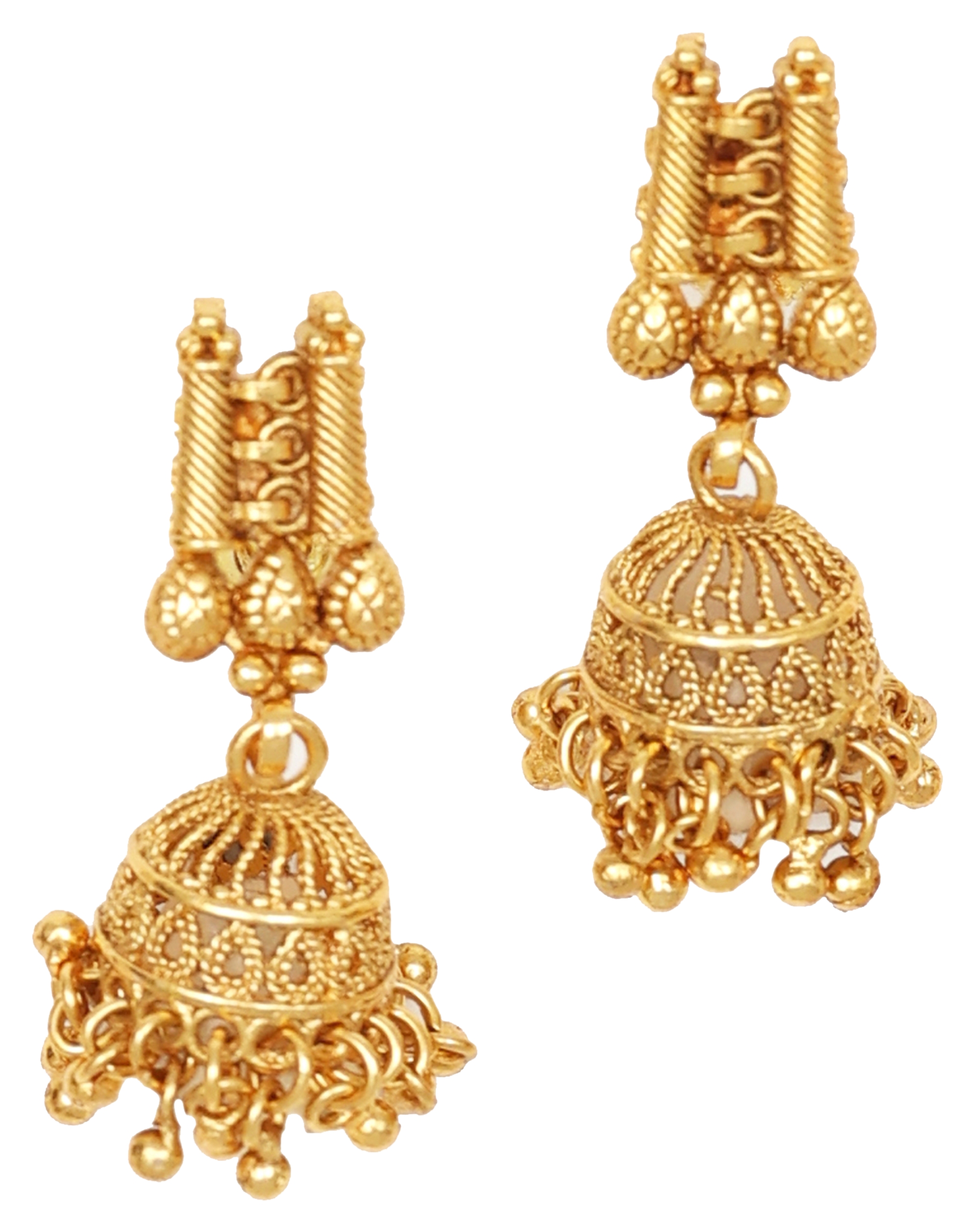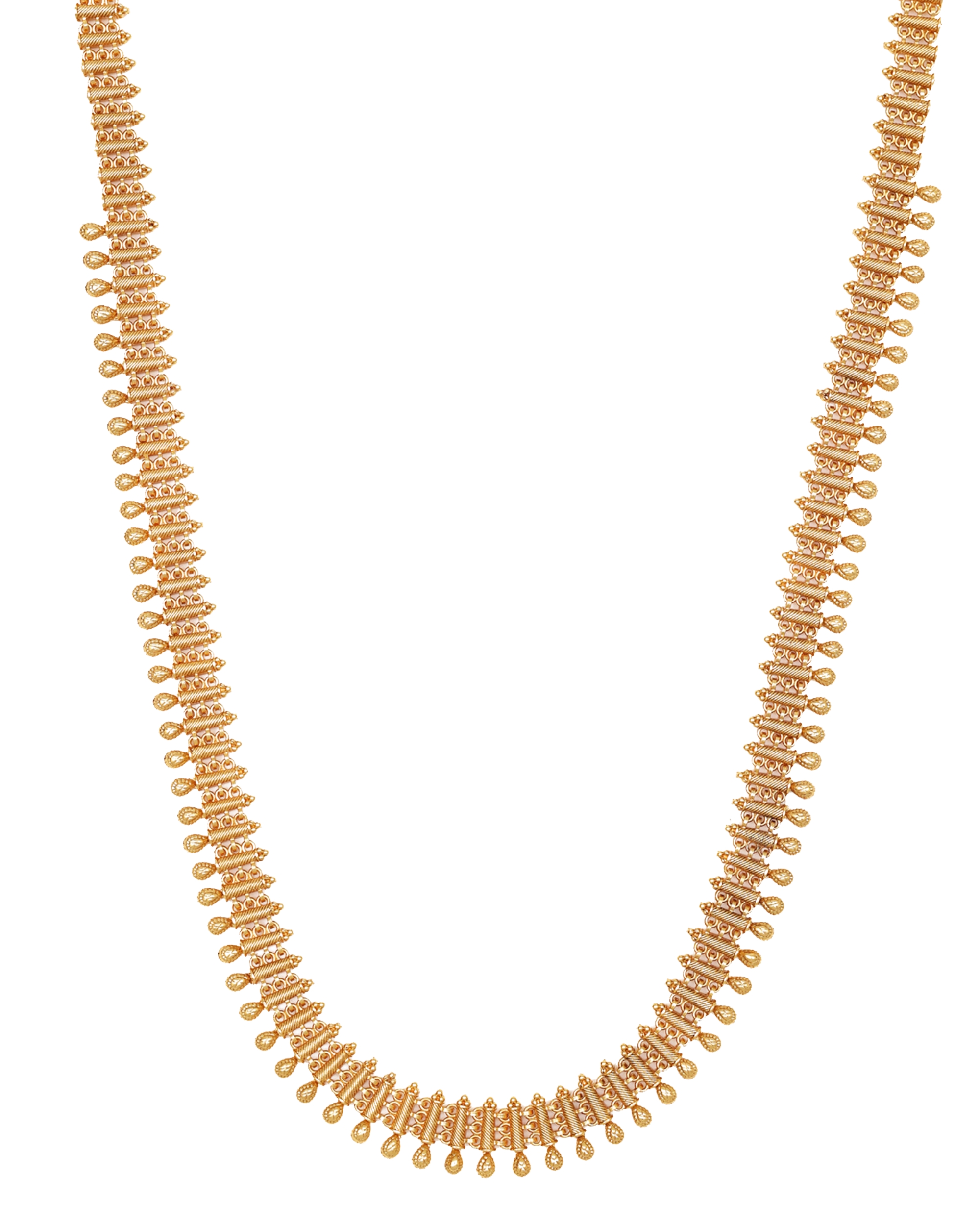 Exquisite gold-plated necklace featuring intricate spinal pattern with delicate droplet embellishments throughout the length. Complete jewellery set includes a stunning long necklace paired with matching jhumka-style earrings. Jhumka earrings feature dome-shaped design with small hanging bells, measuring approximately 3 cm in length