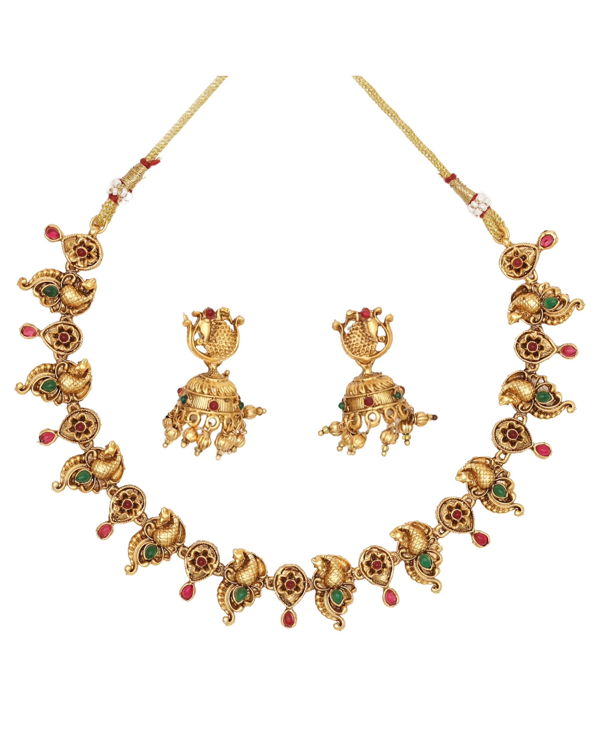 High Gold Polish with Peacock Design Jhumka Earrings Necklace Set