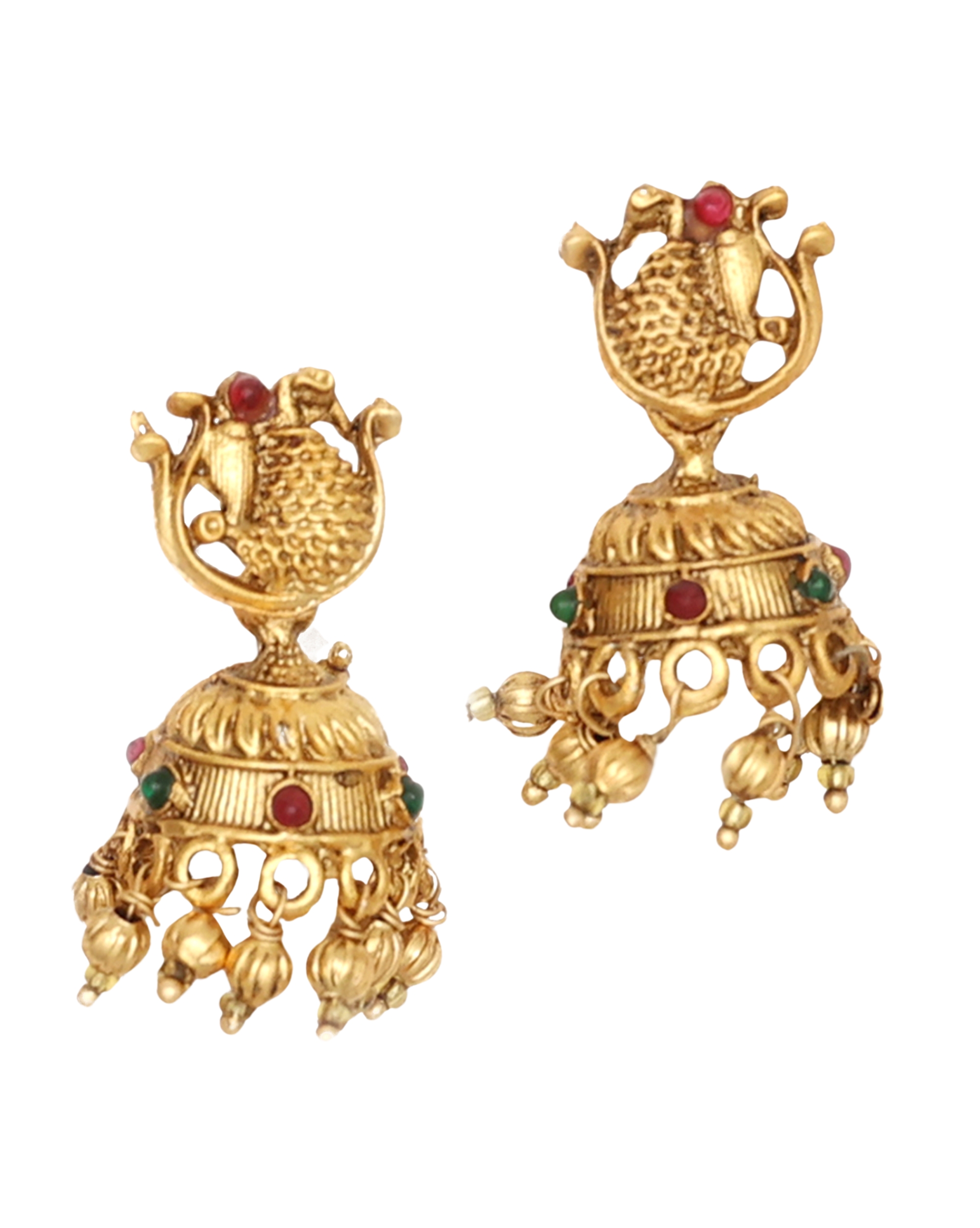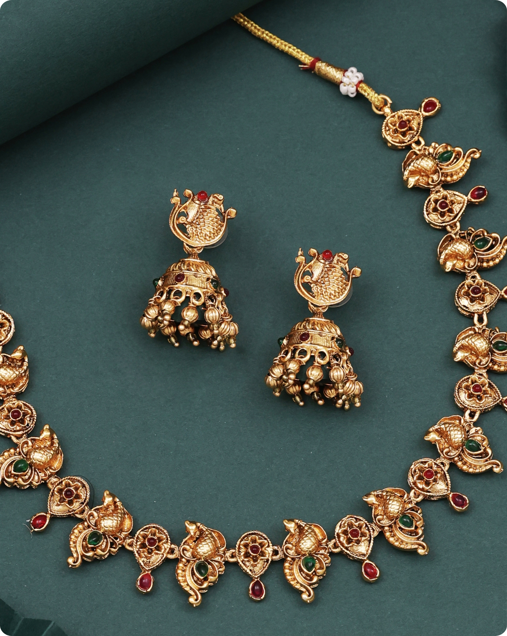 Be the first to review “High Gold Polish with Peacock Design Jhumka Earrings Necklace Set”