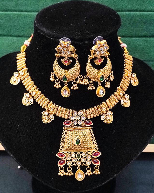 Traditional Floral Pendant Necklace Set with Red and Green Stones and Dangling Beads
