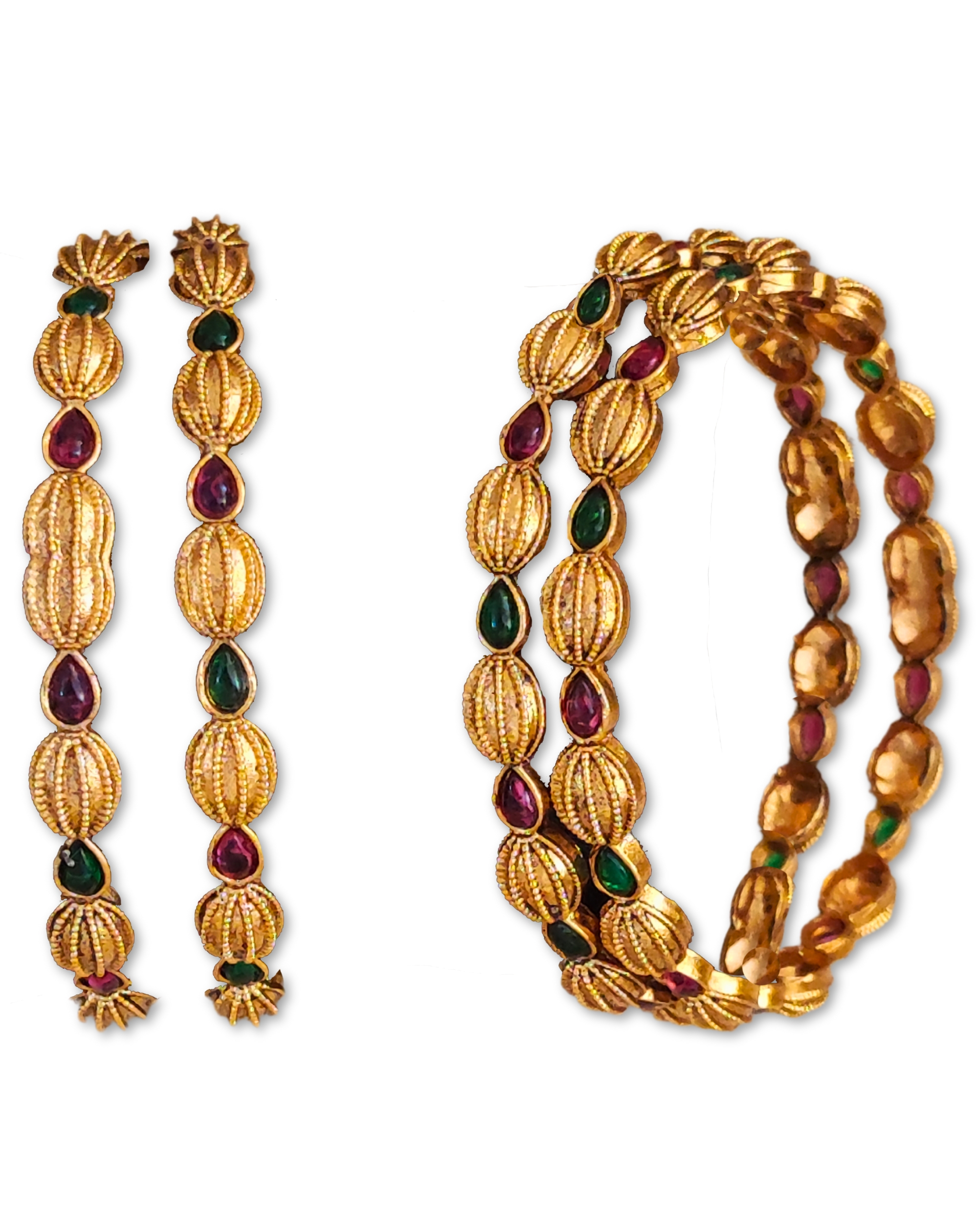 Elegant gold-plated bangles set featuring textured spherical beads with alternating ruby and emerald coloured stones. Intricately detailed with ribbed patterns and sunburst end caps, showcasing superior metalwork and stone setting. Beautifully arranged alternating pattern of deep red and green stones creates a rich, royal aesthetic