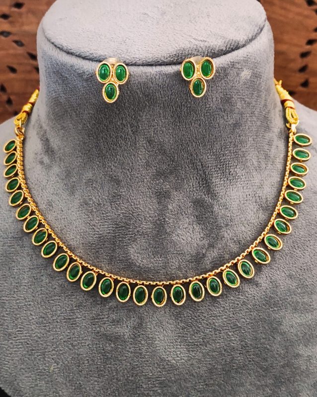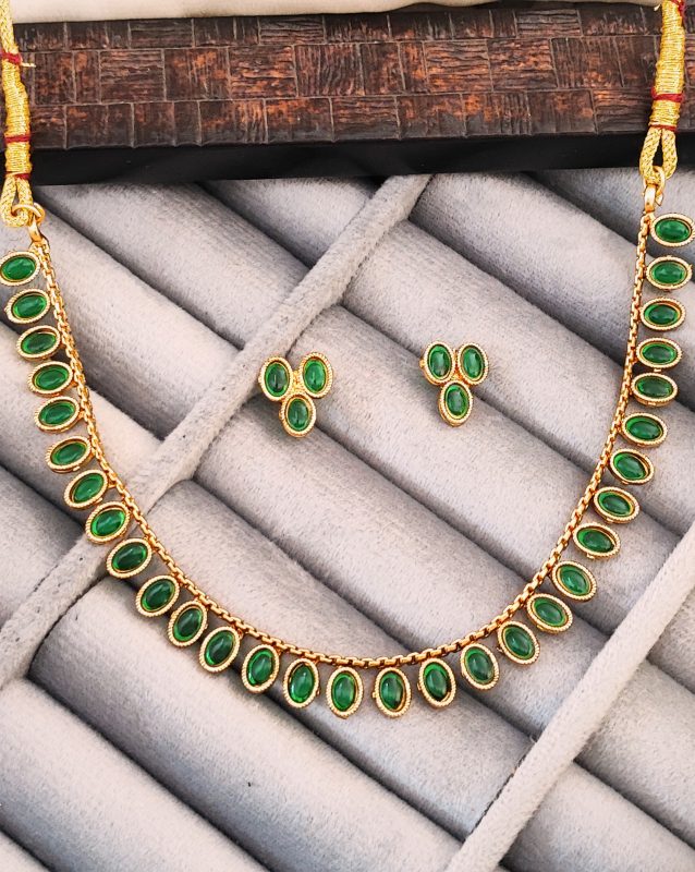 Traditional Gold-Plated Necklace Set with Oval Green Gemstones, Matching Earrings