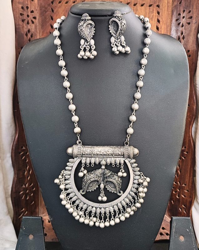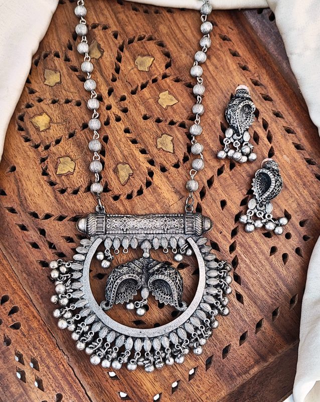 Oxidized Style Necklace Set with Intricate Peacock Design and Matching Earrings for All Festive Wear for Her