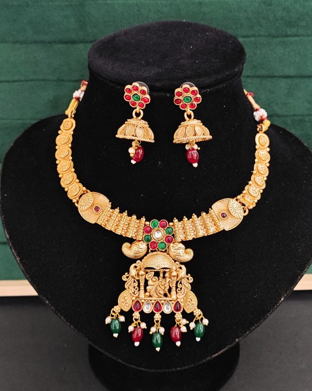 South Indian Jewelry Necklace Set with Lakshmi Pendant, Ruby & Green Stones, Coin Design, and Matching Jhumka Earrings for Occasional Wear