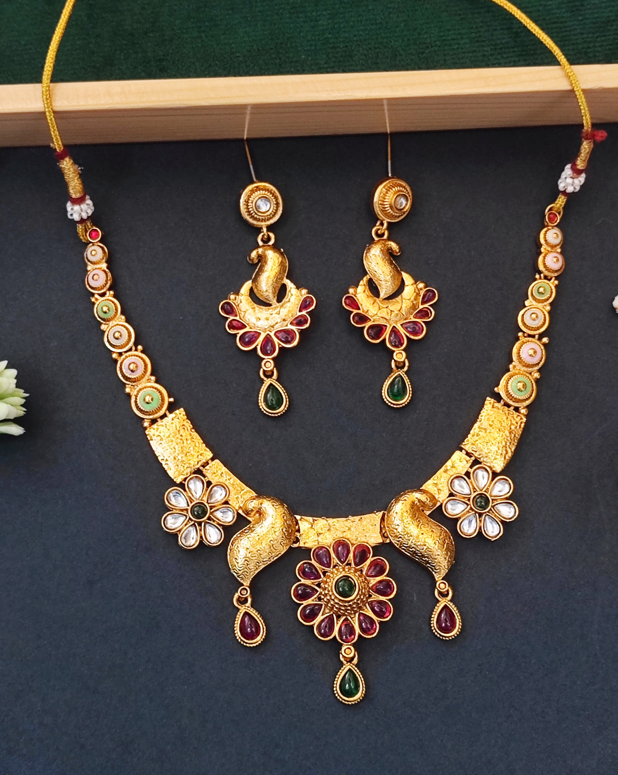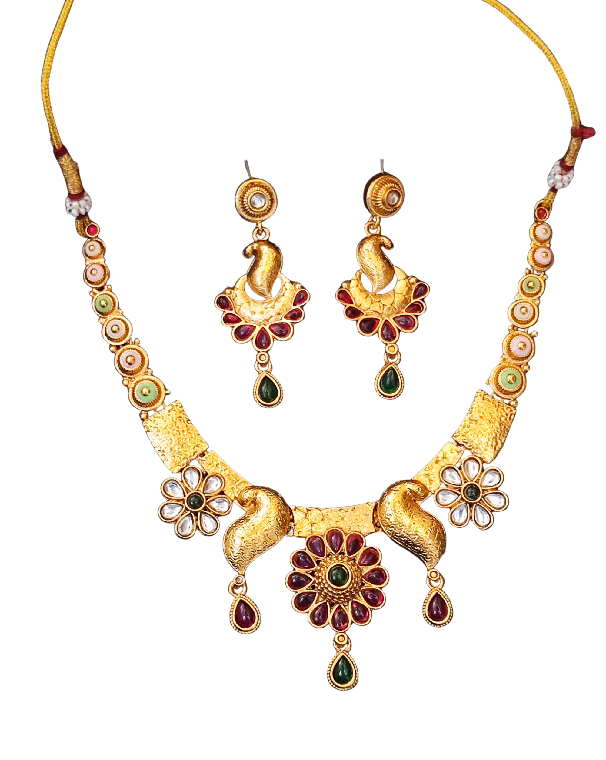 Ethnic Gold Floral Necklace Set with Red and Green Enamel Accents Original price was: ₹3,899.00.Current price is: ₹979.00.