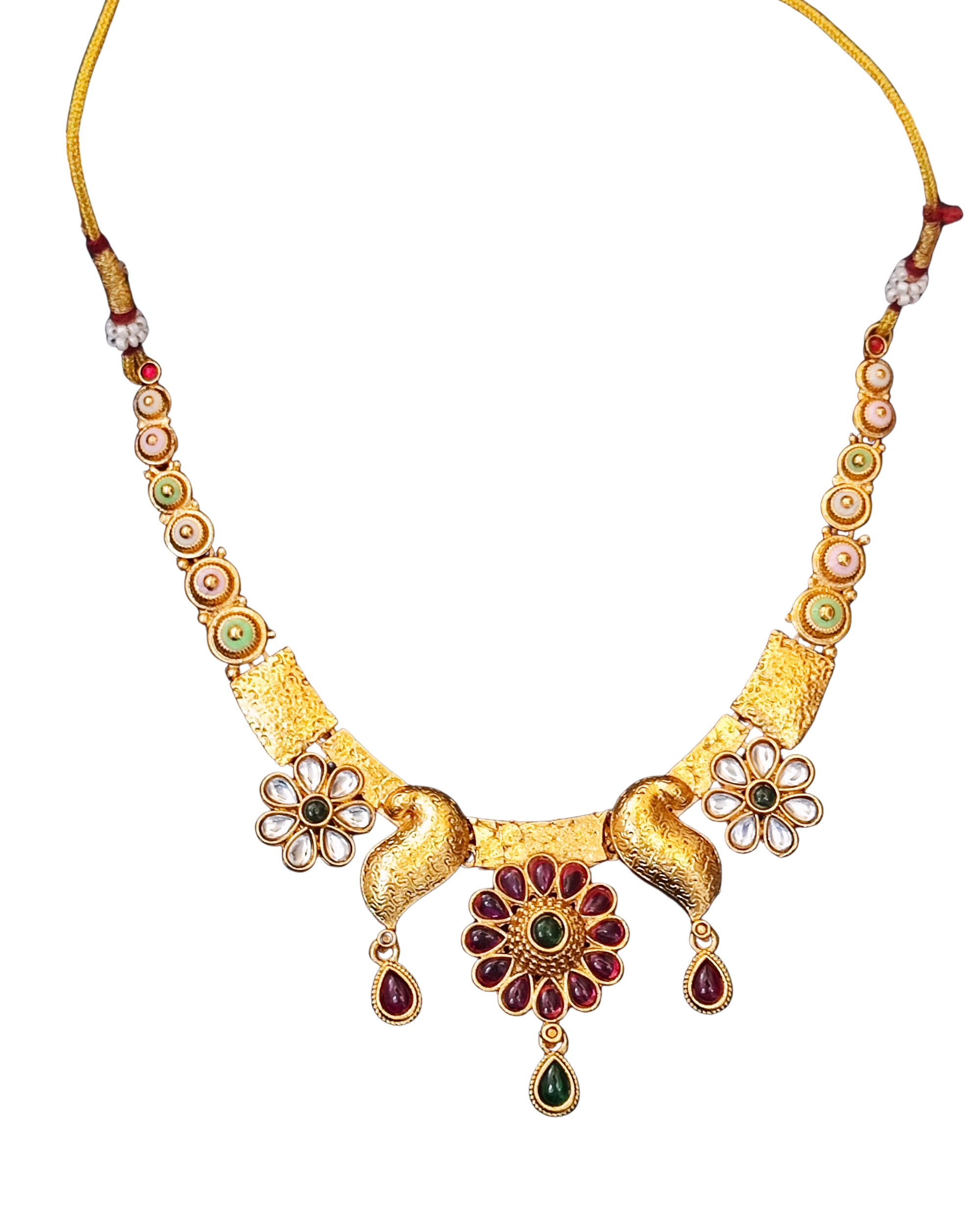 Ethnic Gold Floral Necklace Set with Red and Green Enamel Accents