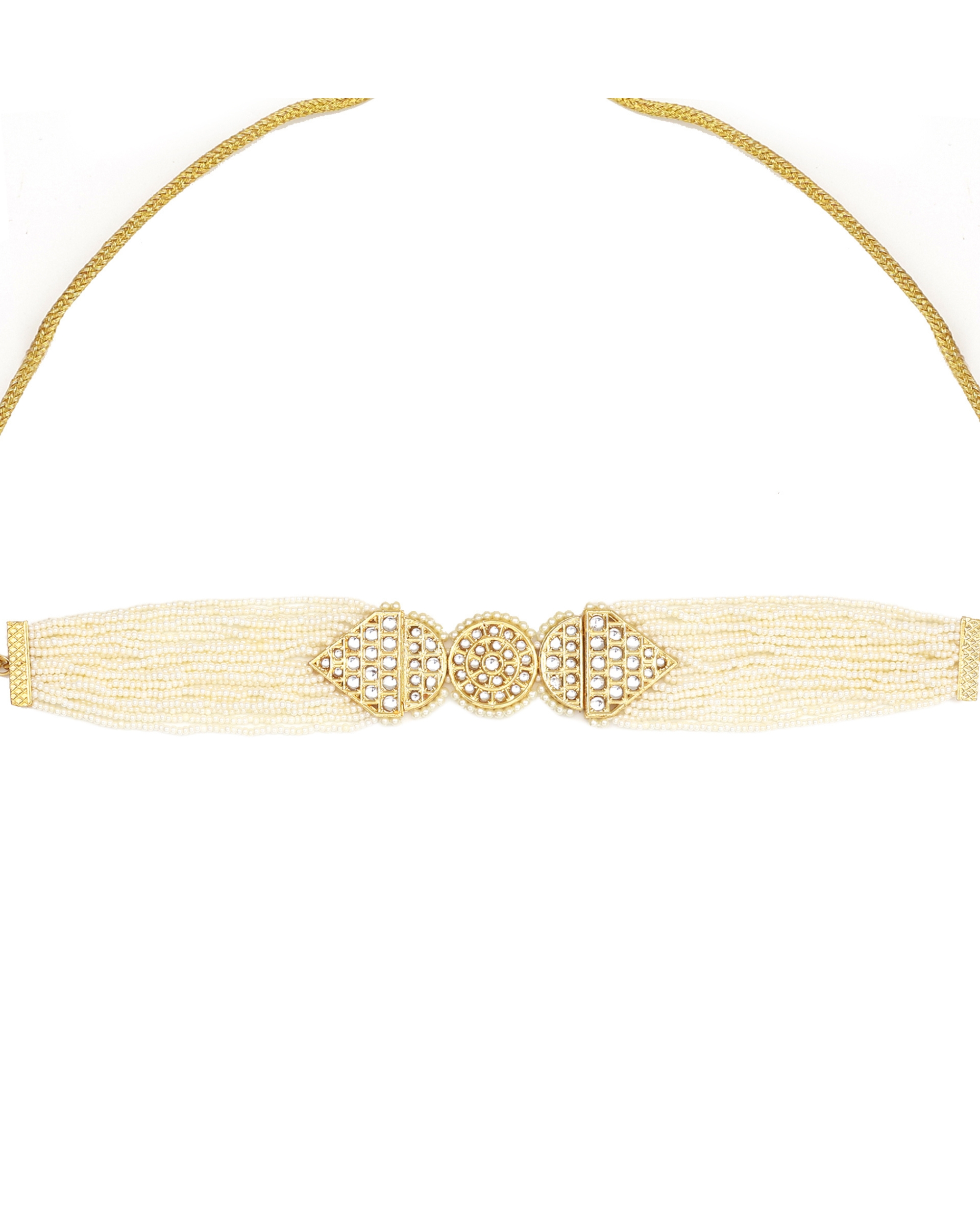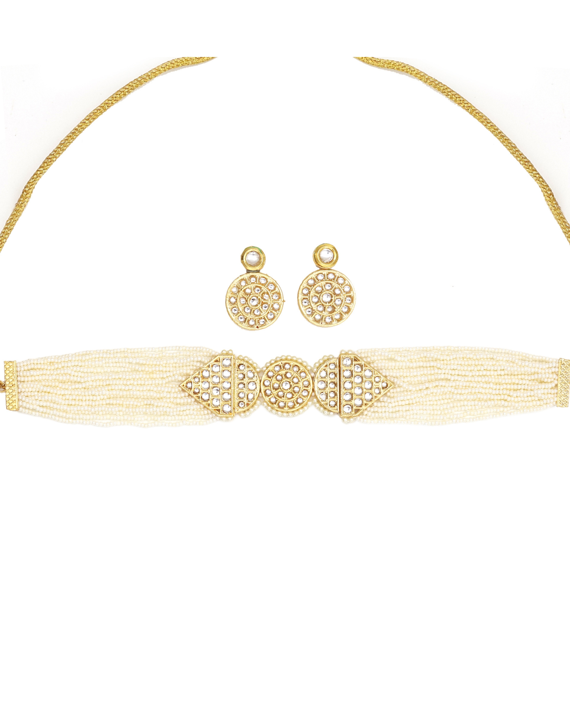 Multi-strand pearl choker necklace featuring ornate gold-toned centerpiece with Kundan embellishments and geometric patterns. Includes coordinating circular drop earrings adorned with Kundan details in gold-tone finish. Perfect accessory for special occasions, traditional wear, or adding elegance to formal attire