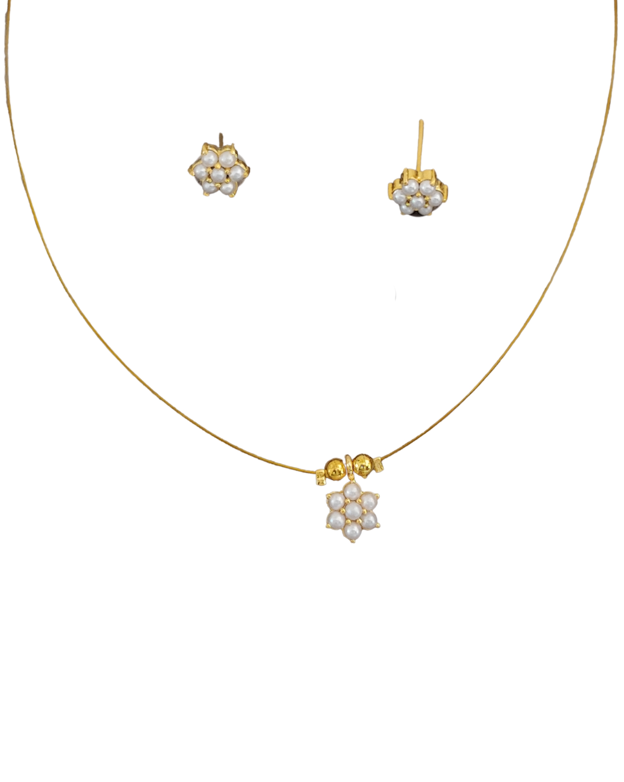 Add a touch of timeless elegance to your jewellery collection with this exquisite pearl flower necklace and earrings set. The delicate floral design features pristine white pearls arranged in a charming flower pattern, beautifully complemented by gold-plated settings. The necklace comprises a sleek gold-plated chain with a stunning pearl flower pendant, while the matching stud earrings echo the same graceful motif. This versatile set strikes the perfect balance between classic and contemporary styling, making it suitable for both everyday wear and special occasions. The lustrous pearls catch and reflect light beautifully, adding a subtle shimmer to your ensemble. Whether paired with traditional attire or modern outfits, this jewellery set offers sophisticated charm that elevates any look.