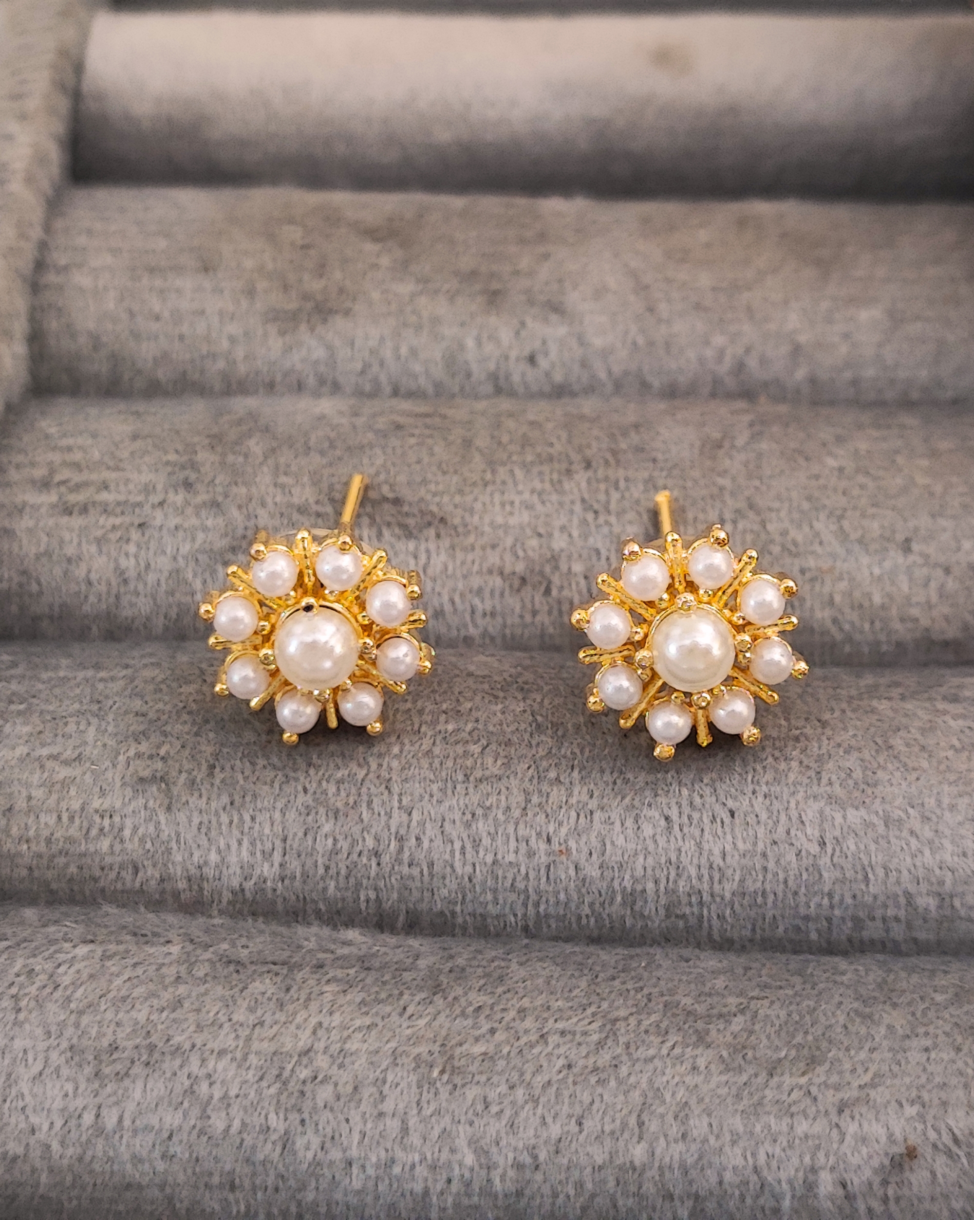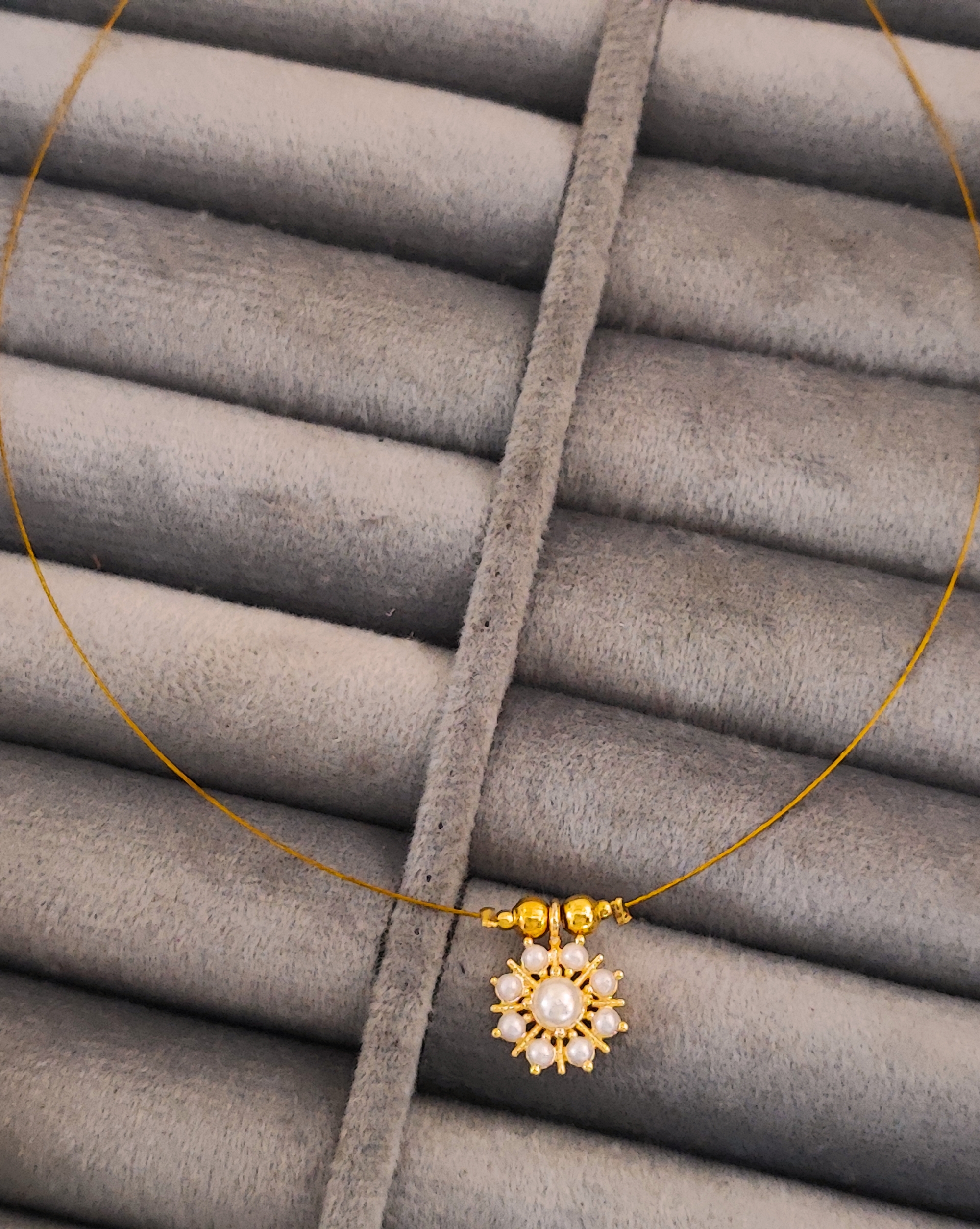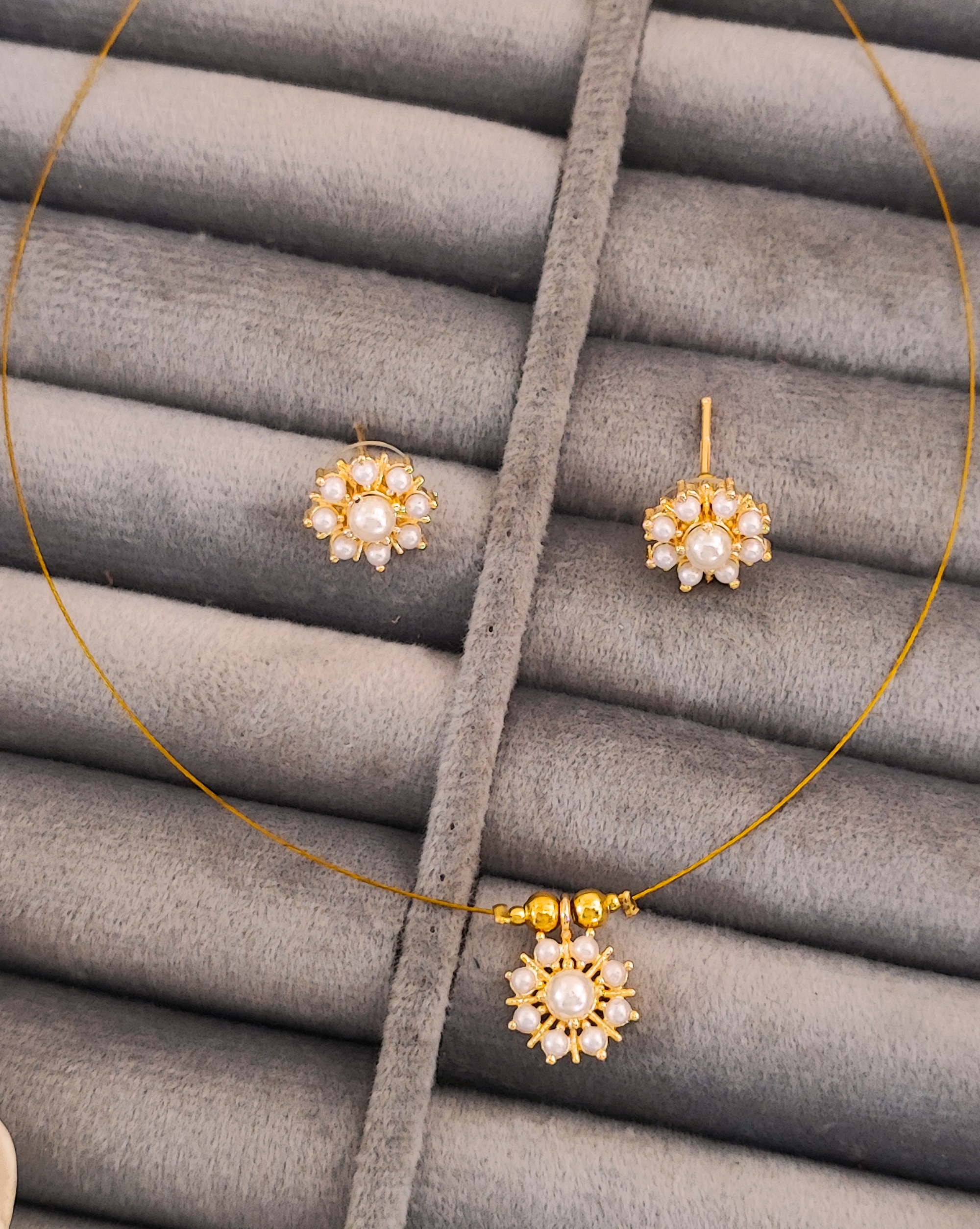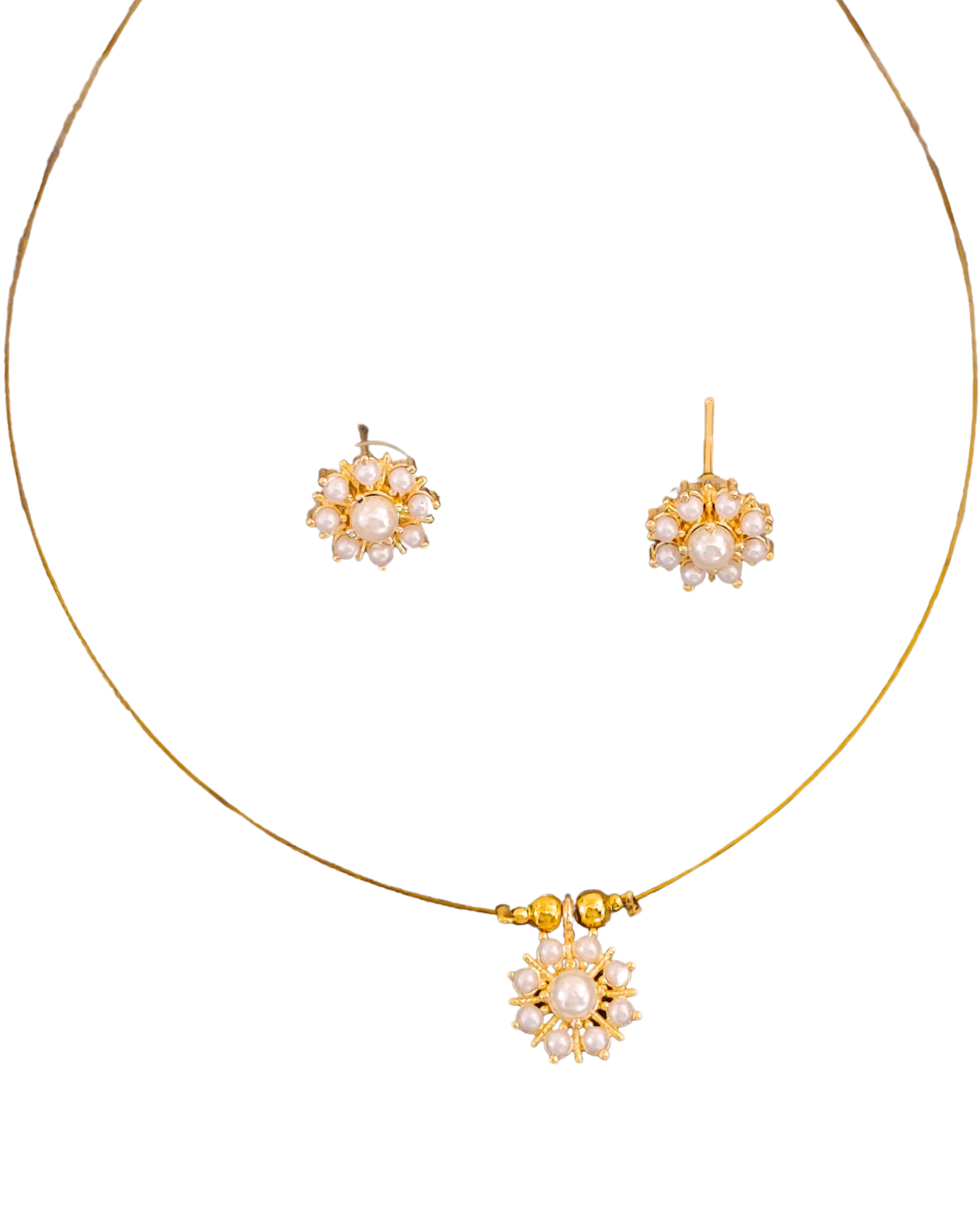 Elevate your jewellery collection with this exquisite pearl flower necklace and earrings set. The delicate floral design features pristine pearls arranged in a stunning sunburst pattern, creating elegant flower motifs that capture light beautifully. The gold-plated setting adds a luxurious touch while maintaining a lightweight feel. The matching stud earrings perfectly complement the pendant, which hangs gracefully from a sleek gold-plated wire necklace accented with decorative beads. This versatile set strikes the perfect balance between classic and contemporary styling, making it an ideal choice for both everyday wear and special occasions. The timeless combination of pearls and golden tones ensures this set will remain a cherished addition to your accessories collection. Perfect for gifting or treating yourself to a touch of refined elegance.