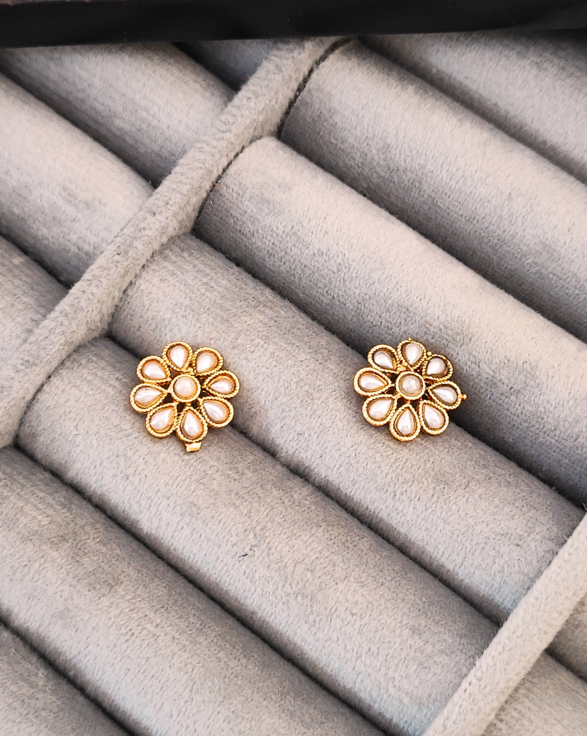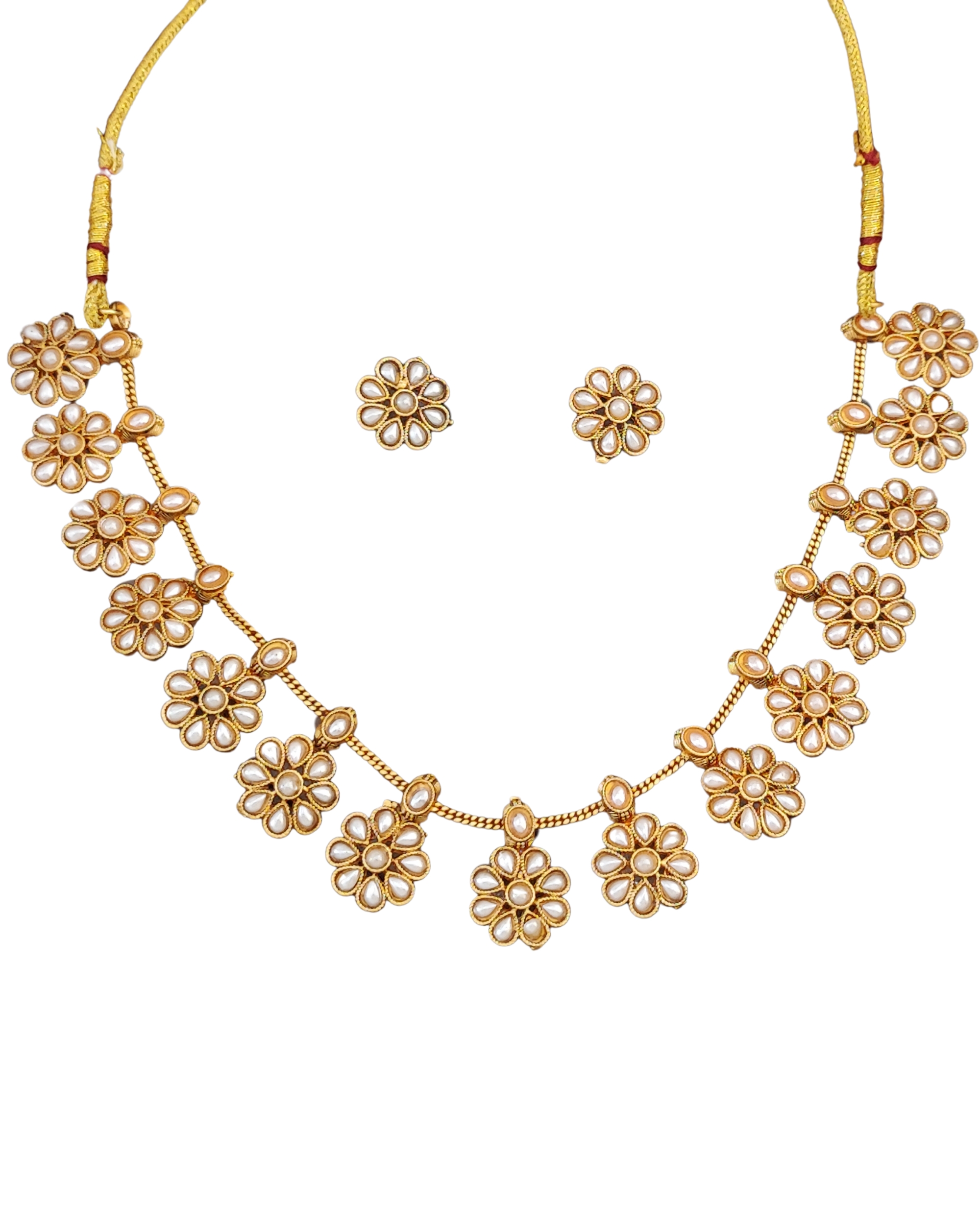 Elevate your traditional ensemble with this exquisite pearl flower necklace set that beautifully combines elegance with cultural artistry. The necklace features a stunning arrangement of delicate flower motifs, each crafted with precision using gold-plated metal and adorned with lustrous pearls. The symmetrical floral design creates a graceful cascade effect, making it perfect for special occasions and wedding ceremonies. The matching stud earrings complement the necklace’s intricate pattern, completing the set with harmonious sophistication. The traditional design draws inspiration from timeless Indian jewellery craftsmanship, while the gold-plated finish adds a touch of luxury. Each flower medallion showcases carefully arranged pearl elements that catch and reflect light beautifully. The necklace’s balanced proportions and classic styling make it versatile enough to pair with both traditional Indian attire and contemporary fusion wear. This jewellery set arrives ready to make a statement at your next celebration or festive gathering.