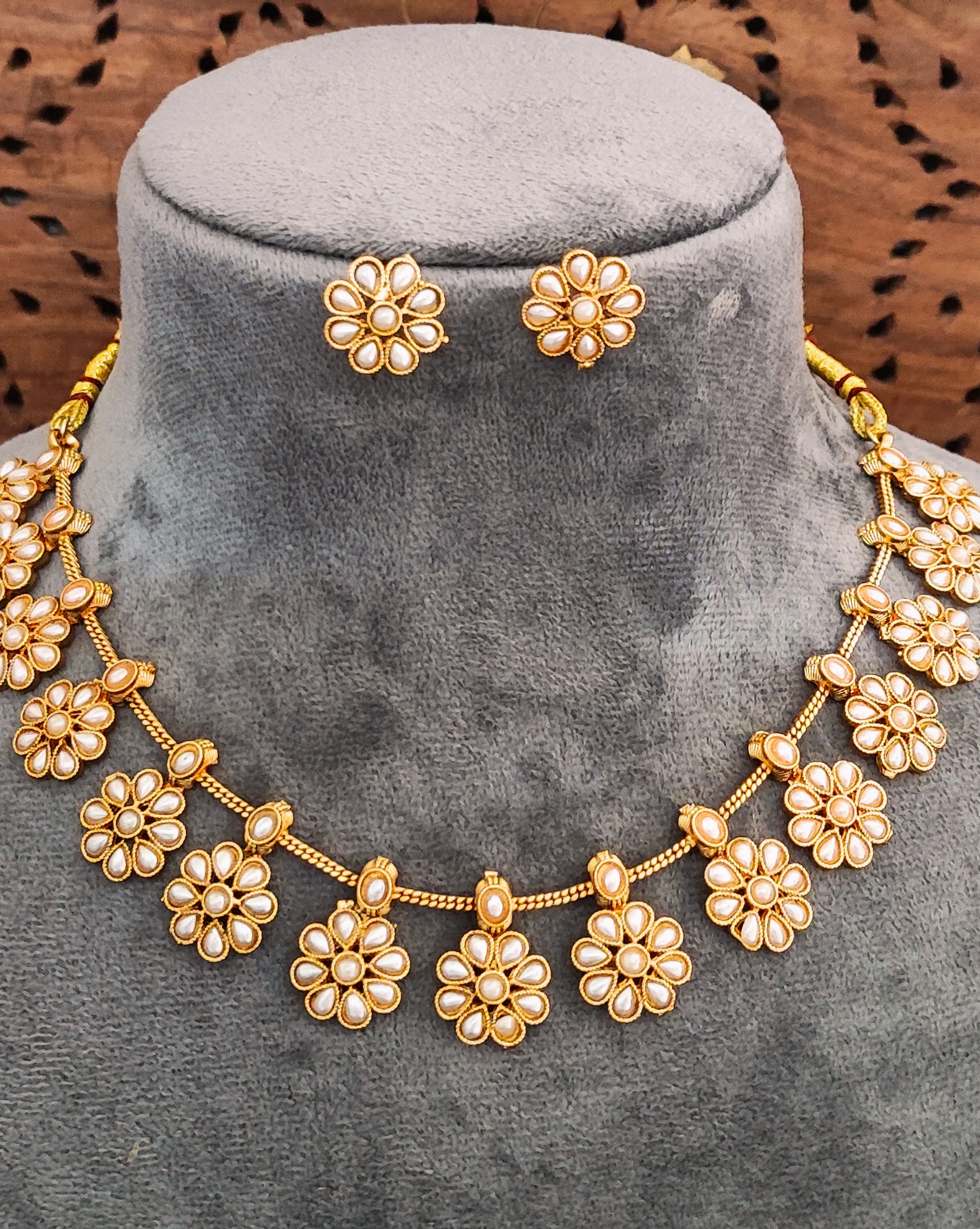 Pearl Flower Necklace Set with Earrings, Traditional Gold-Plated Floral Design, Indian Wedding Jewellery