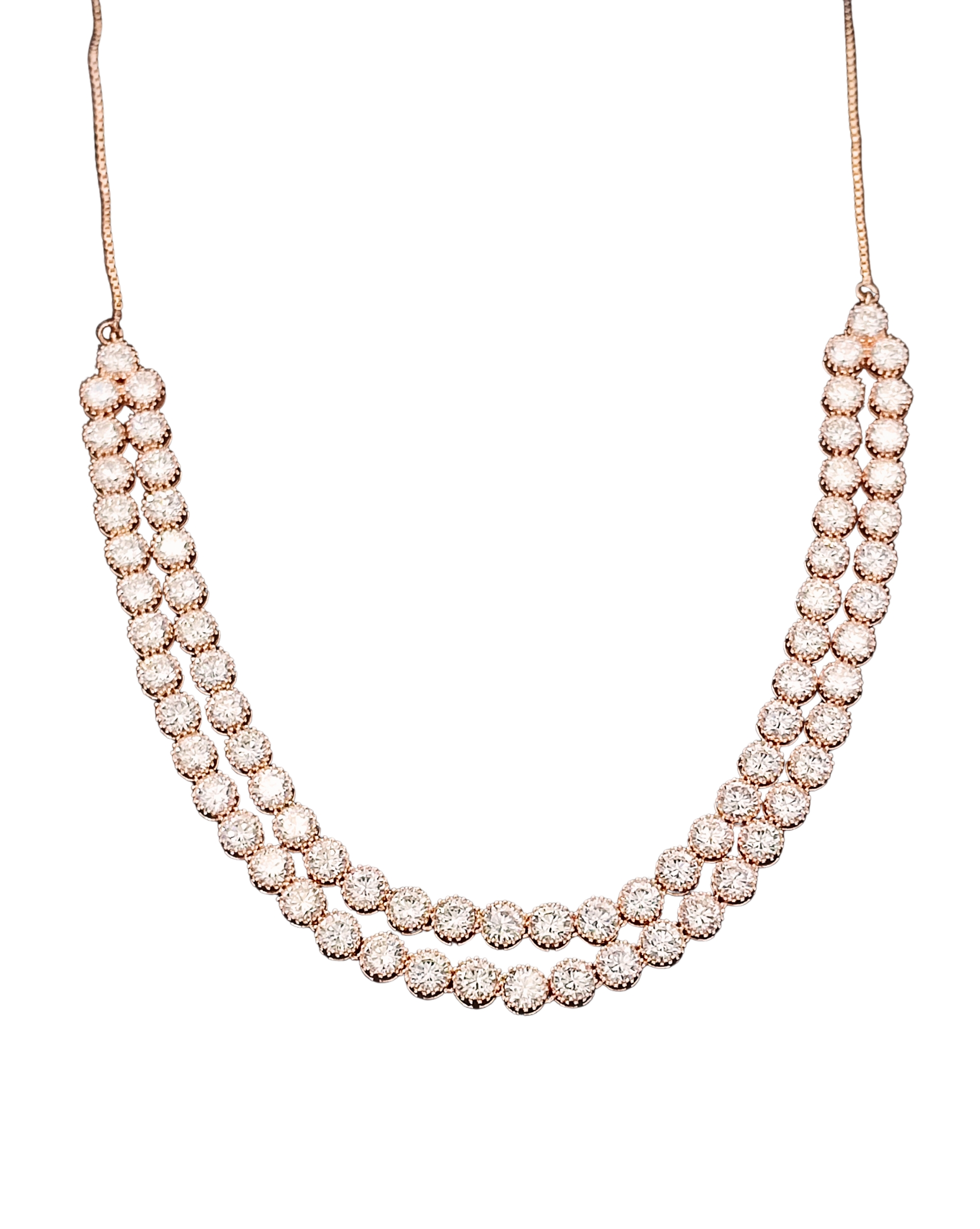 Charm meets sophistication in this rose gold-plated, double-line diamond necklace set. The soft blush hue of the plating beautifully complements the brilliance of the stones, giving a romantic and graceful finish. With its delicate craftsmanship and matching earrings, it’s perfect for festive events, cocktail parties, or gifting. The feminine tone adds a contemporary twist to traditional elegance, making it a versatile must-have.