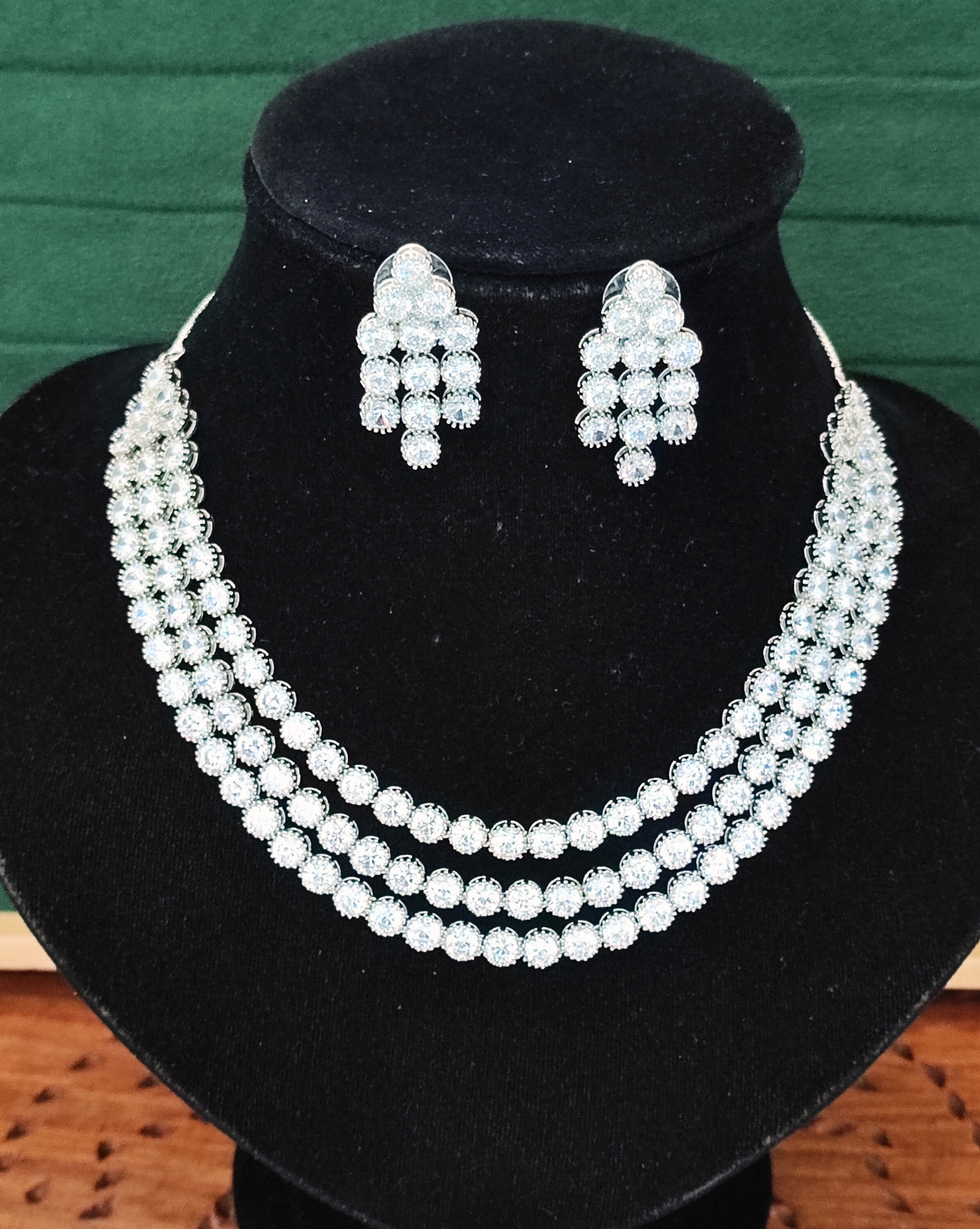 *Necklace measures 45 centimetres in length with graduated layers, accompanied by 4.5 centimetre drop earrings (approx values)
