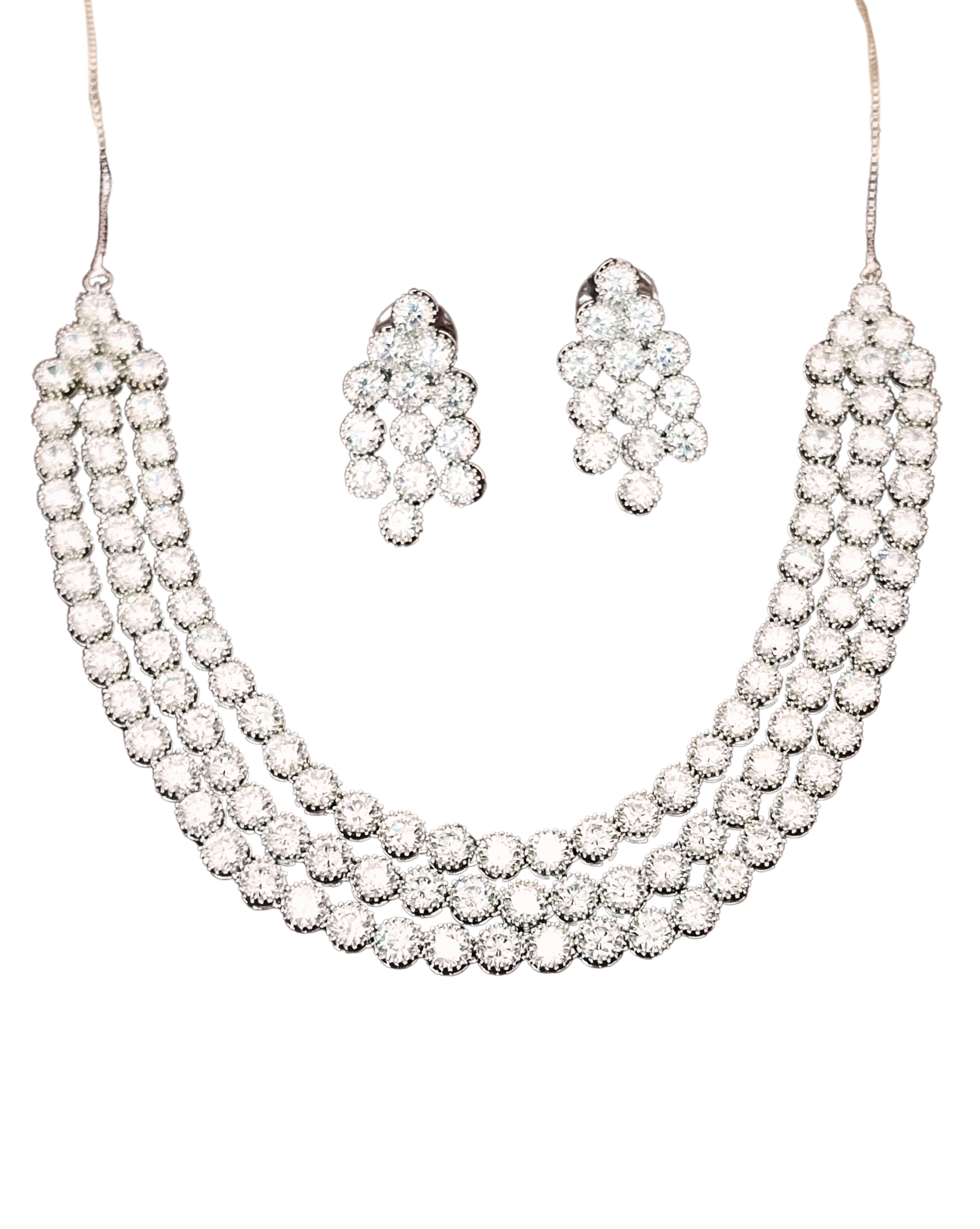 Silver Polish Crystal Beaded Necklace and Earring Set, Triple Strand Statement Jewellery for all Occasion