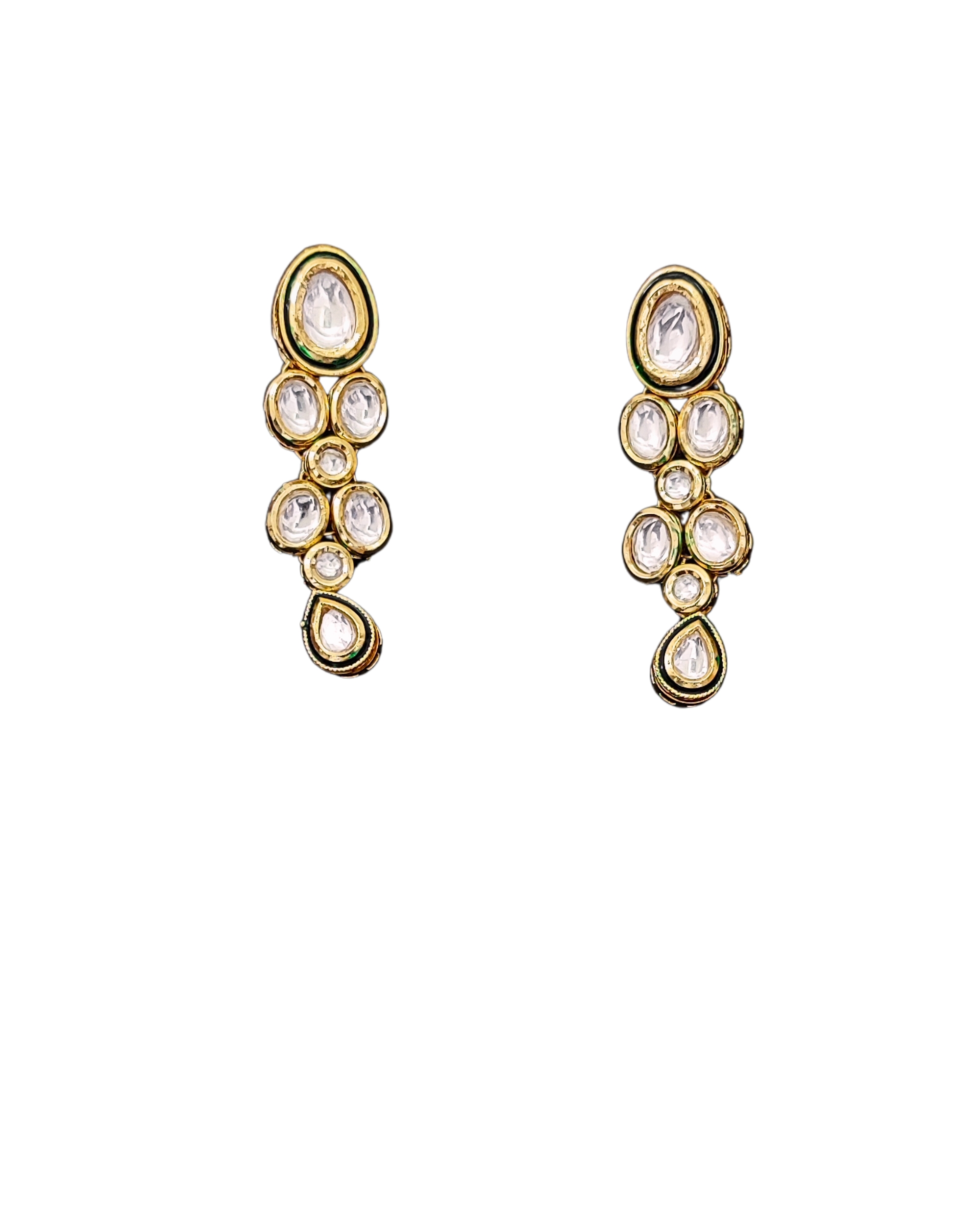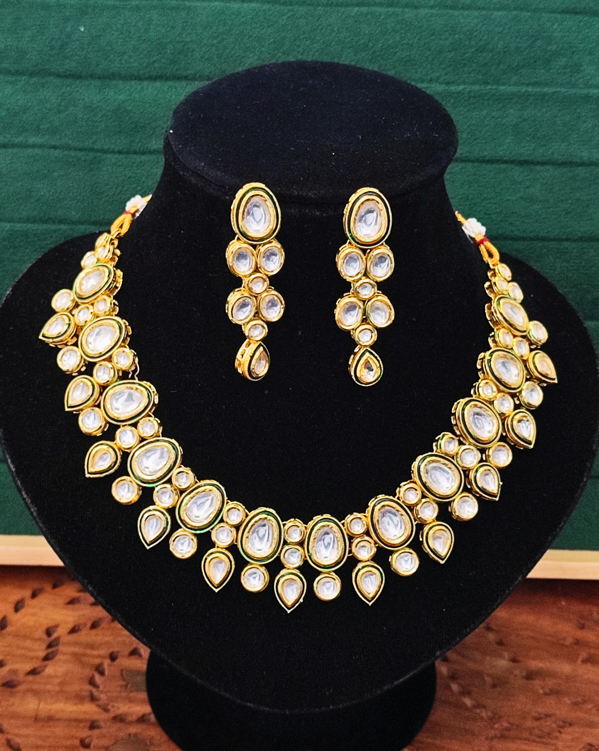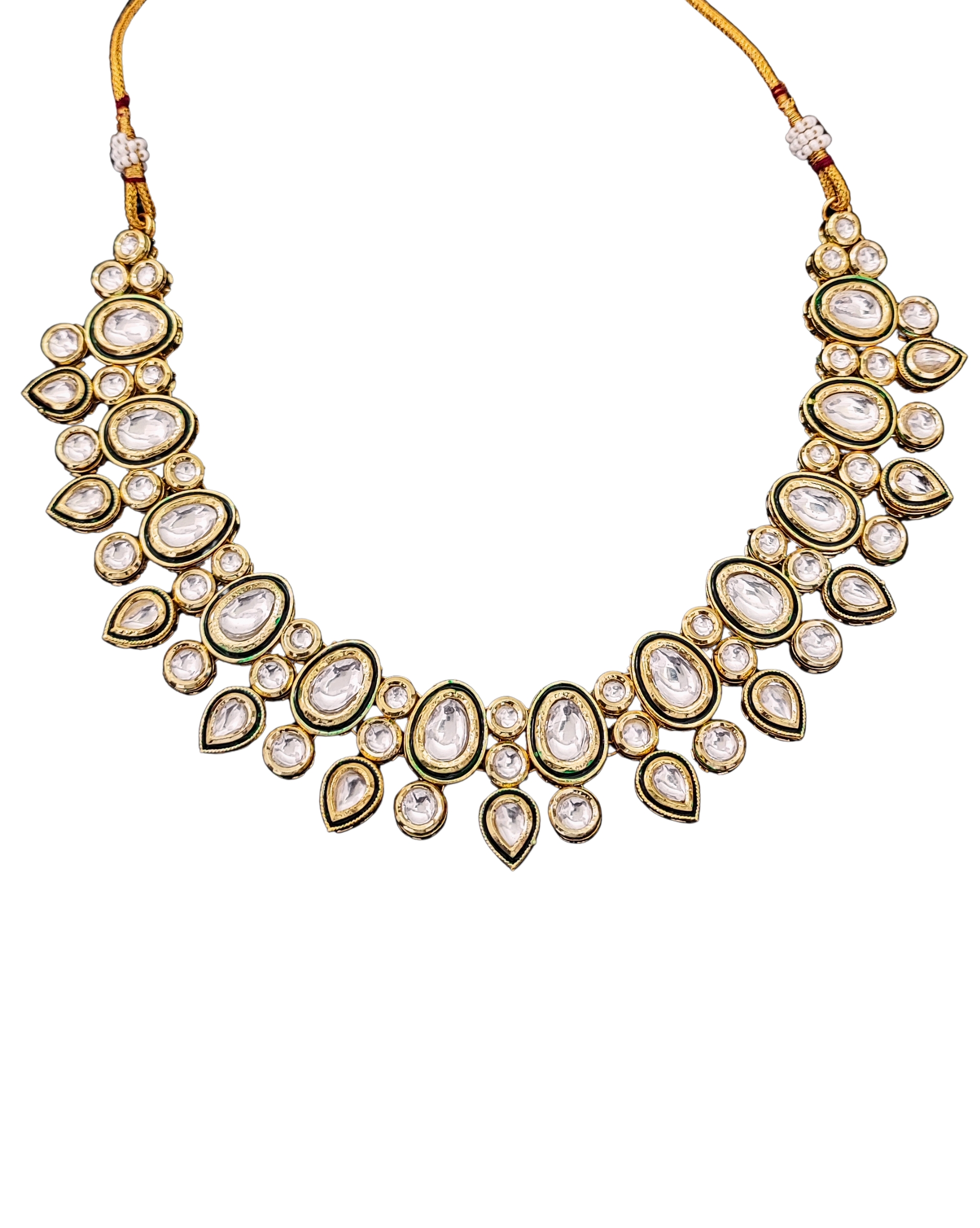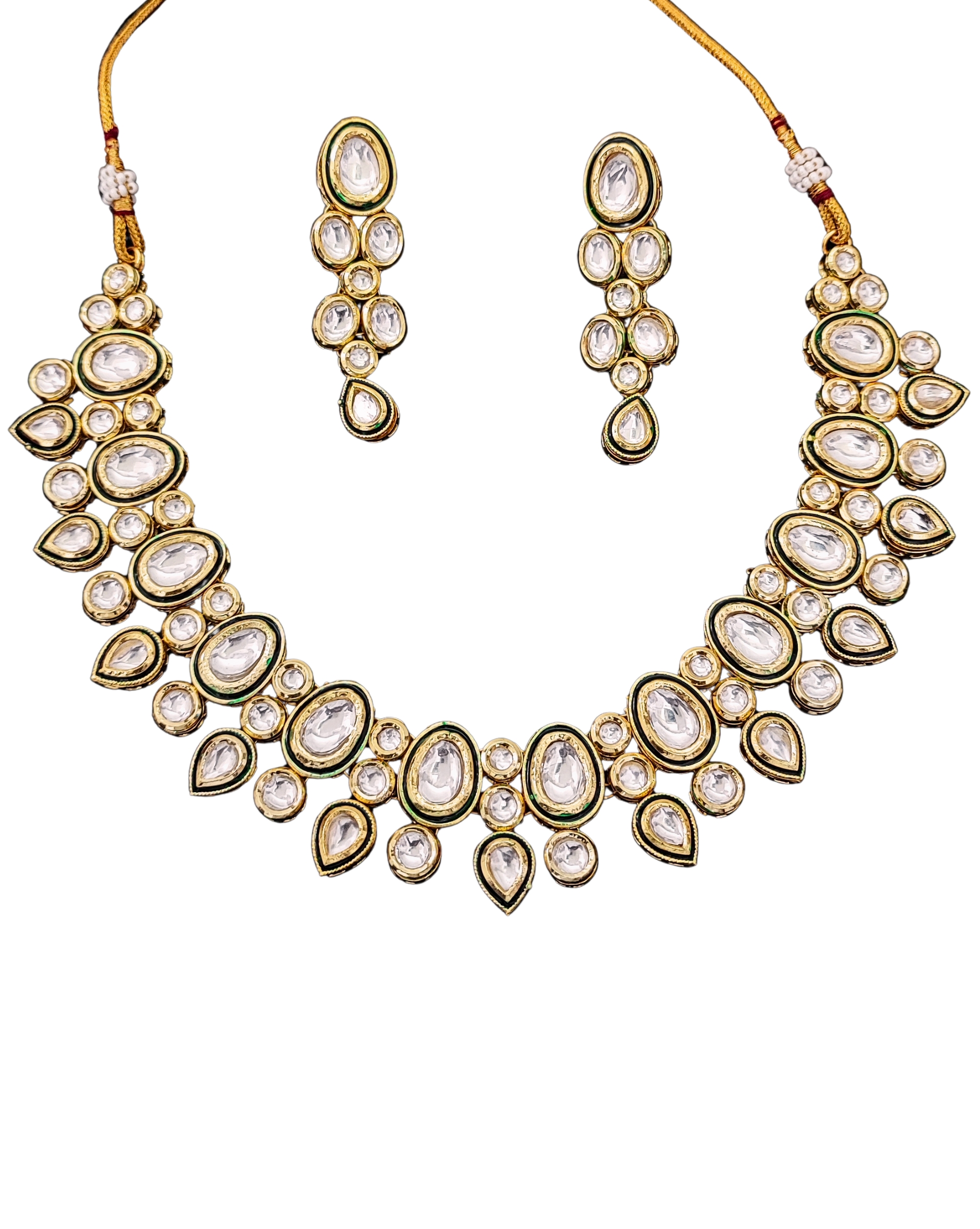Add royal elegance to your ethnic attire with this stunning Polki Kundan necklace set, crafted with a beautiful combination of oval and teardrop stones set in a lustrous gold-tone finish. The intricate detailing, paired with long, matching earrings, creates a regal and graceful look perfect for weddings, receptions, and festive events.