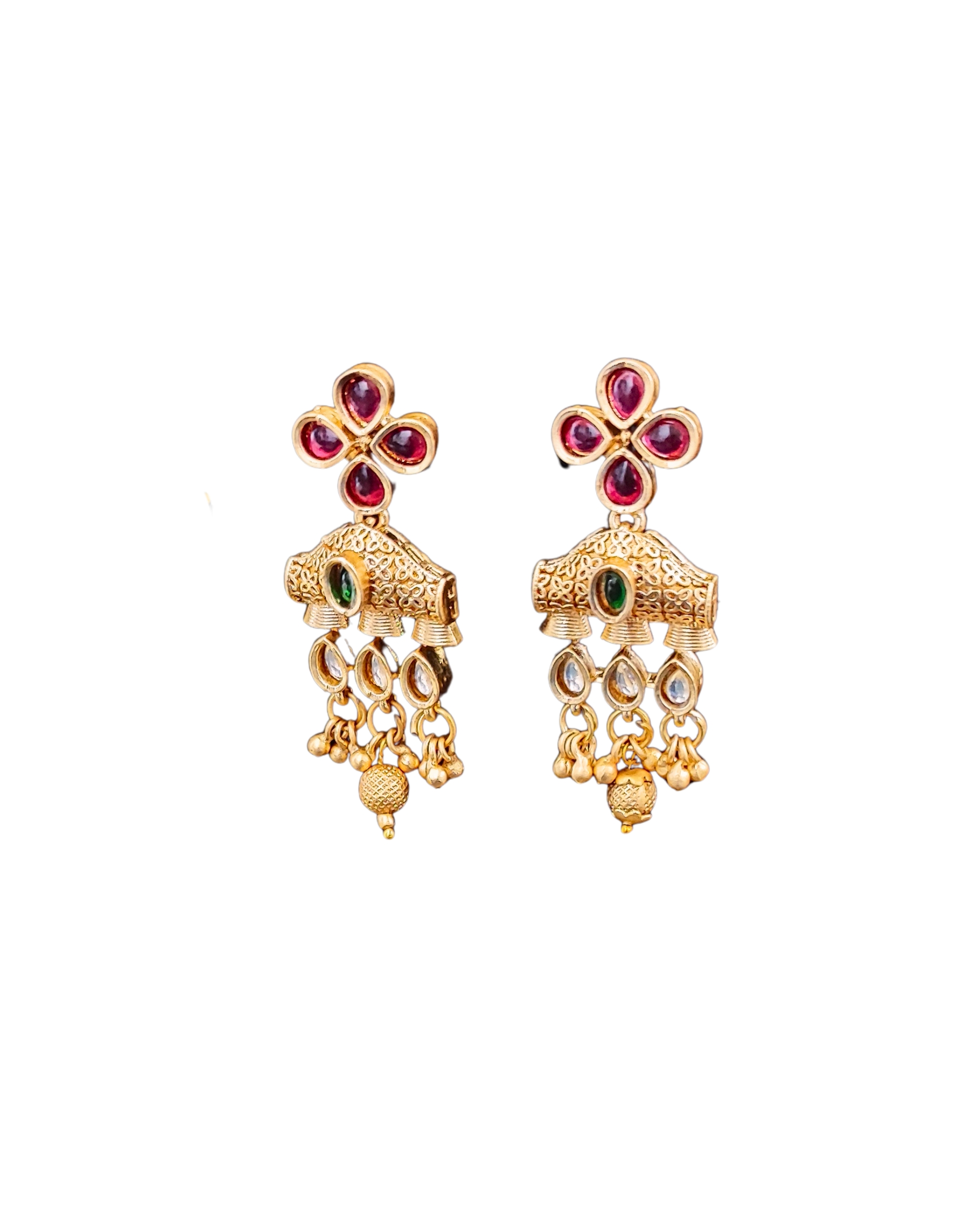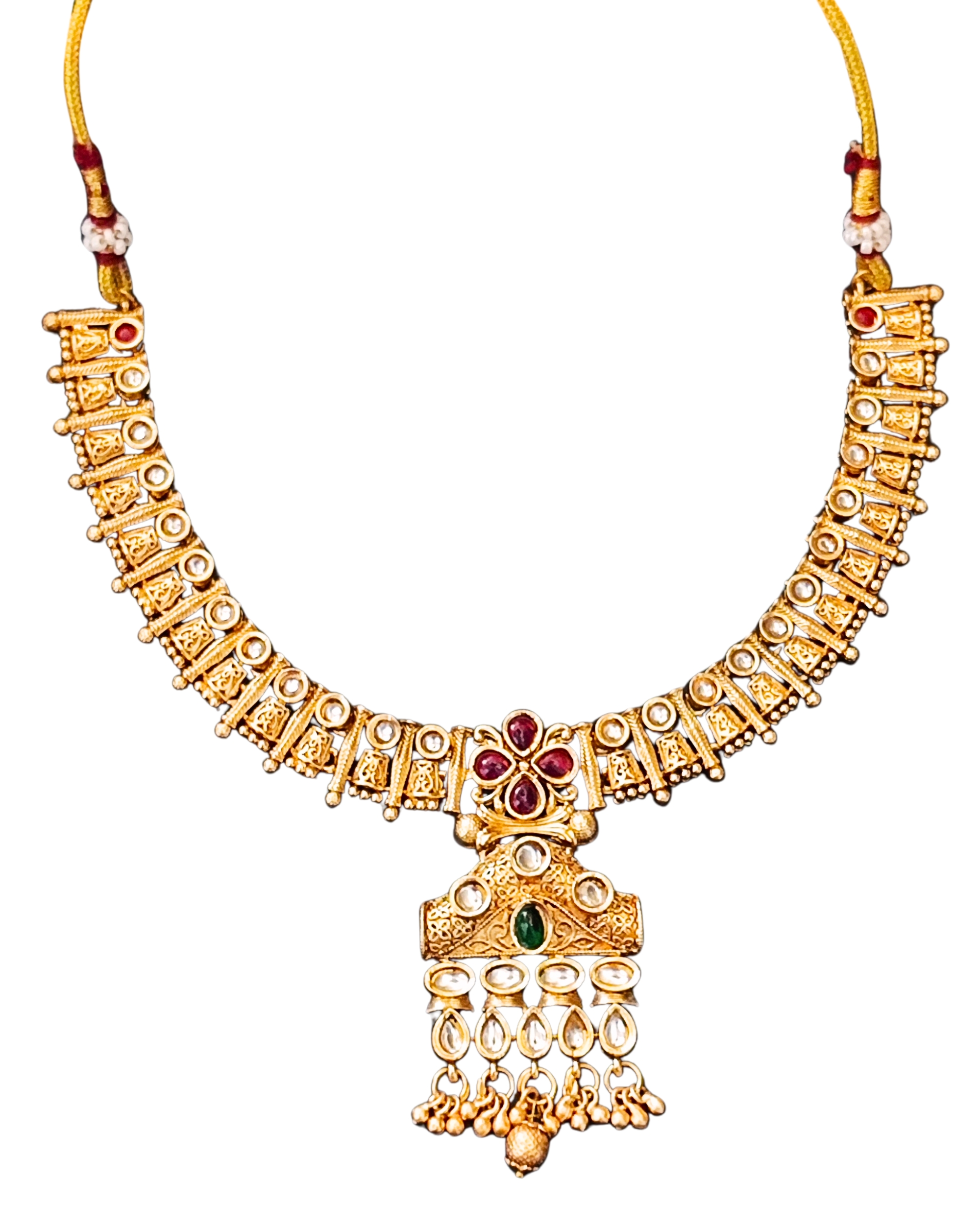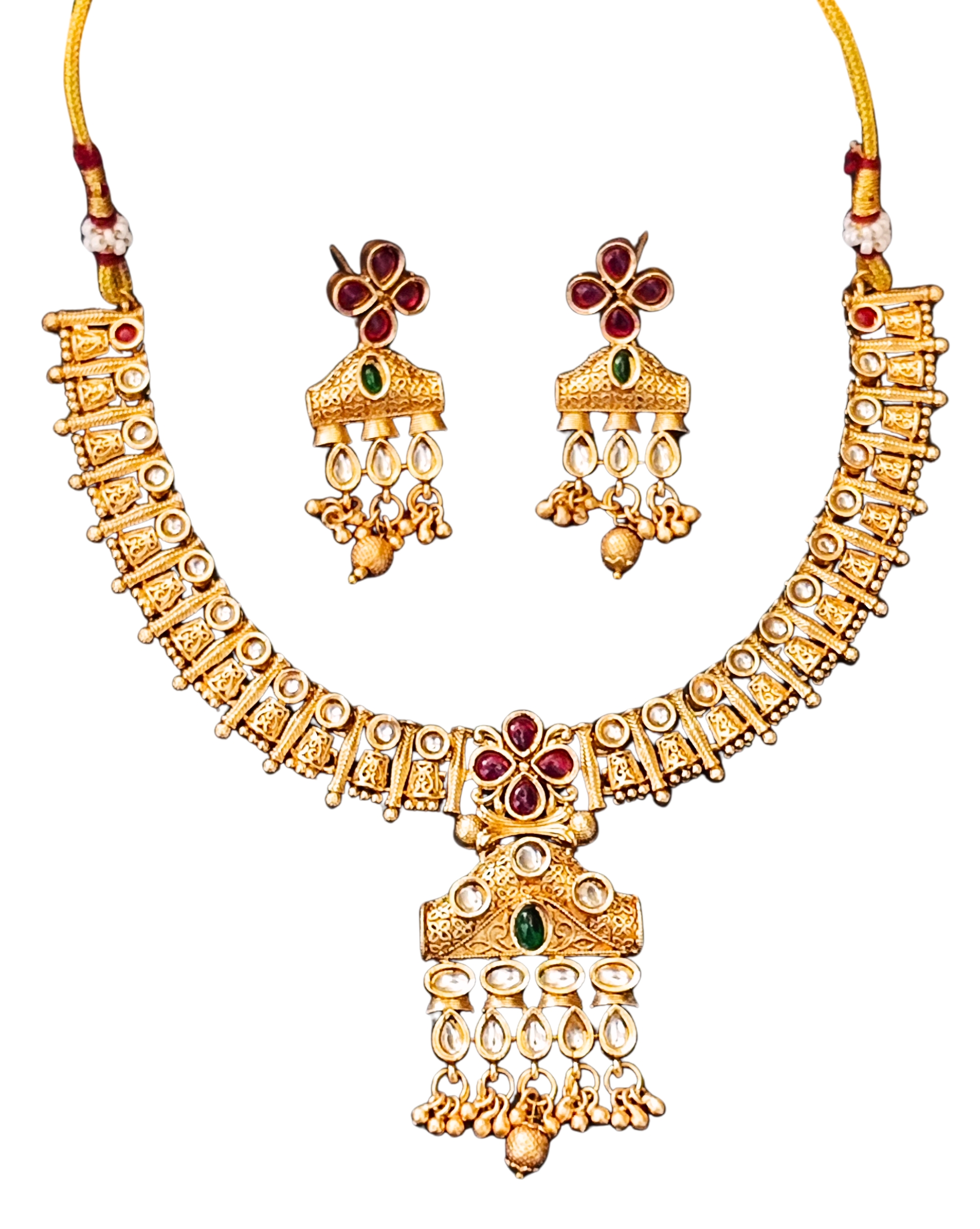 This intricately designed traditional necklace set features floral motifs with red and green stones and delicate hanging beads. The antique gold finish and bold craftsmanship make it perfect for festive occasions, weddings, or ethnic celebrations.