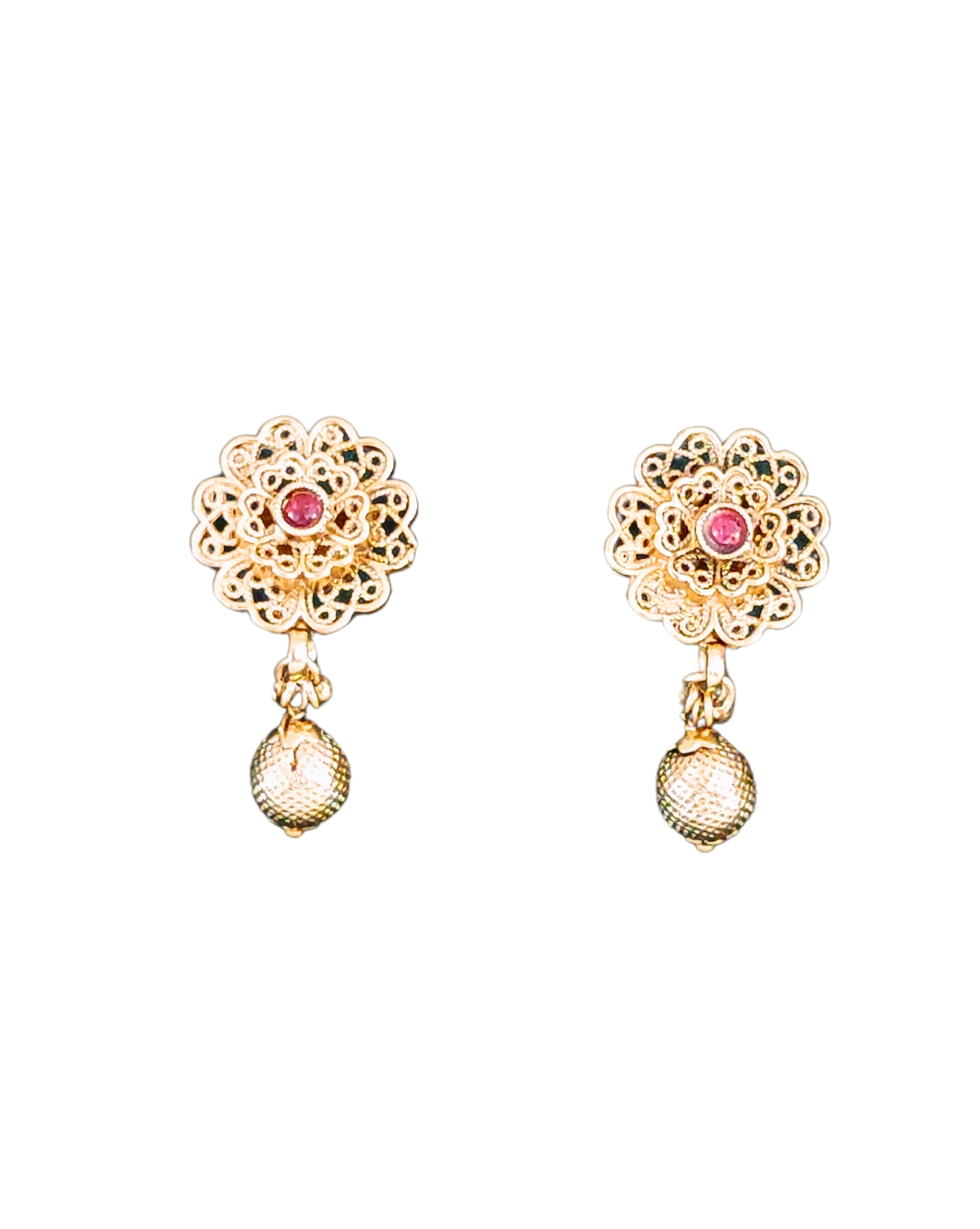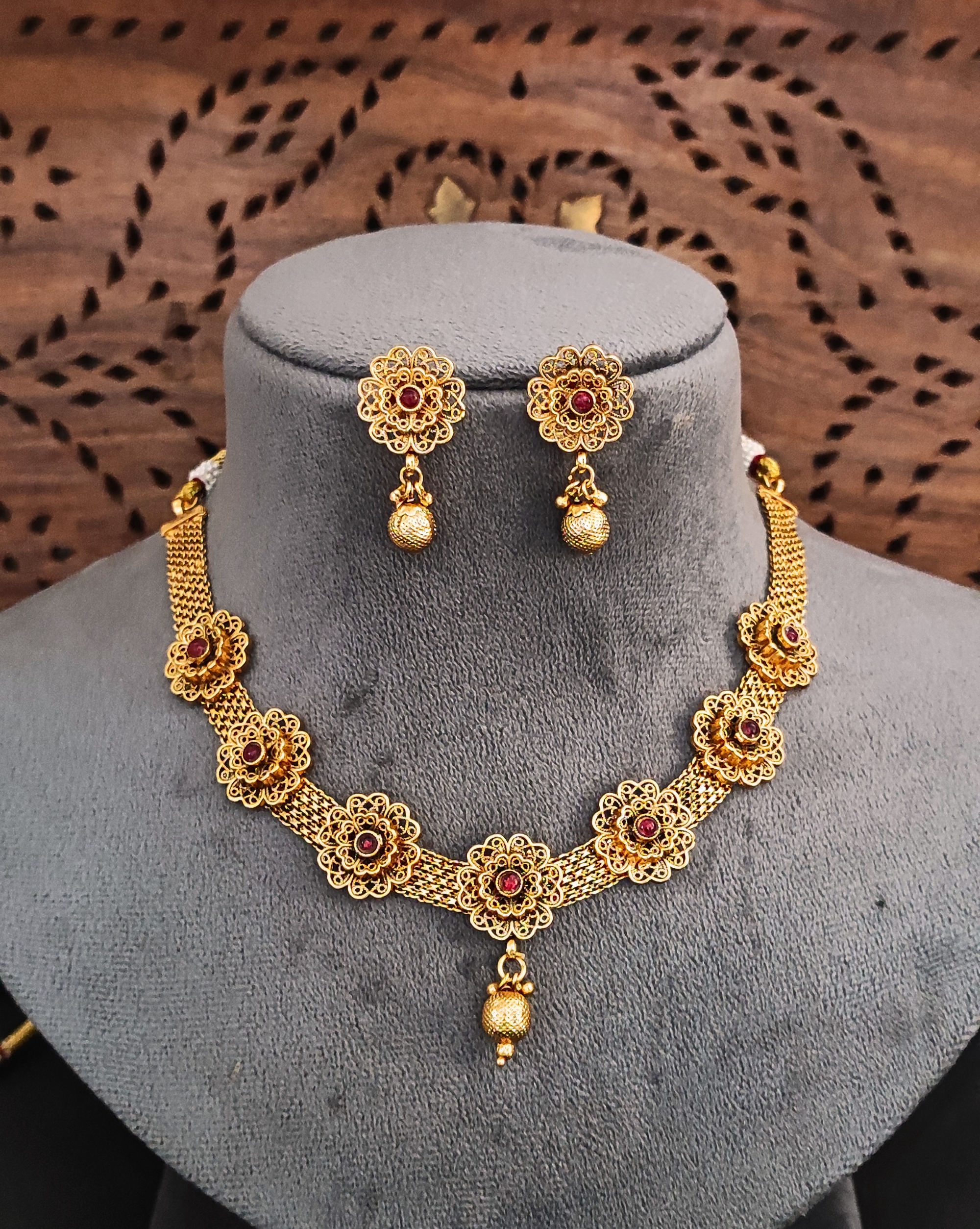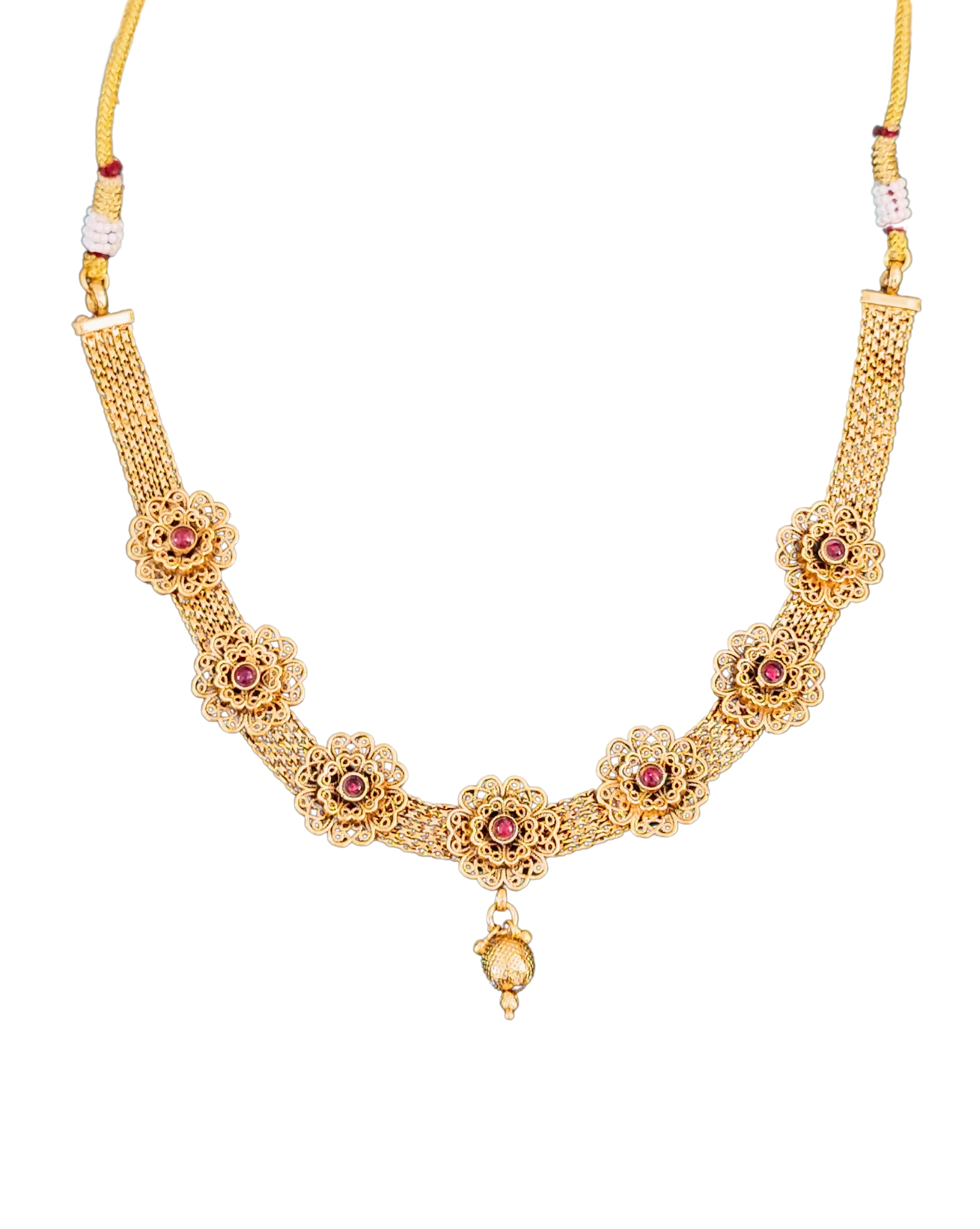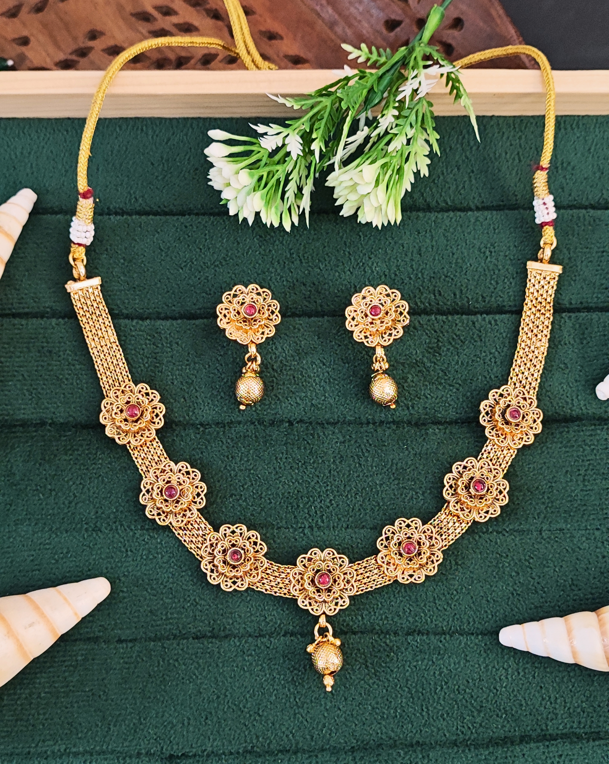 Elevate your traditional ensemble with this exquisite gold-plated necklace set featuring intricate floral designs. The necklace showcases a stunning mesh chain pattern adorned with beautifully crafted flower motifs, each centred with sparkling ruby-coloured stones. The delicate filigree work demonstrates exceptional craftsmanship, creating a luxurious vintage-inspired look. The matching drop earrings feature the same floral pattern with dangling spherical beads, completing the set with elegance. The necklace’s adjustable length and secure clasp ensure comfortable wear, while the lightweight design makes it perfect for both festive occasions and formal events. The set’s versatile style complements both traditional Indian attire and contemporary fusion wear. The gold plating provides a rich, lasting finish that maintains its lustre. This jewellery set arrives in a protective case, making it an ideal choice for gifting or adding to your personal collection.