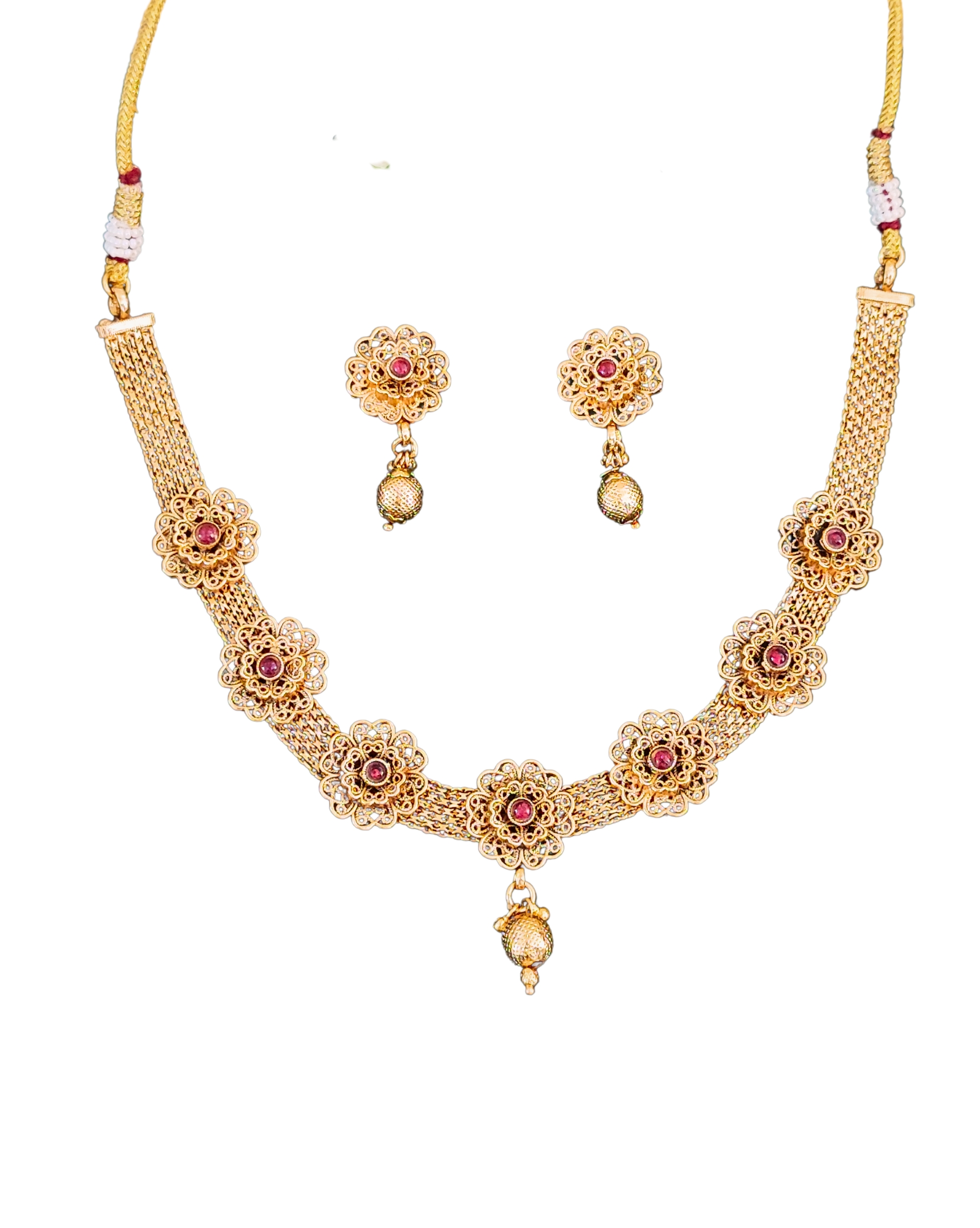 Traditional Gold-Plated Floral Necklace Set with Ruby Stones, Mesh Chain Design, Drop Earrings